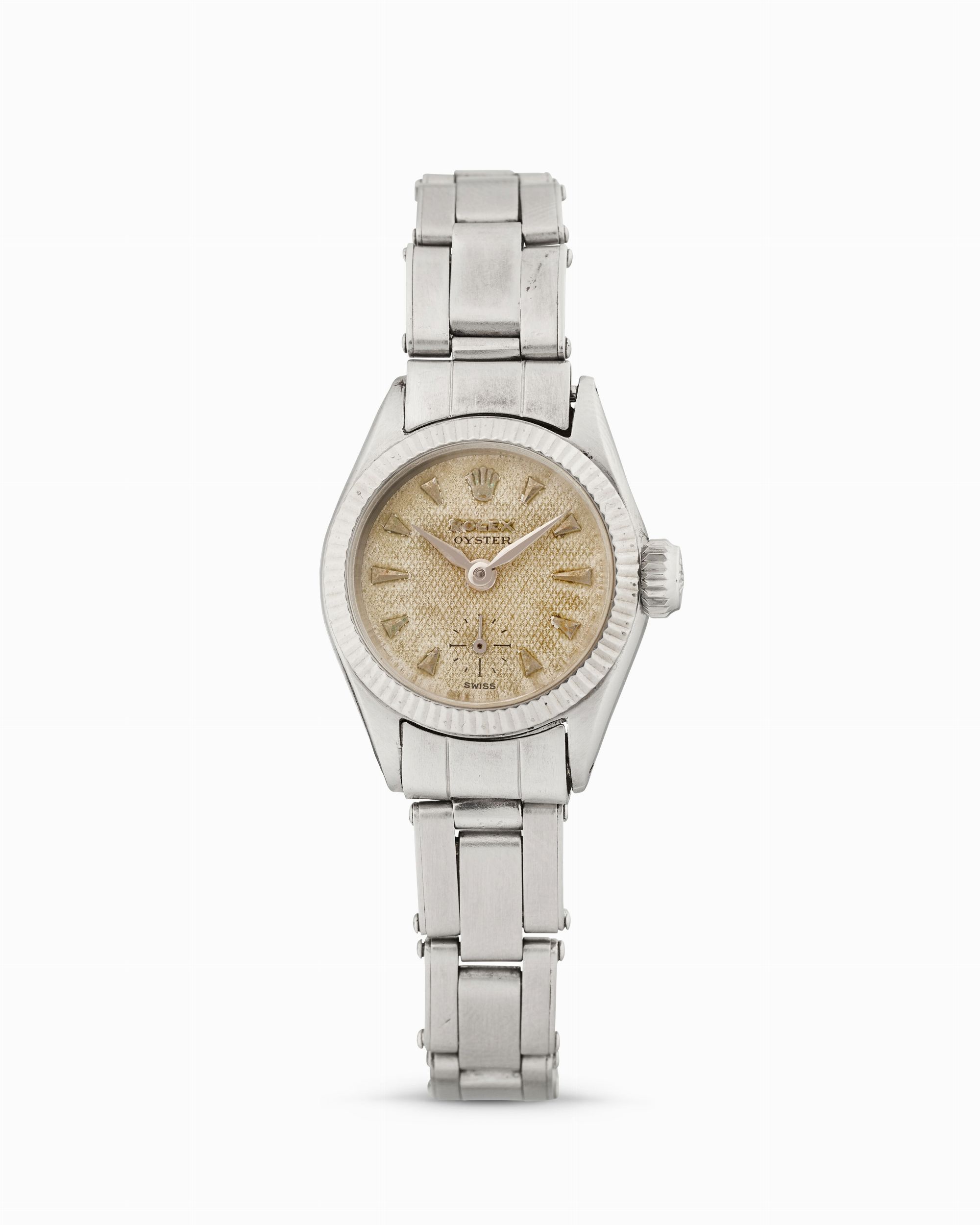 anni 50 Cassa rotonda in acciaio, n.16290, lunetta zigrinata in oro bianco 18k. Quadrante color crema con finitura a nido d'ape, indici applicati. Movimento a carica manuale. Bracciale Oyster in acciaio a maglie rivettate. Dimensioni: 21 mm.