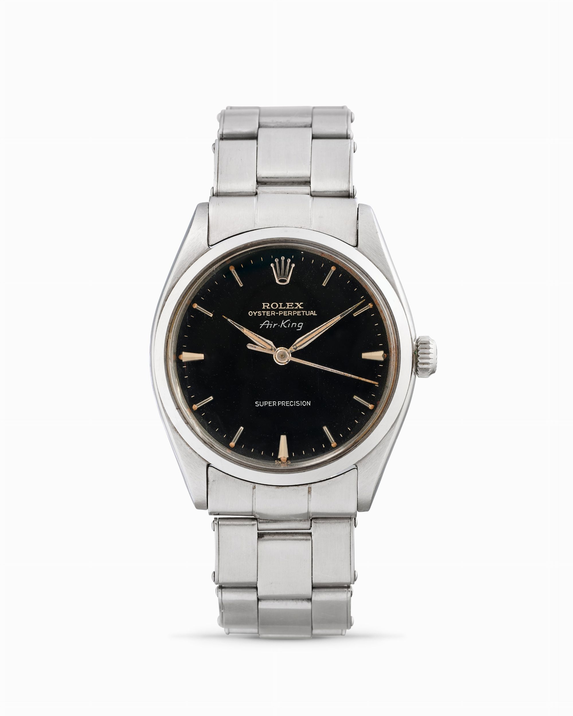 anni 60 Cassa rotonda in acciaio, n.846133, lunetta liscia in acciaio. Quadrante nero lucido, indici applicati. Movimento a carica automatica, cal.1530. Bracciale Oyster in acciaio a maglie rivettate. Dimensioni: 34 mm.