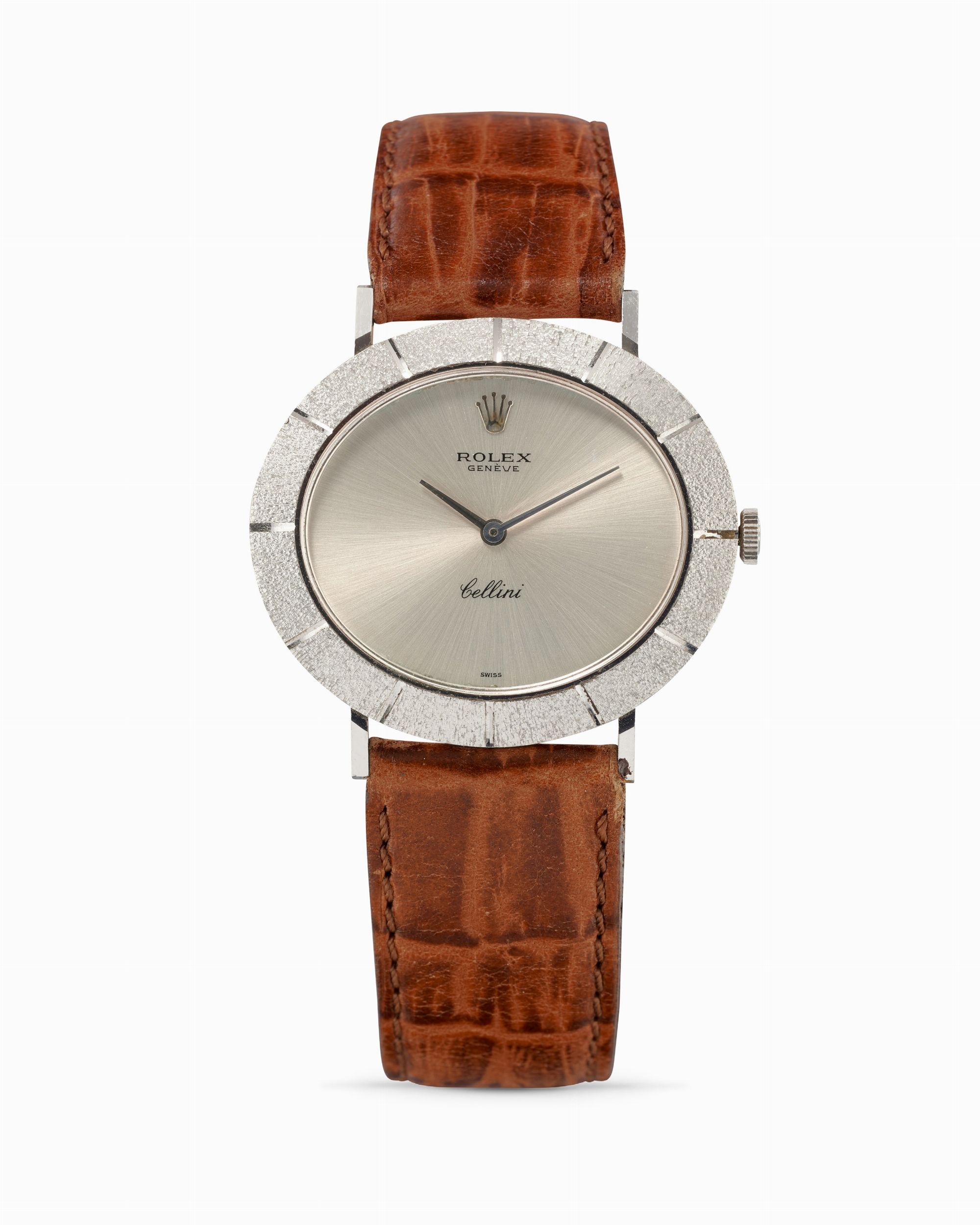 anni 70 Cassa ellittica in oro bianco 18k con finitura a corteccia, n.2515633. Quadrante argenté. Movimento a carica manuale, cal.1600. Cinturino in pelle. Dimensioni: 29 x 33 mm.