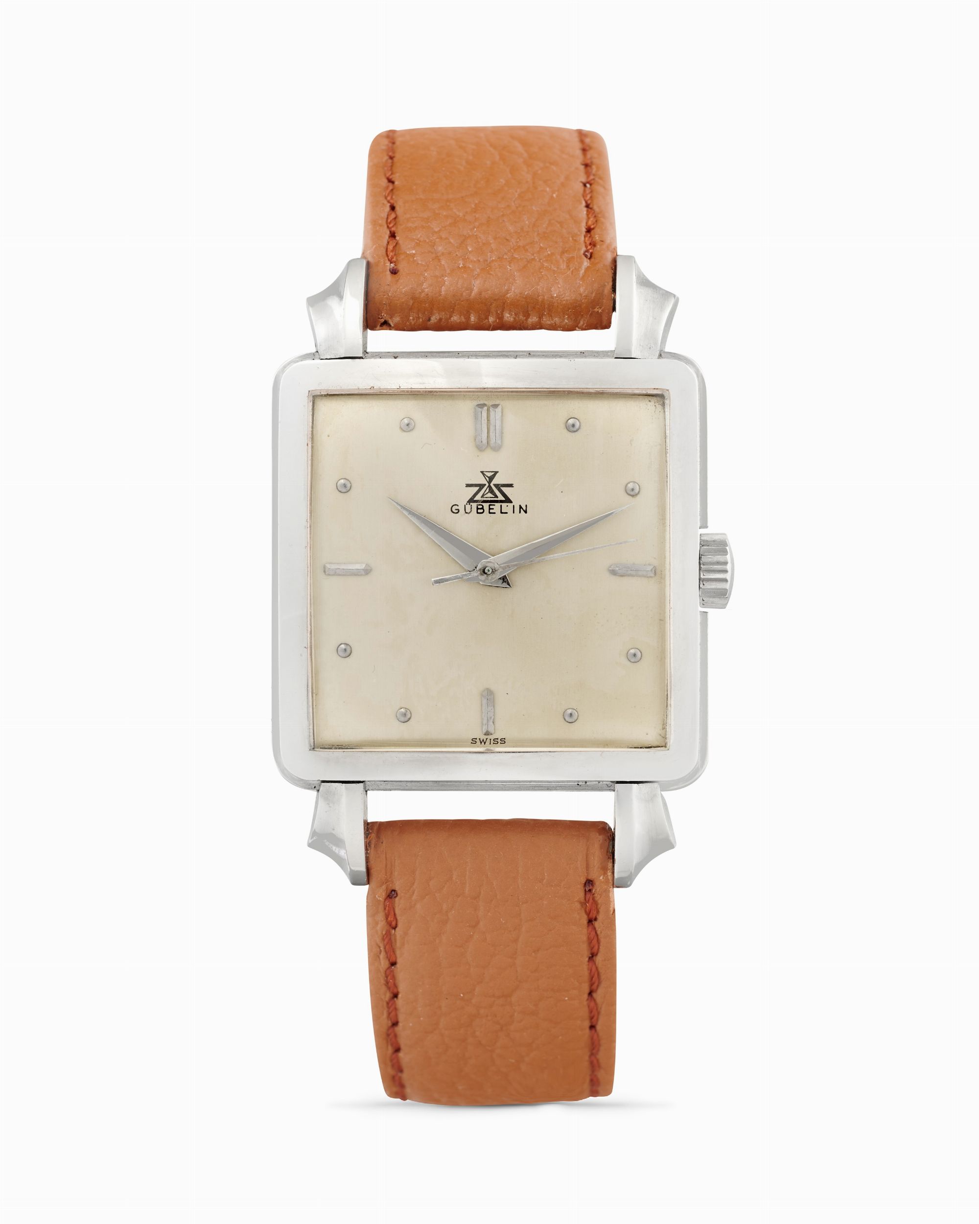 anni 50 Cassa quadrata in acciaio, n.126223, anse di forma. Quadrante argenté, indici applicati. Movimento a carica manuale. Cinturino in pelle. Dimensioni: 32 x 32 mm.