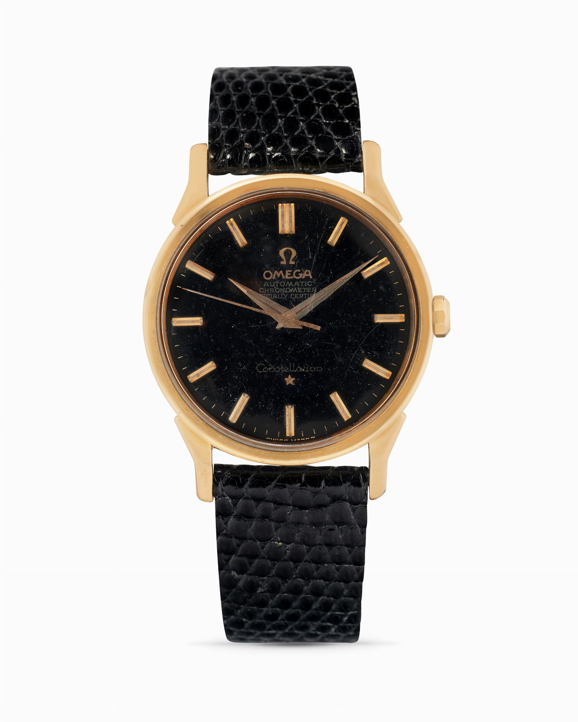 anni 60 Cassa rotonda in acciaio placcato oro, fondello a vite con medaglione planetario, anse di forma. Quadrante nero, indici applicati. Movimento a carica automatica, cal.551, n.24419358. Cinturino in pelle e fibbia Omega placcata oro. Dimensioni: 34 mm.