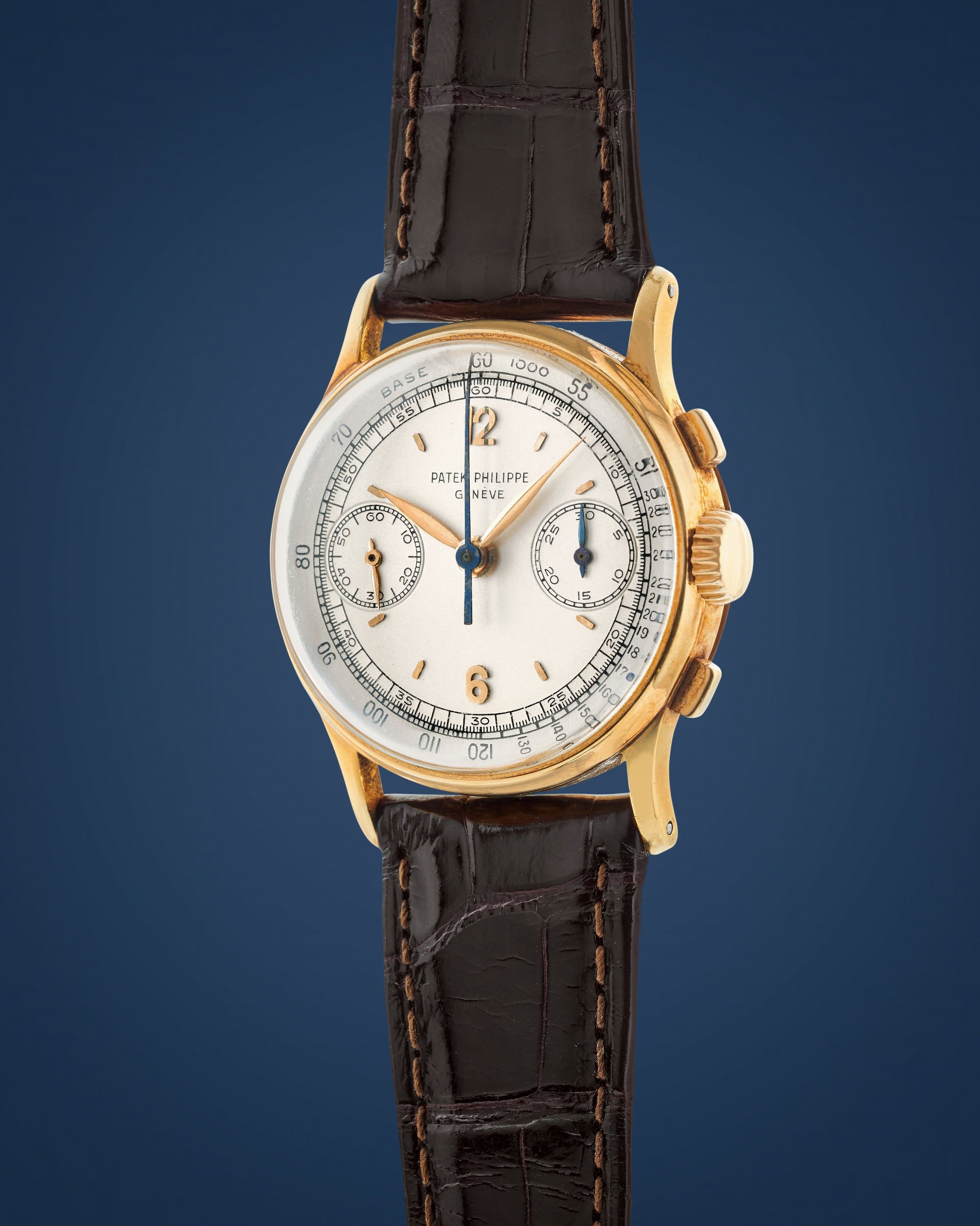 anni 50 Cassa rotonda in oro 18k, n.672246, pulsanti rettangolari. Quadrante argenté a due toni, indici e numeri arabi applicati. Movimento a carica manuale, cal.13''', n.868514. Cinturino in pelle e fibbia Patek Philippe in oro. Dimensioni: 33 mm. Accompagnato da estratto d'archivio Patek Philippe.