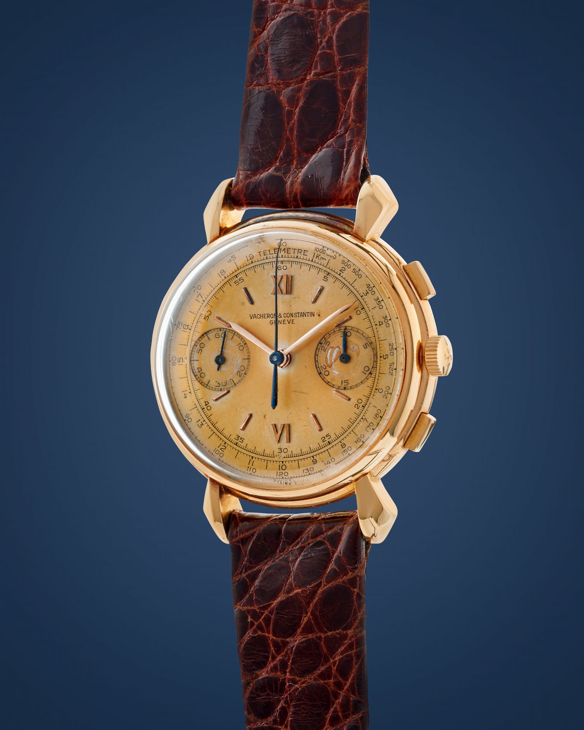 anni 40 Cassa rotonda in oro rosa 18k, n.303370, pulsanti rettangolari, anse a goccia. Quadrante color crema a due toni, indici e numeri romani applicati. Movimento a carica manuale, cal.V492, n.466464. Cinturino Vacheron Constantin in pelle e fibbia Vacheron Constantin in oro rosa. Dimensioni: 36 mm. Accompagnato da estratto d'archivio Vacheron Constantin.