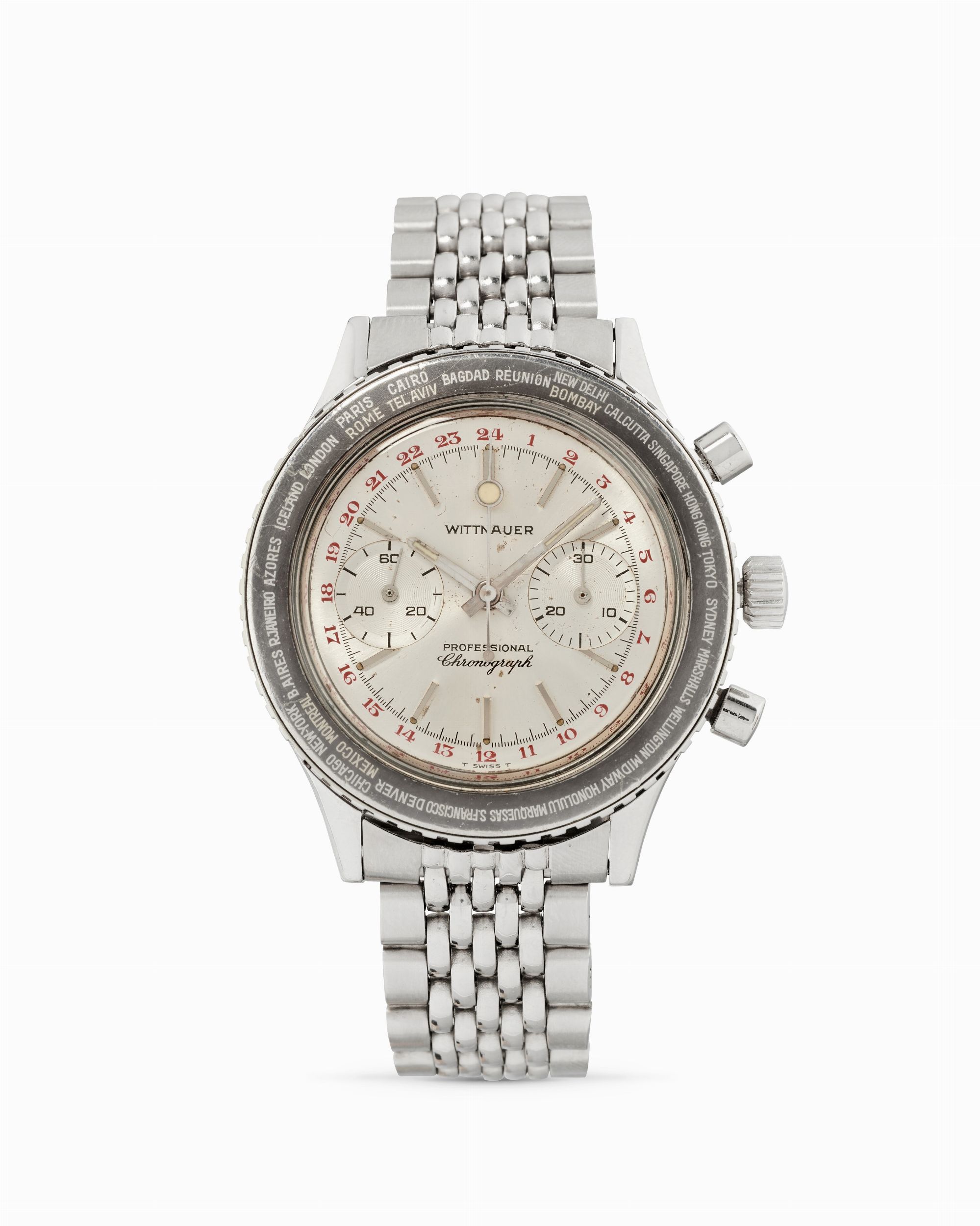 anni 60 Cassa rotonda e ghiera girevole in acciaio, lunetta nera in alluminio con i nomi delle città , fondello a vite, pulsanti tondi. Quadrante argenté, indici applicati e numeri arabi dipinti. Movimento a carica manuale. Bracciale a chicchi di riso in acciaio a maglie ripiegate. Dimensioni: 40 mm.