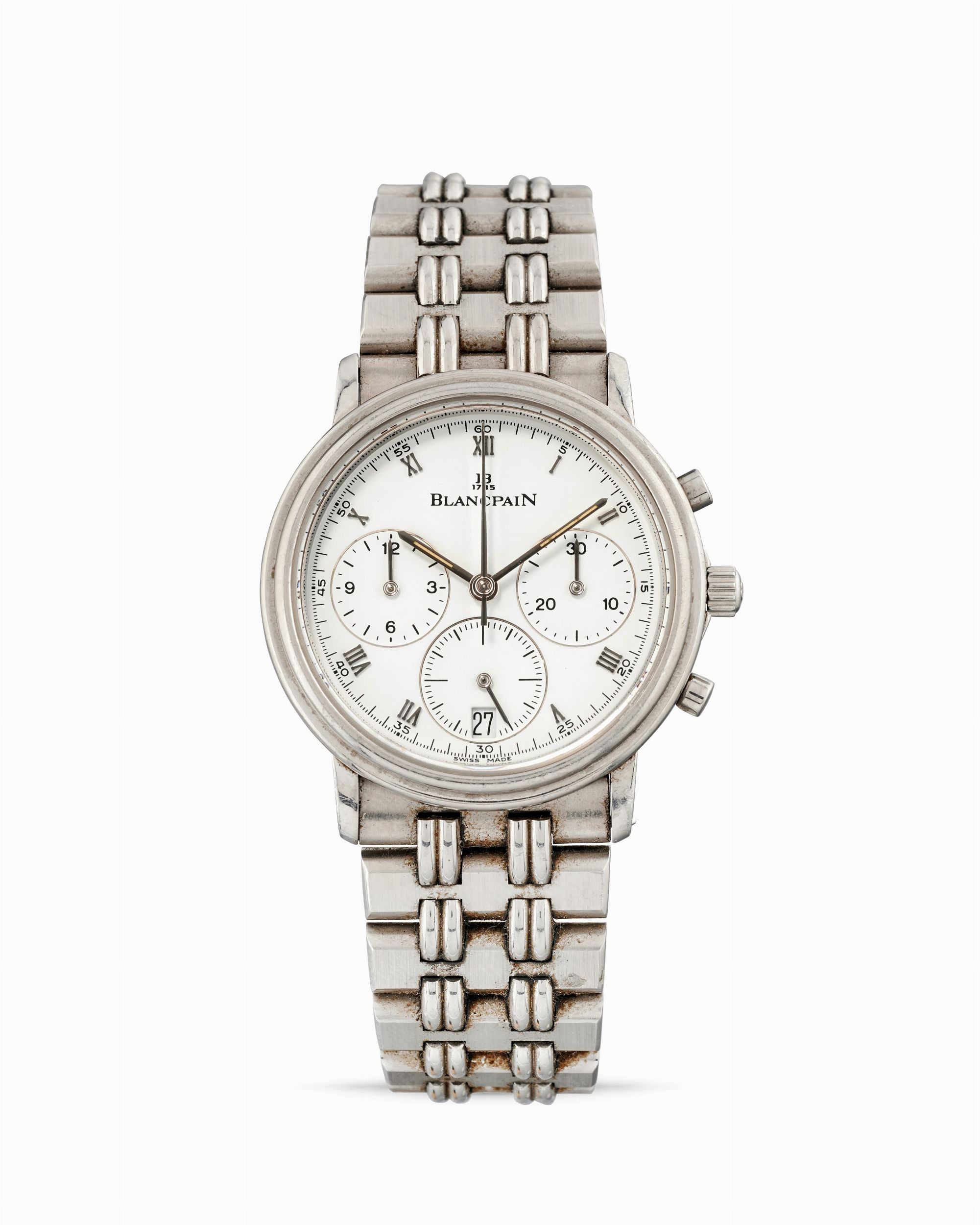 anni 90 Cassa rotonda in acciaio, n.136, lunetta a gradini, pulsanti tondi. Quadrante bianco, numeri romani applicati. Movimento a carica automatica, cal.1185. Bracciale Blancpain in acciaio. Dimensioni: 34 mm.