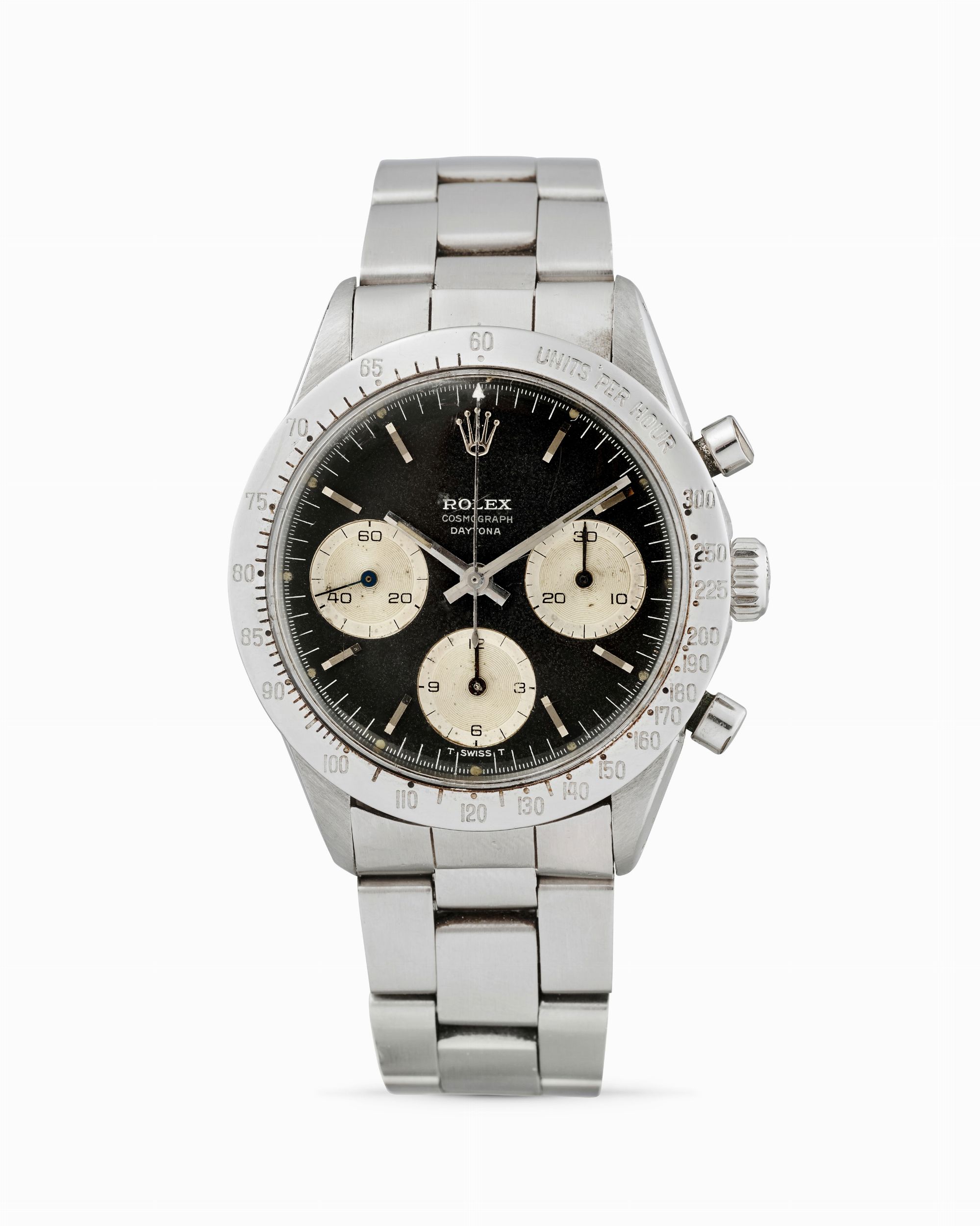anni 70 Cassa rotonda in acciaio, n.2416824, lunetta in acciaio, pulsanti tondi. Quadrante nero, contatori argenté, indici applicati. Movimento a carica manuale, cal.72B. Bracciale Oyster 78350 in acciaio. Dimensioni: 37 mm.
