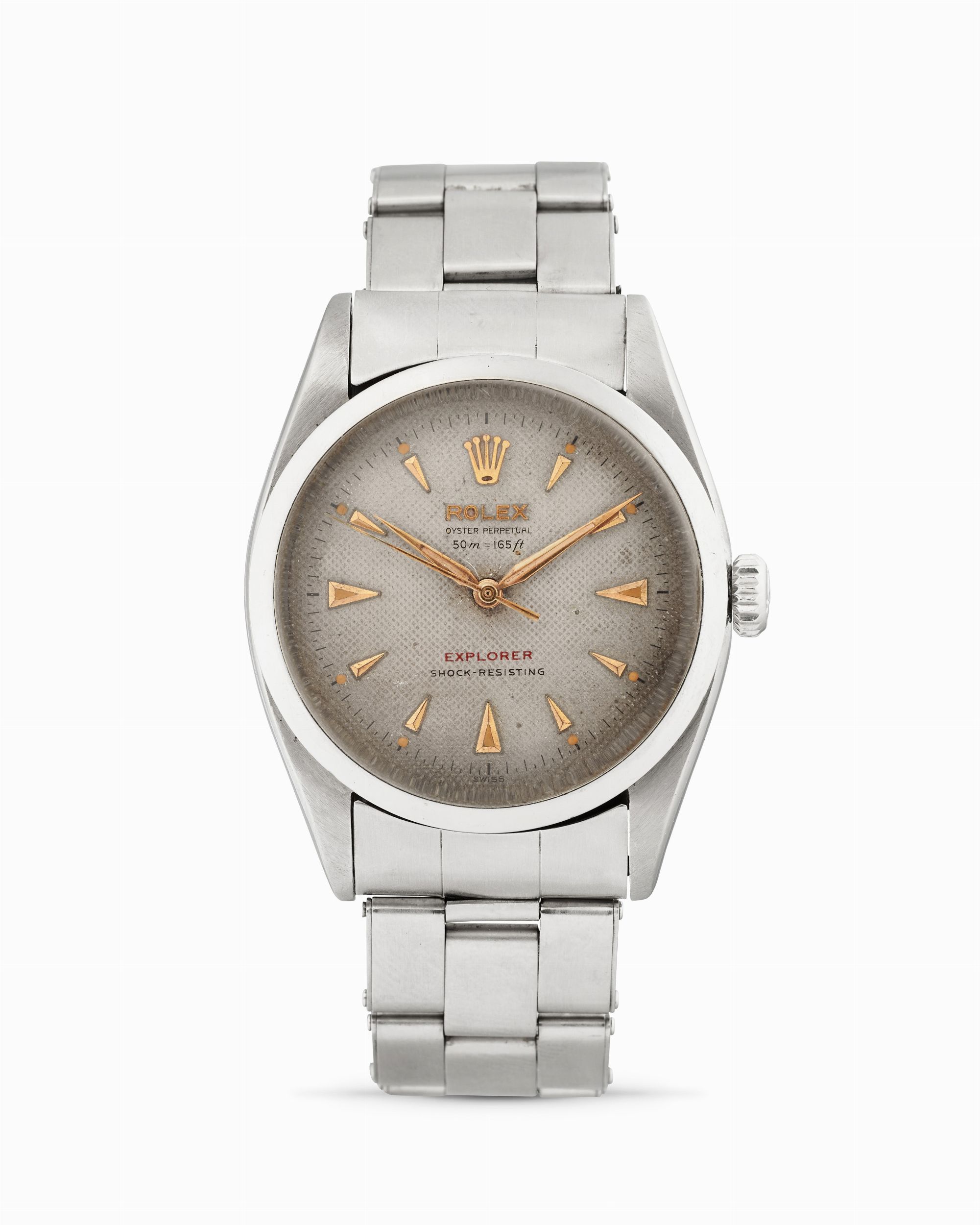 anni 50 Cassa rotonda in acciaio, n.973932, lunetta liscia in acciaio. Quadrante color crema con finitura a nido d'ape, scritta Explorer rossa, indici applicati. Movimento a carica automatica, cal.A296. Bracciale Oyster in acciaio a maglie rivettate realizzato per il mercato americano. Dimensioni: 36 mm.