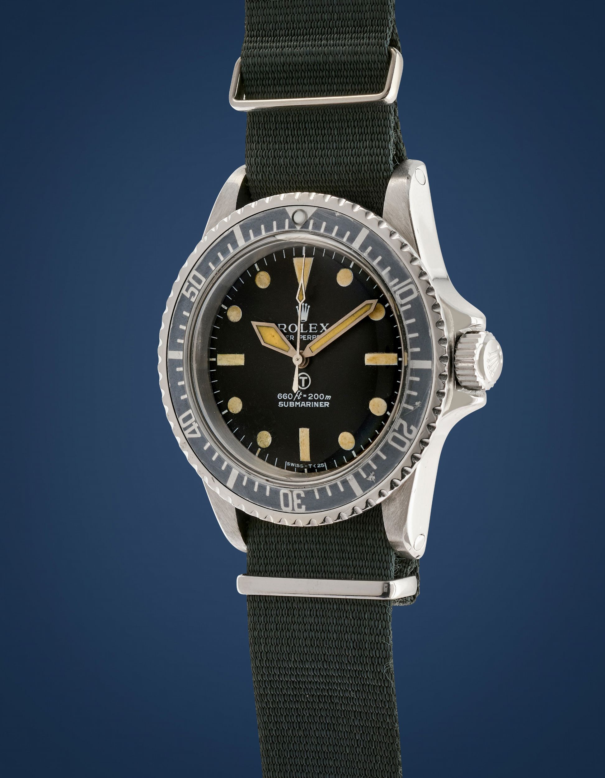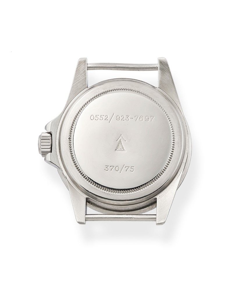 anni 70 Cassa rotonda in acciaio, n.3927201, barrette fisse, ghiera girevole in acciaio, lunetta nera virata al blu in alluminio, fondello inciso con Broad Arrow e assegnazione '0552/923-7697, 370/75', seriale riportato all'interno. Quadrante nero, indici luminescenti, 'T' inscritta, sfere a spada. Movimento a carica automatica, cal.1520. Cinturino Phoenix in tessuto. Dimensioni: 40 mm. Accompagnato da ricevuta service Rolex.