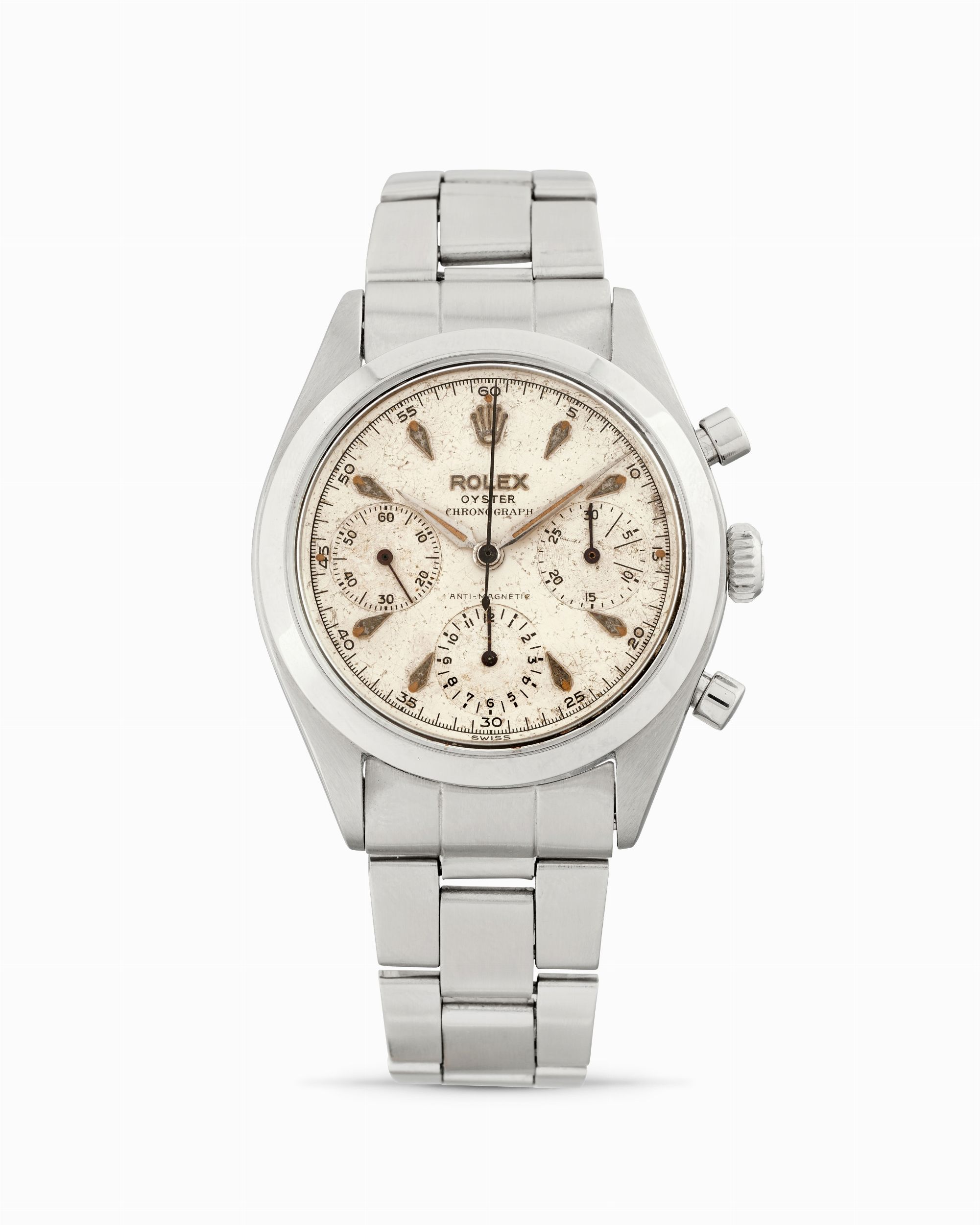 anni 60 Cassa rotonda in acciaio, n.974211, pulsanti tondi. Quadrante color crema, indici applicati. Movimento a carica manuale, cal.Valjoux 72. Bracciale Oyster 7835 in acciaio a maglie ripiegate. Dimensioni: 36 mm.