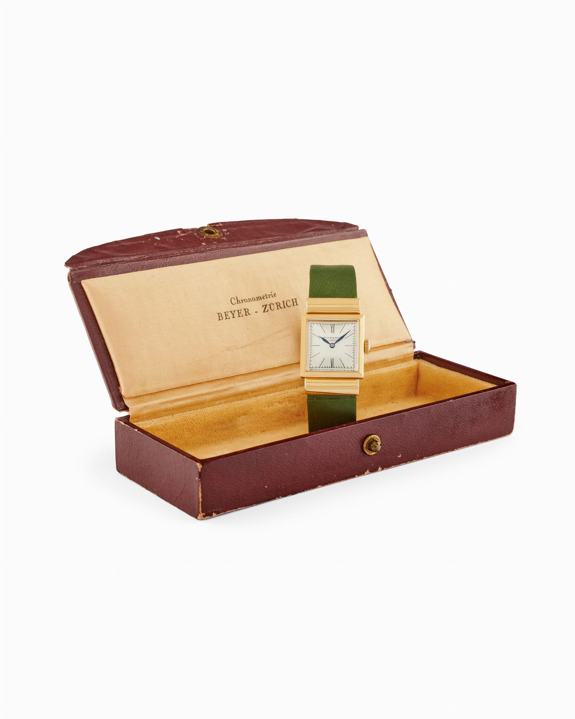 anni 30 Cassa quadrata in oro 18k, n.504407, anse incappucciate. Quadrante argenté, indici e numeri romani dipinti. Movimento a carica manuale, cal.8'''85, n.850227. Cinturino in satin e fibbia Patek Philippe in oro. Dimensioni: 33 x 21 mm. Accompagnato da estratto d'archivio Patek Philippe e scatola d'epoca Beyer.