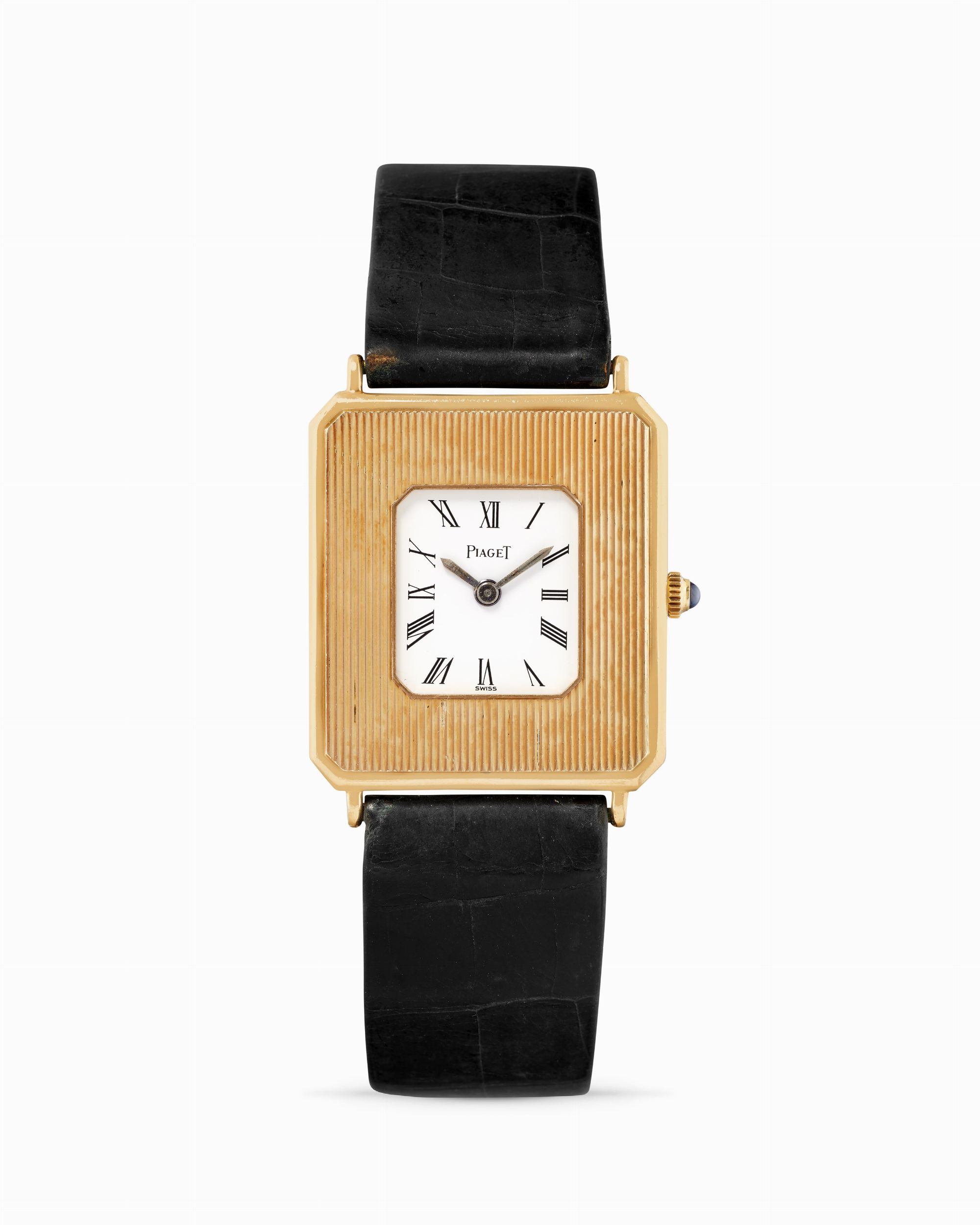 anni 70 Cassa rettangolare in oro 18k con finitura millerighe, n.284752. Quadrante bianco, numeri romani dipinti. Movimento a carica manuale, cal.9P2. Cinturino Piaget in pelle e fibbia Piaget in oro. Dimensioni: 27 x 25 mm. Accompagnato da garanzia e pochette Piaget.