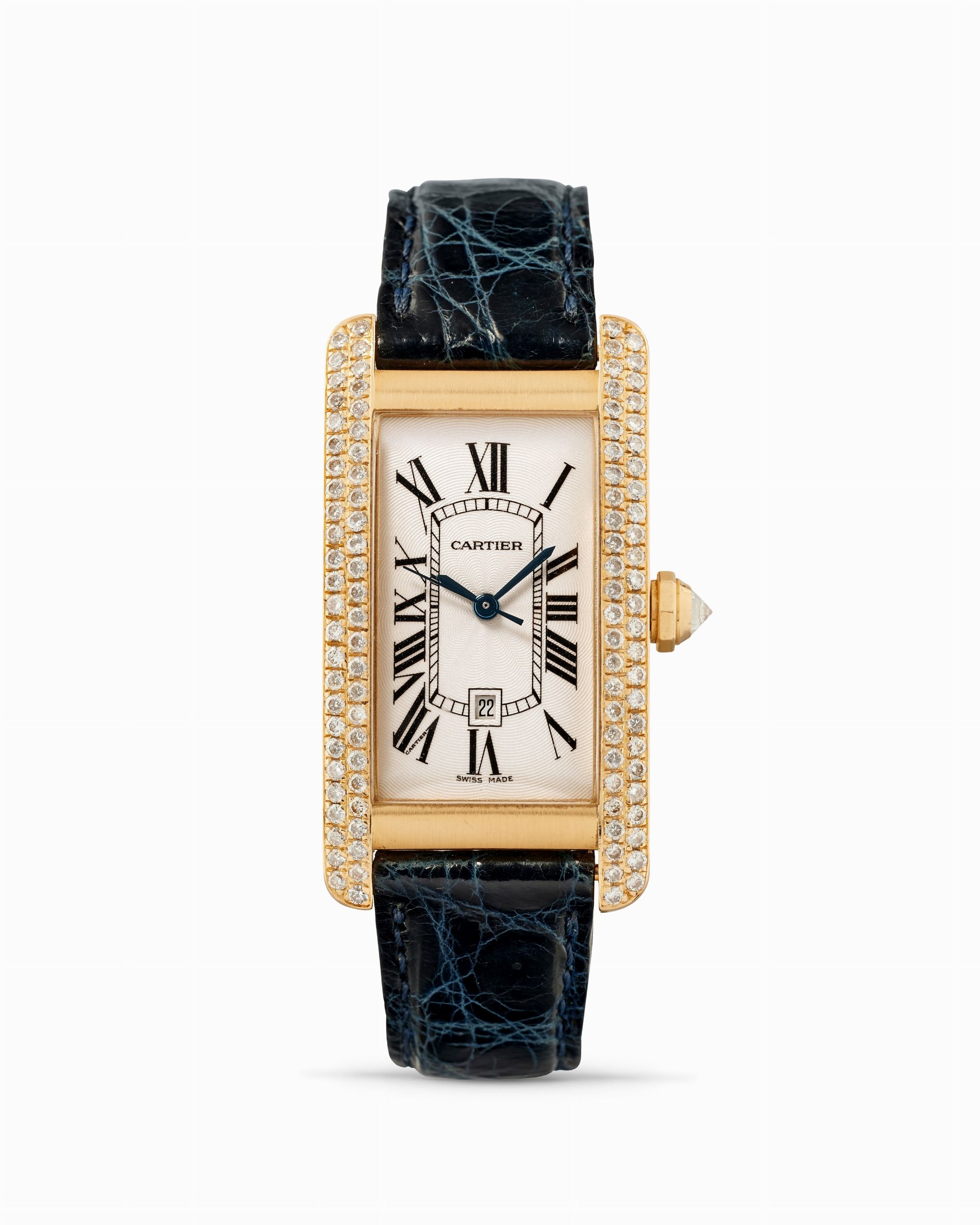 anni 2000 Cassa rettangolare in oro 18k settata diamanti, n.263630CD. Quadrante bianco con finitura flinqué, numeri romani dipinti. Movimento a carica automatica. Cinturino Cartier in pelle e fibbia deployante Cartier in oro. Dimensioni: 41 x 23 mm. Accompagnato da libretti e scatola Cartier, e garanzia reseller.