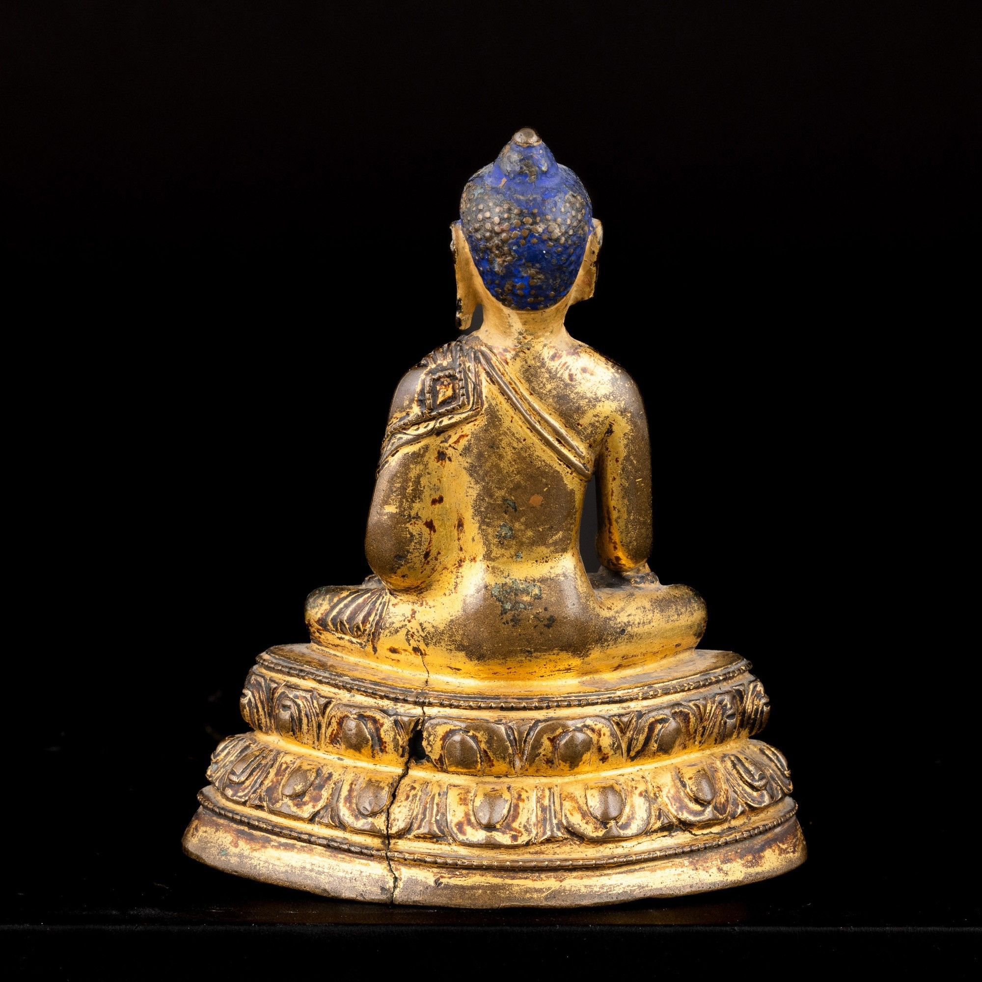 Figura di Akshobhya seduto su doppia fior di loto in bronzo dorato e policromia, [..]