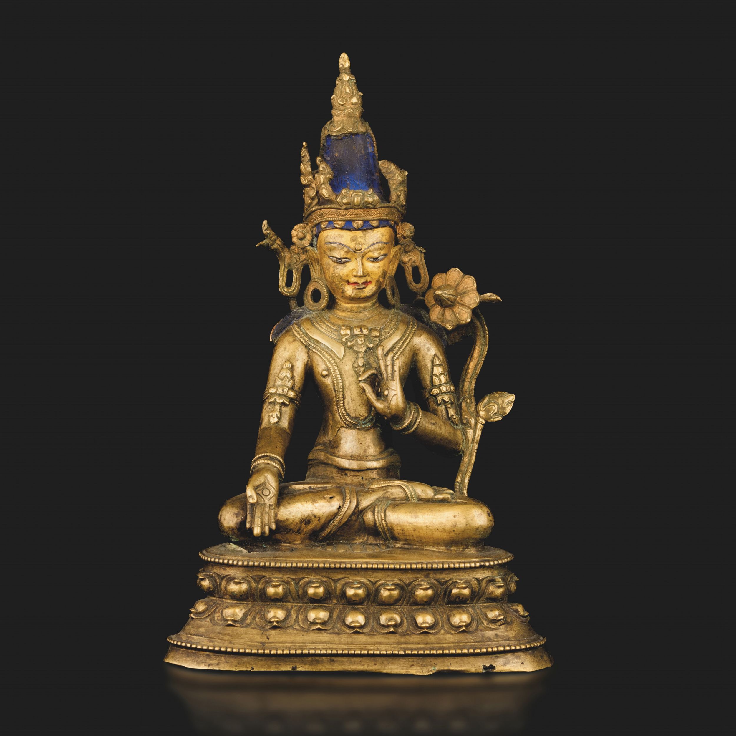 Figura di Avalokitesvara seduto su doppio fior di loto in ottone dorato, Tibet, [..]
