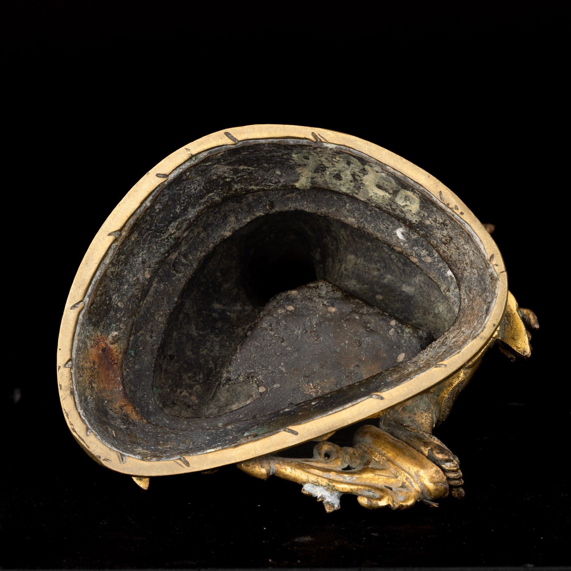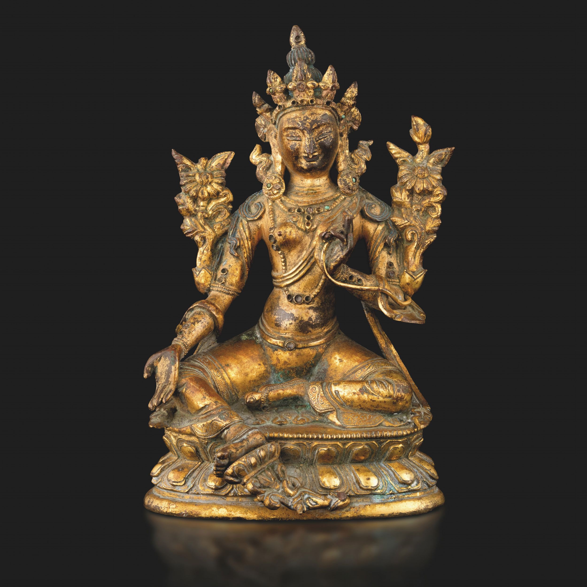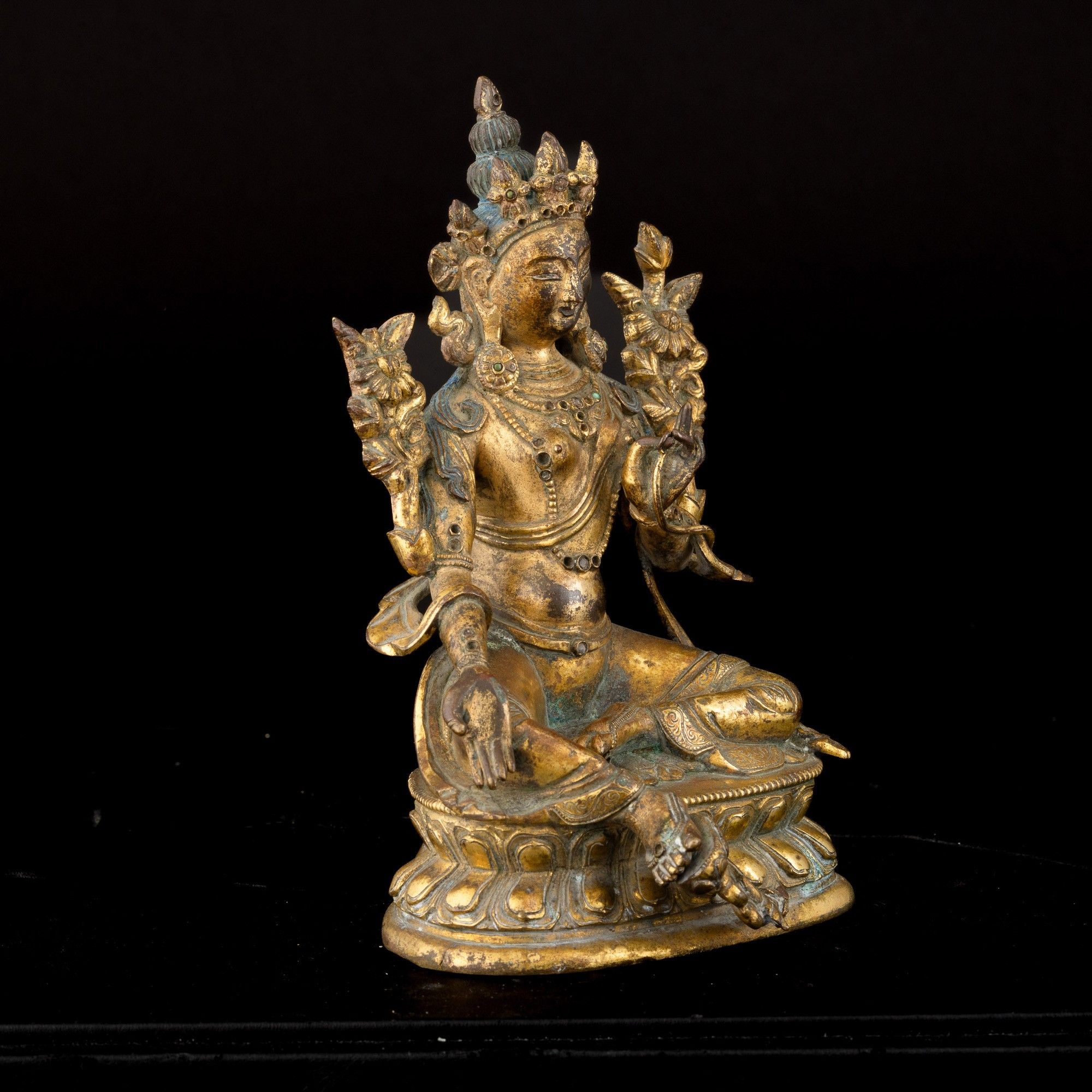 Figura di Buddha in bronzo dorato seduto su doppio fiore di loto con inserti in [..]