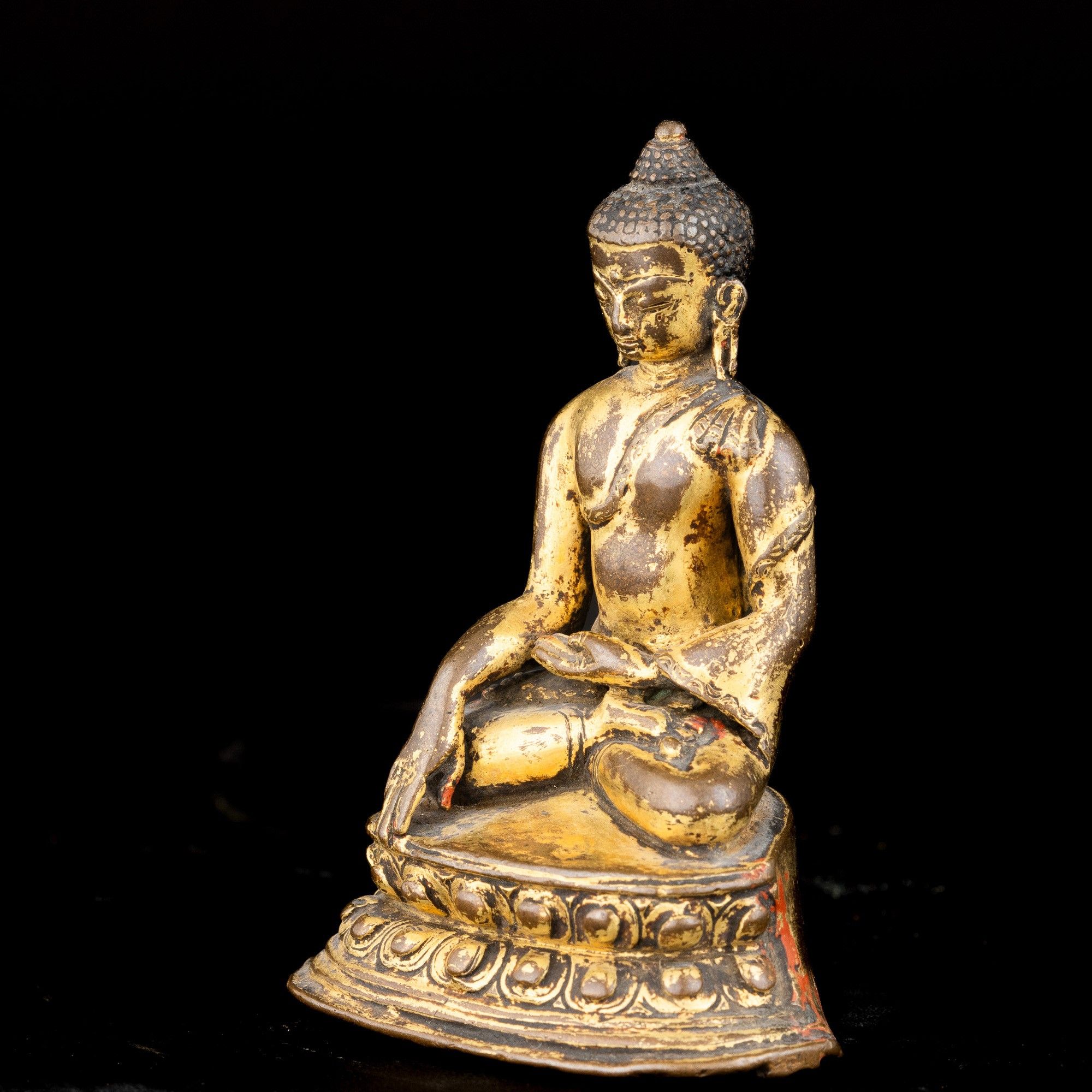 Figura di Buddha Sakyamuni seduto su doppio fior di loto in bronzo dorato, Nepal, [..]