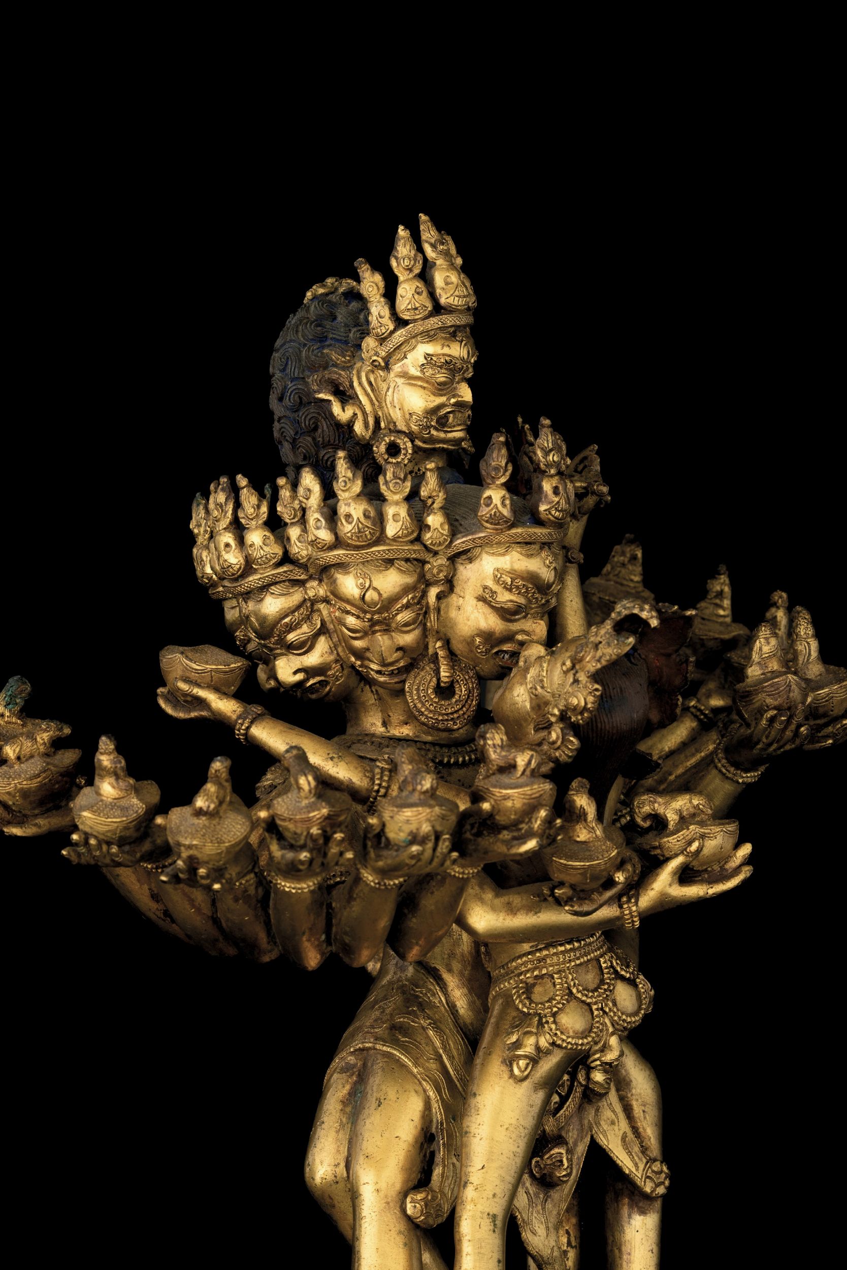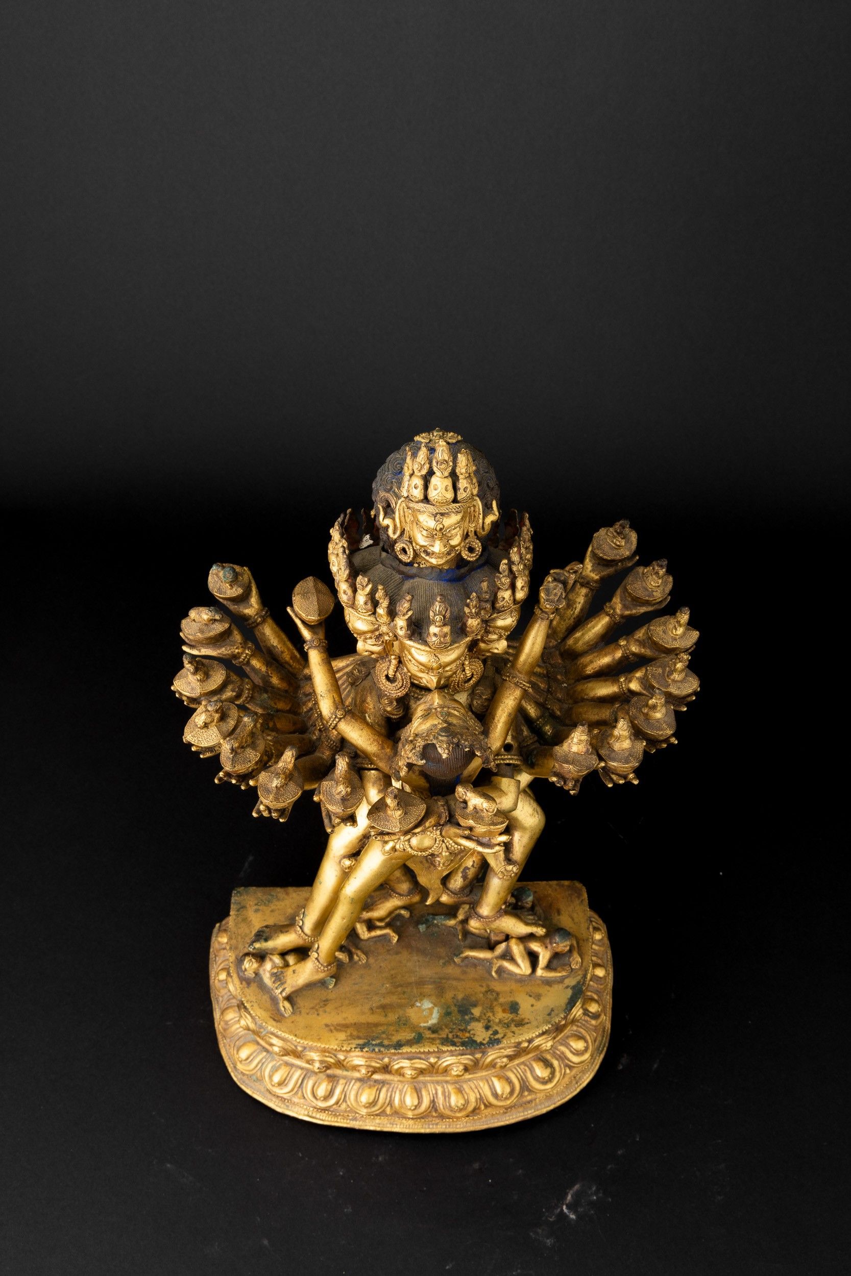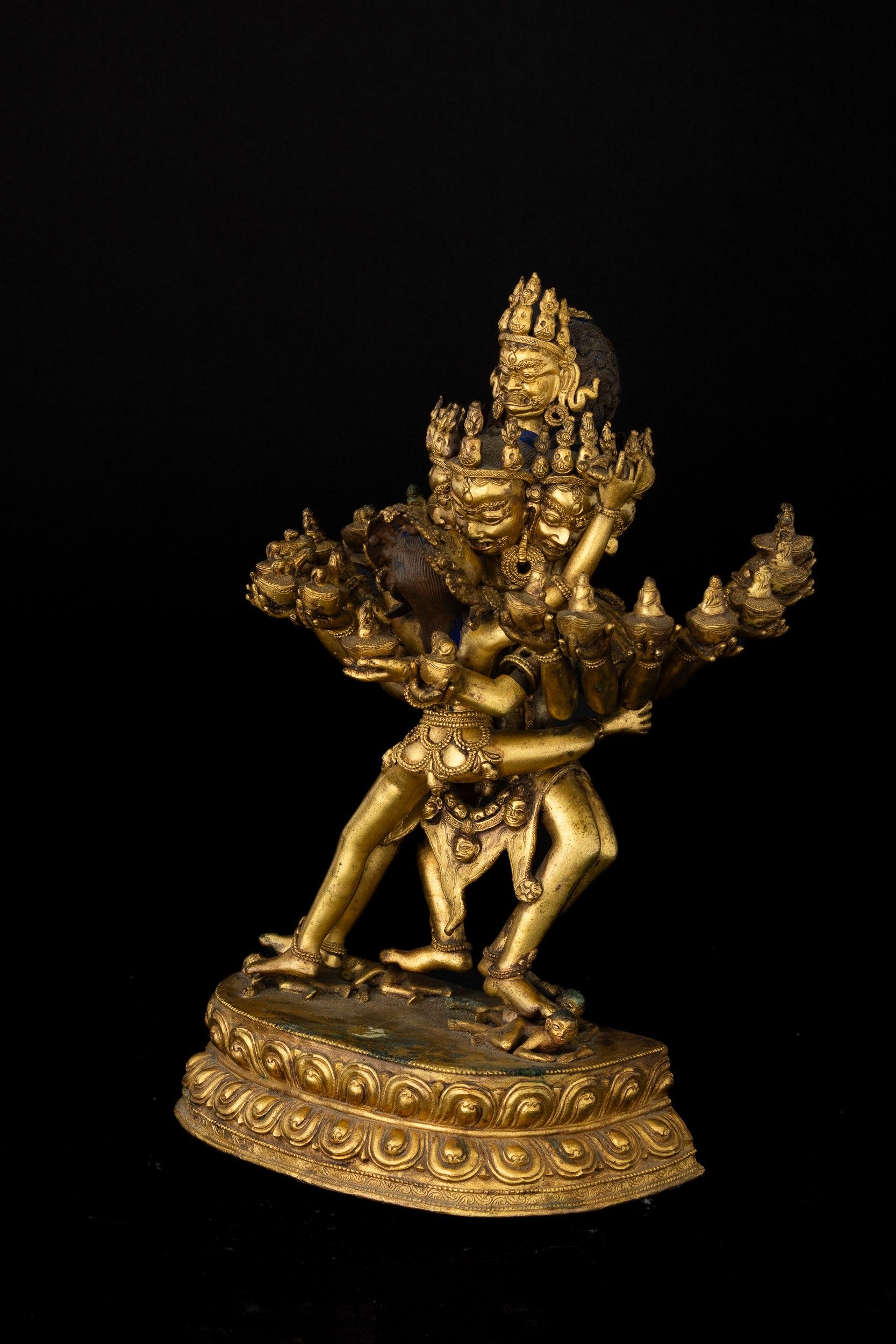 Figura di Guhyasamaja in Yab-Yum stante su doppio fiore di loto in bronzo dorato [..]