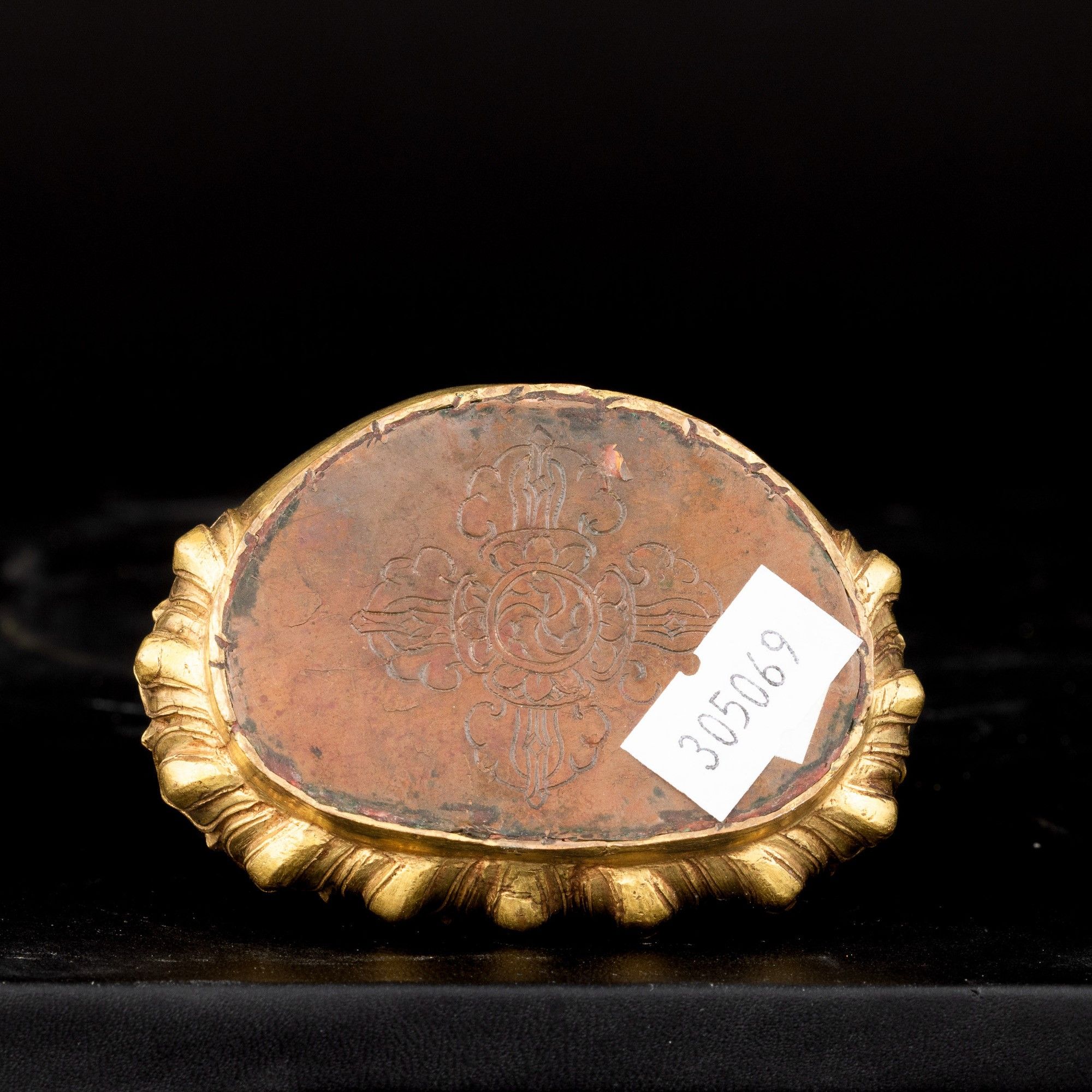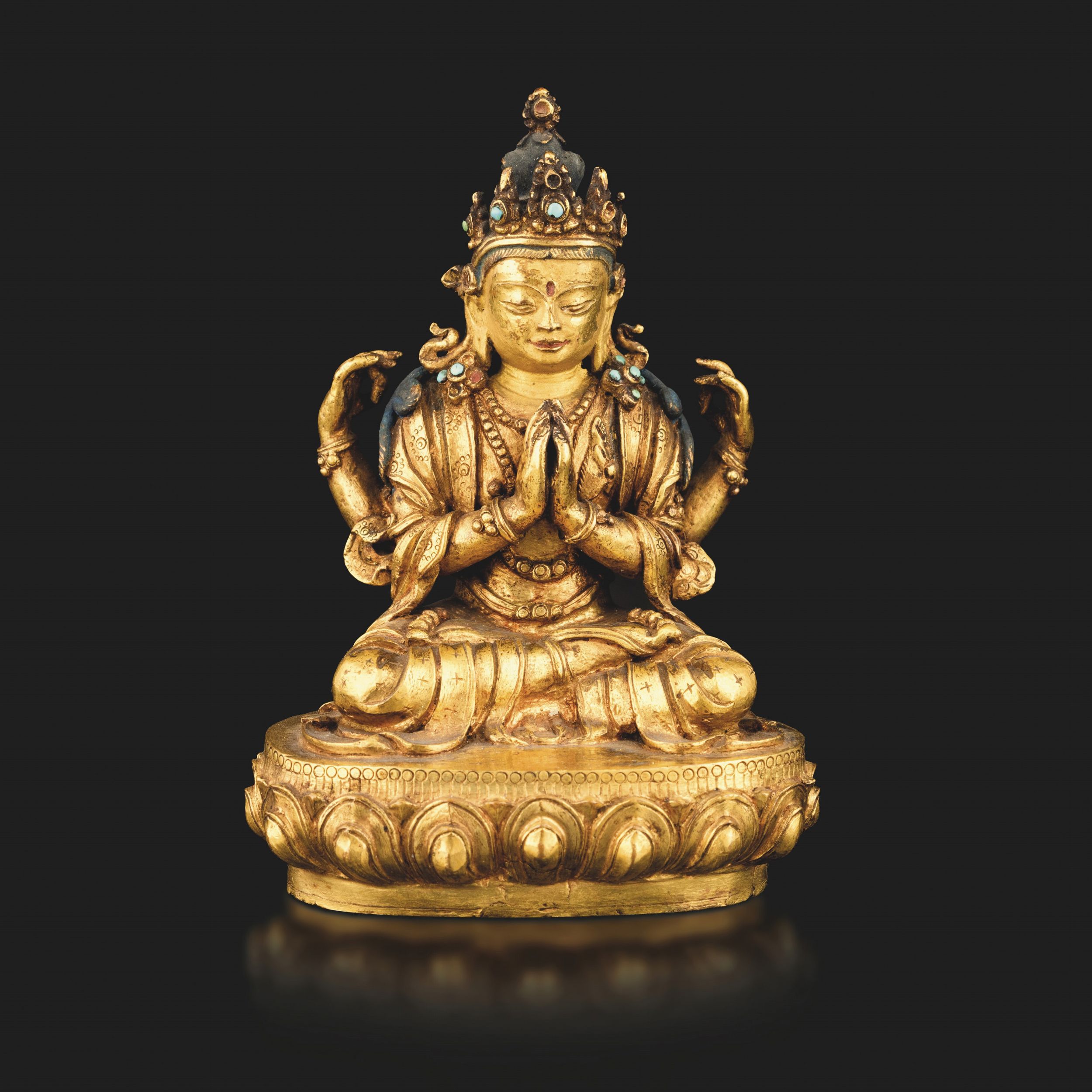 Figura di SHADAKSHARA AVALOKITESVARA seduto su fior di loto in bronzo dorato, tracce [..]