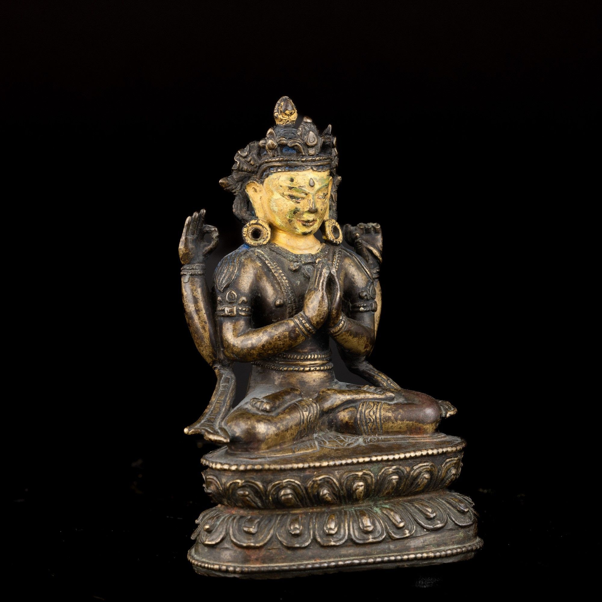 Figura di Shadakshara seduto su doppio fior di loto in bronzo parzialmente dorato [..]