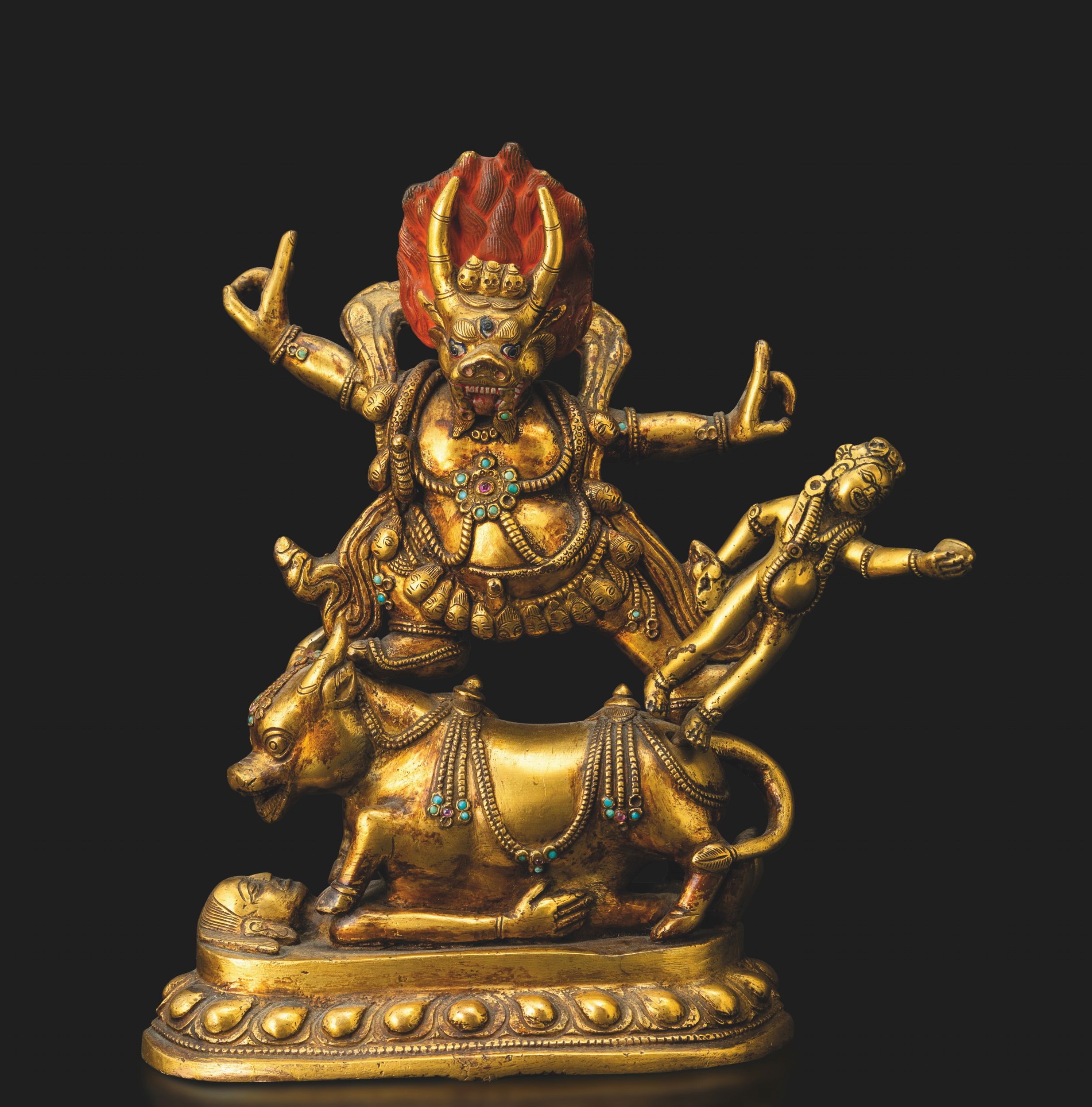 Figura di Yama Lord of Hell in bronzo dorato con tracce di policromia e innesti [..]