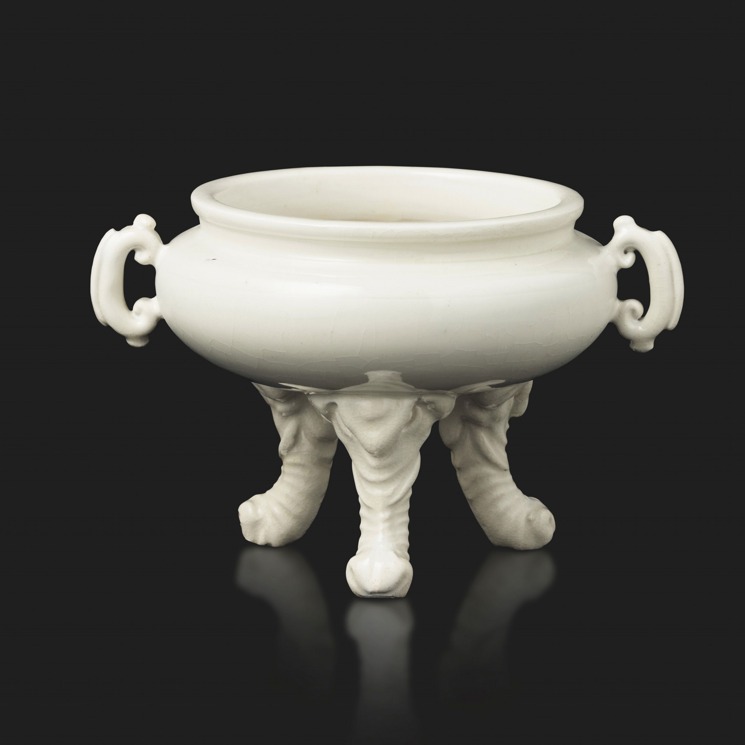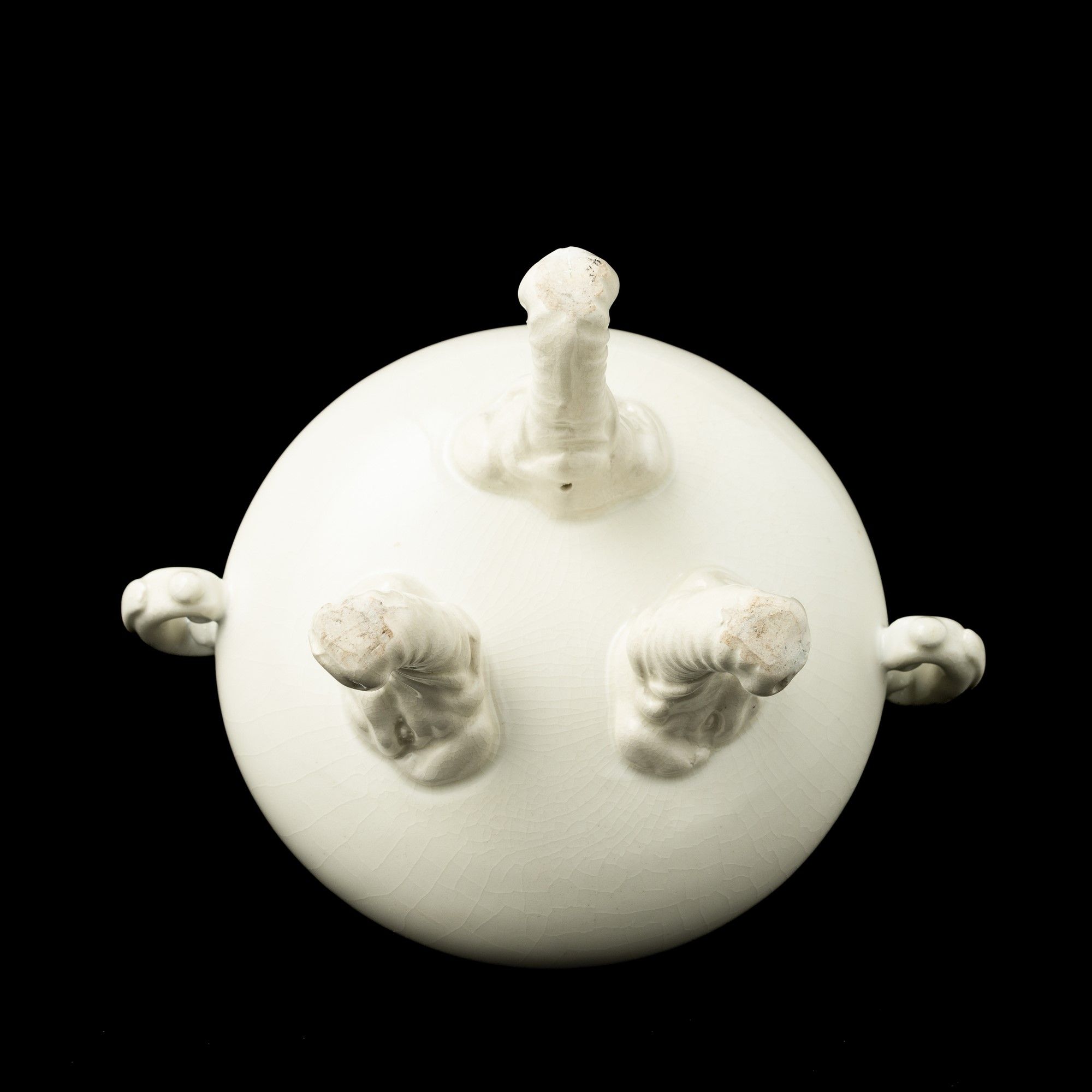 Incensiere tripode in porcellana Dehua, Blanc de Chine, con gambe a foggia di proboscide [..]