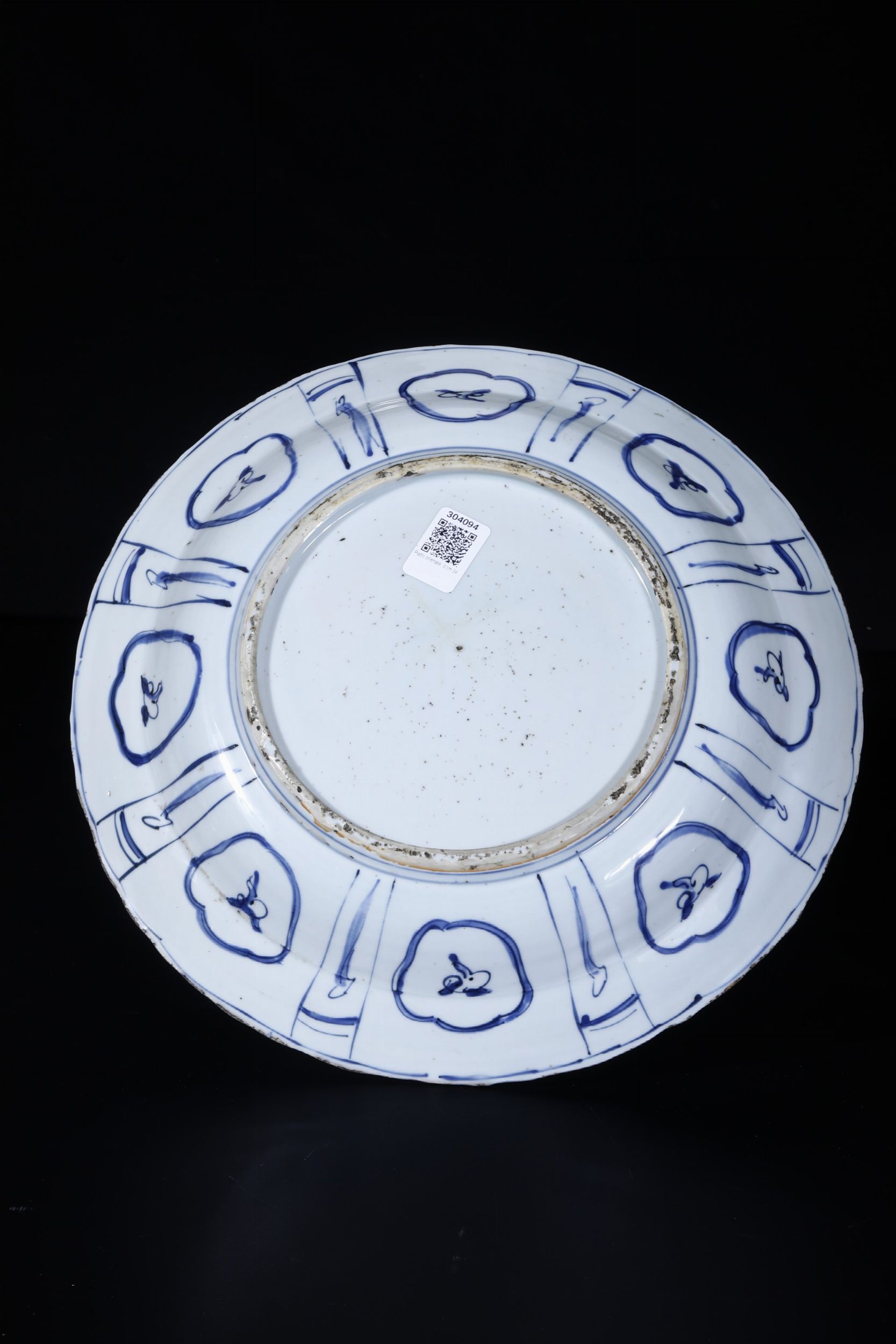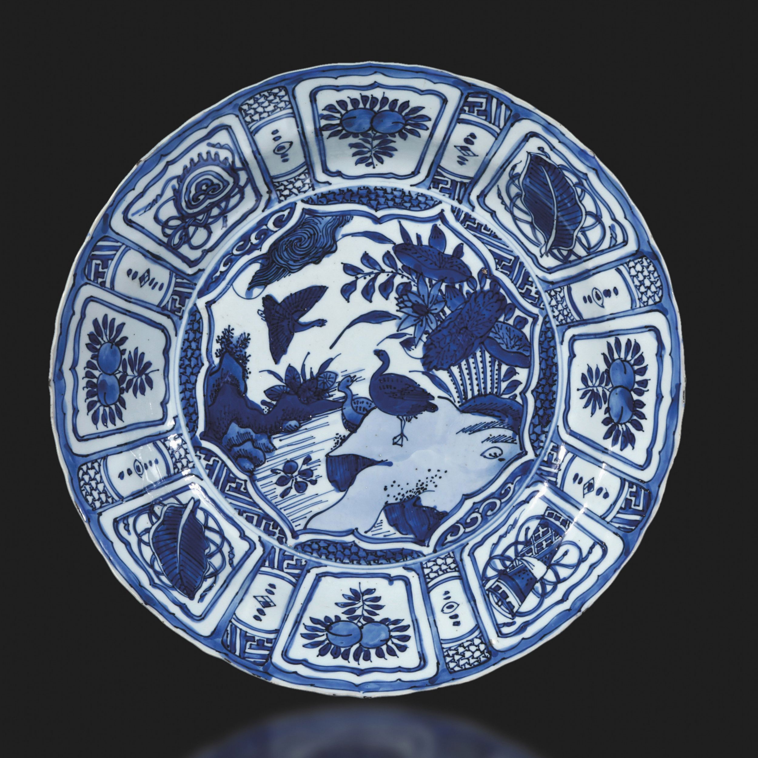 Piatto in porcellana bianca e blu Kraak a decoro paesaggistico con uccelli, Cina, [..]