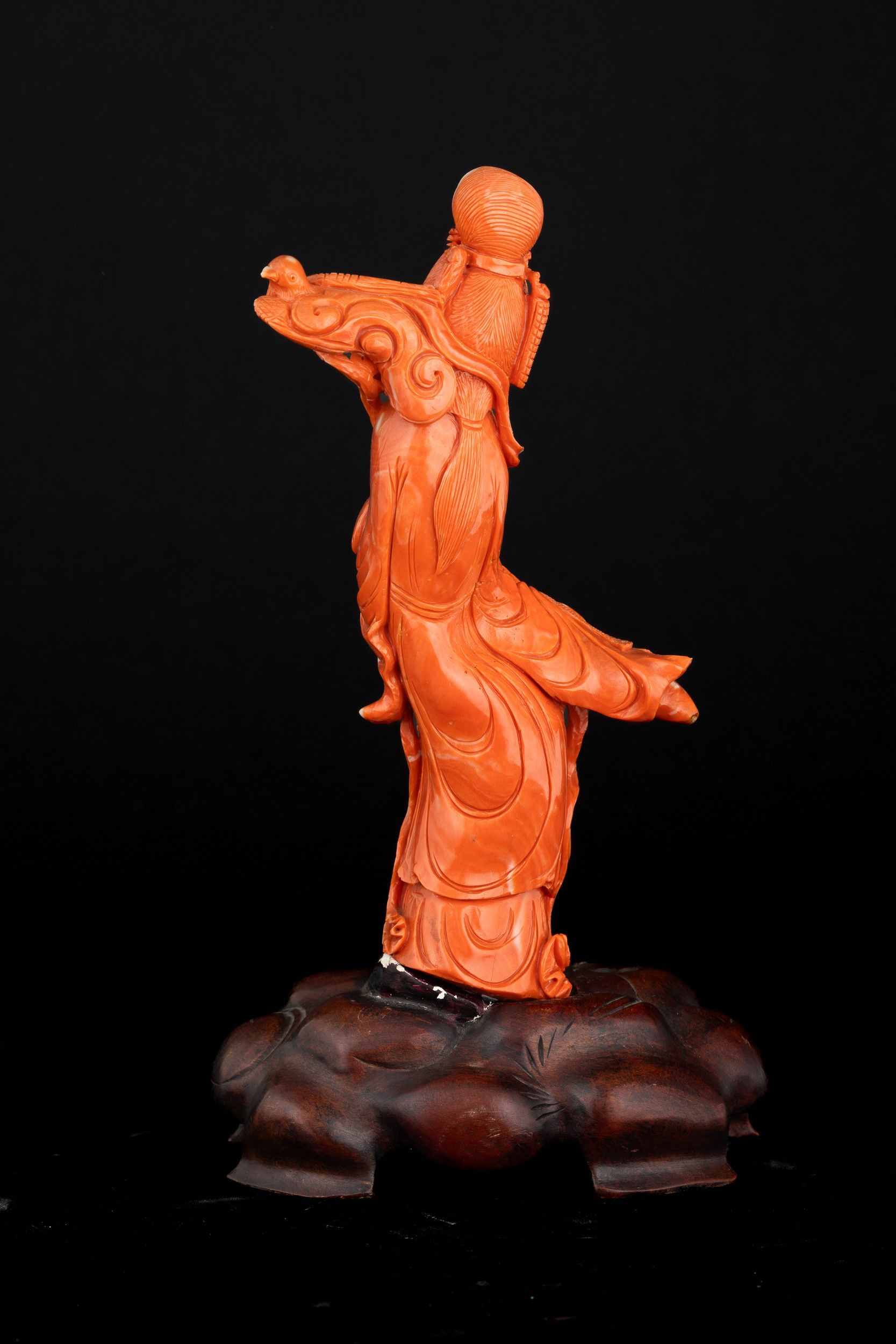 Scultura raffigurane Guanyin con uccellini in corallo, 708 gr,Cina, Dinastia Qing, [..]