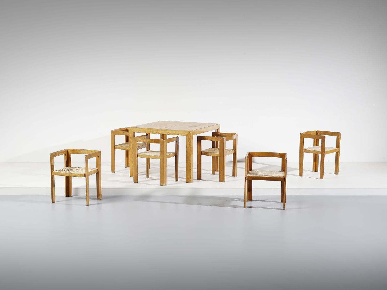 Anni Ottanta.Dimensioni: sedie 64 x 49 x 45 cm. tavolo 73 x 100 x 100 cm