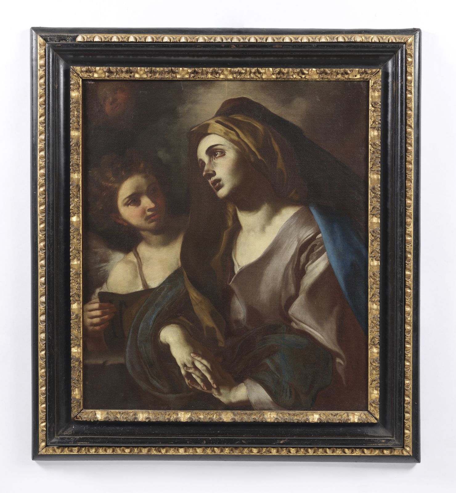 Si ringrazia il Prof. Nicola Spinosa per aver confermato l'attribuzione dell'opera su base fotografica.Provenienza: Collezione privata, NapoliBibliografia di riferimento: N. Spinosa (a cura di), 'Francesco Solimena (1657-1747) e le Arti a Napoli', Roma 2018, p. 476 fig. 216 e 216.1Il dipinto, proveniente da una collezione privata napoletana, è una versione autografa di Francesco Solimena del motivo dell''Addolorata' affiancata da un angelo, un soggetto che, per analogie stilistiche e per affinità nella composizione tra le varie versioni, Nicola Spinosa data tra il 1725 e il 1730 circa. Sono note almeno altre due tele autografe, una di dimensioni analoghe alla nostra e conservata al Museo Civico Ala Ponzone di Cremona (inv. n° 792), l'altra alla Pinacoteca Provinciale 'Corrado Giaquinto' di Bari (di dimensioni maggiori). Si ricordano anche copie di bottega, tra cui quella del Museo Nazionale di Belgrado, e varianti nell'impostazione e nella resa pittorica, come nella tela del Palazzo Reale di Aranjuez, già parte della collezione di Elisabetta Farnese al Palazzo della Granja de San Ildefonso.