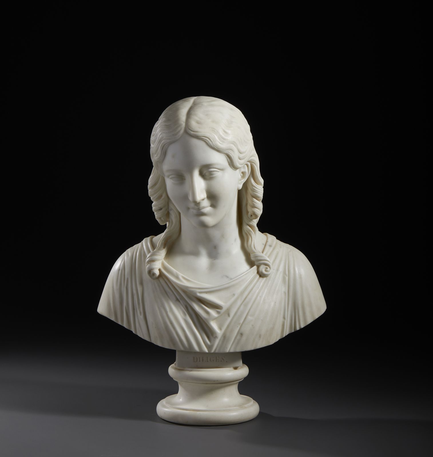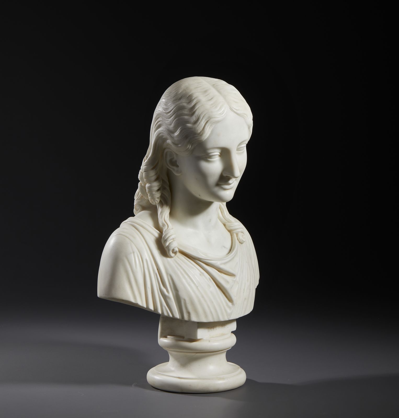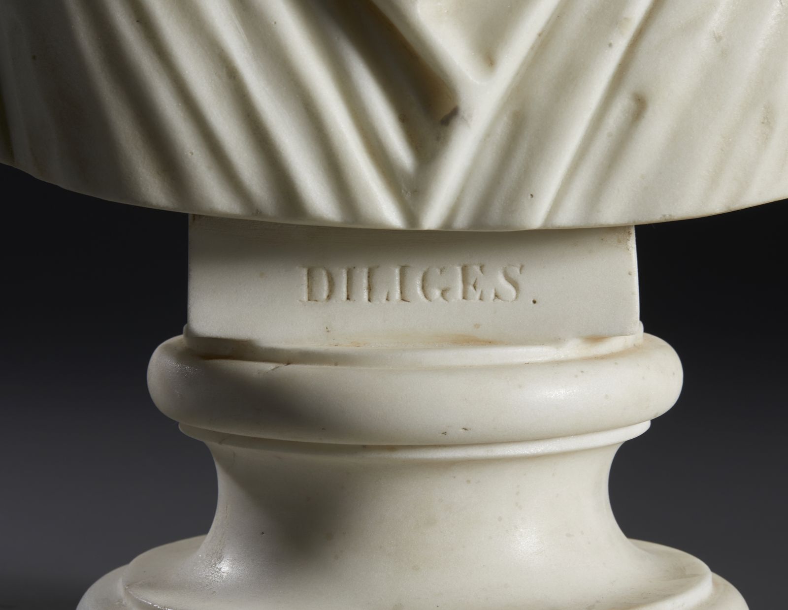 Firmato e datato 1854.Provenienza: Collezione privata, BresciaBibliografia di riferimento: I. Fumagalli in 'Biblioteca italiana', 1833, t. 212, p. 270.G. Barbieri, 'A Pompeo Marchesi, per lo dono fatto all'autore d'un piccolo Nazzareno portante la divina epigrafe 'Diliges' in 'La Moda', 16 dicembre 1841, p. 398.M. Mondini e C. Zani (a cura di), 'Paolo Tosio. Un collezionista bresciano dell'Ottocento', Brescia 1981, p.40, fig. II.20.A. Sassi, 'Pompeo Marchesi', Saltrio 1983, p. 36 e p. 63, fig. 38.O. Cucciniello, 'Neoclassico/Romantico. Pompeo Marchesi scultore collezionista', GAM Milano 2023, p. 20 (fig. 7) e pp. 194 e 195, n° V.8.La scultura qui presentata è una riduzione a busto del celebre e fortunato modello a figura intera del 'Cristo fanciullo docente nel Tempio' (noto anche come 'Gesù fanciullo tra i dottori'/'Il Nazareno'/'Redentore') realizzato per la prima volta da Pompeo Marchesi nel 1833 su commissione del conte Paolo Tosio per la cappella del suo palazzo a Brescia ed esposto a Brera nel medesimo anno, dove incontrò un entusiasmo unanime ('[...] il fanciullo divino in attitudine di muoversi favellando addita il cuor colla manca per esprimere che tutta la legge è amore, e levata un poco la destra con aperte due dita significa i due capi di questo precetto [...] il volto spira un'aura di mansuetudine e di dolcezza che innamora, e forse innanzi tempo ne richiama un poco quella fisionomia di convenzione che si suol dare al Redentore' - I. Fumagalli in 'Biblioteca italiana', 1833, p. 270).La bellezza idealizzata unita al delicato sentimentalismo espresso magistralmente dalla dolcezza dei tratti crearono le condizioni per la sua fortuna collezionistica e per la produzione di altre versioni da parte di Marchesi: repliche a figura intera furono realizzate, tra le altre, per il futuro zar di Russia Alessandro II nel 1841 e per l'imprenditore di origine tedesca Enrico Mylius nel 1842, versione tutt'oggi conservata nel cimitero di Villa Vigoni a Laveno di Menaggio. Oltre alle 'figure intere', Pompeo Marchesi realizzò anche delle versioni a busto (come quella presente), forse come dono per amici e mecenati, come testimonierebbe la poesia celebrativa composta dal poeta Giuseppe Barbieri 'A Pompeo Marchesi, per lo dono fatto all'autore d'un piccolo Nazzareno portante la divina epigrafe 'Diliges'', pubblicata in 'La Moda' del 16 dicembre 1841.Per alcuni dettagli delle pieghe del manto, il nostro busto sembra derivare direttamente dalla versione 'Mylius' più che dalla scultura originale per il conte Tosio, e risulta idealmente accostabile alla tipologia del busto 'Barbieri' anche per la presenza della medesima scritta incisa alla base.
