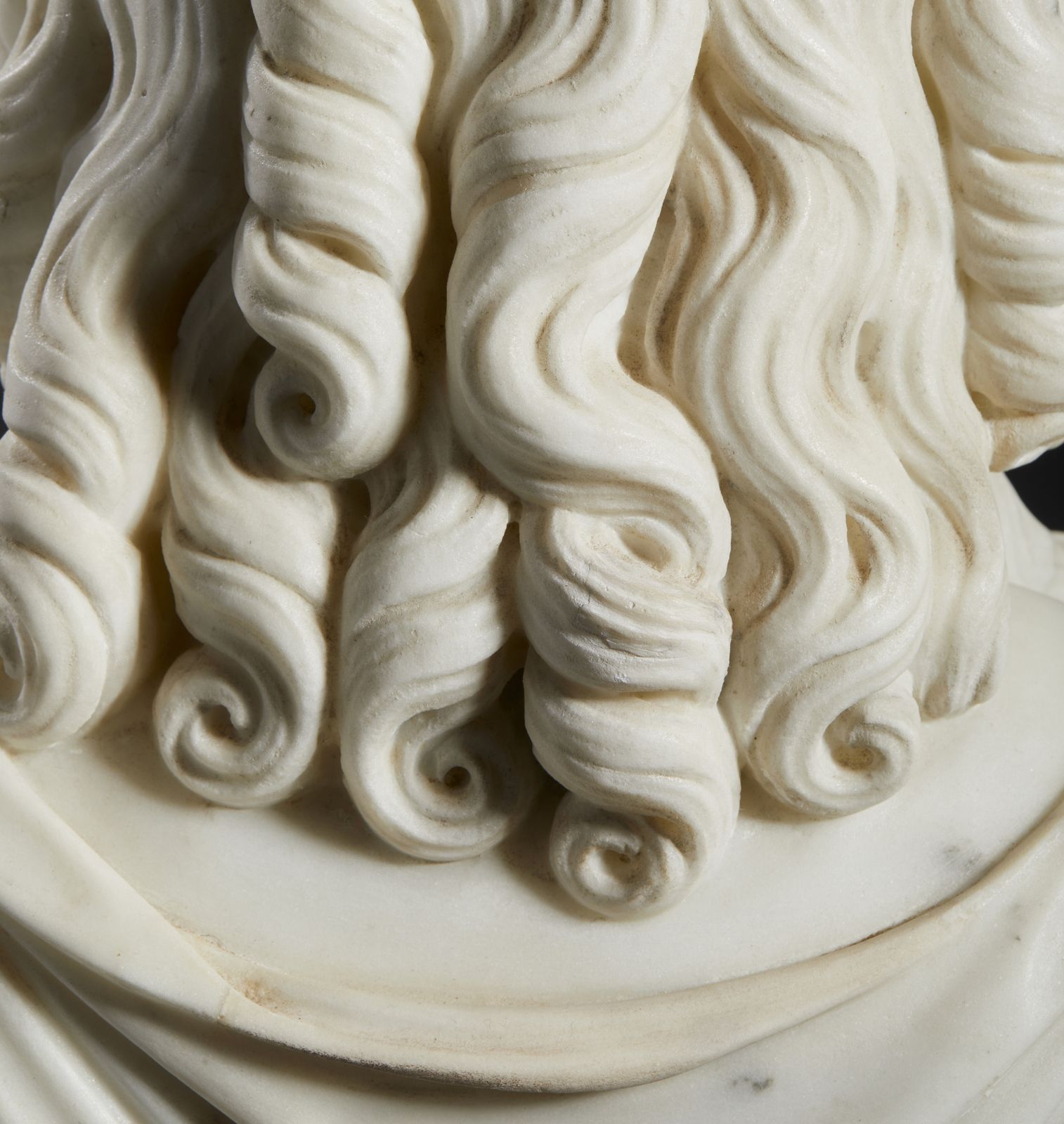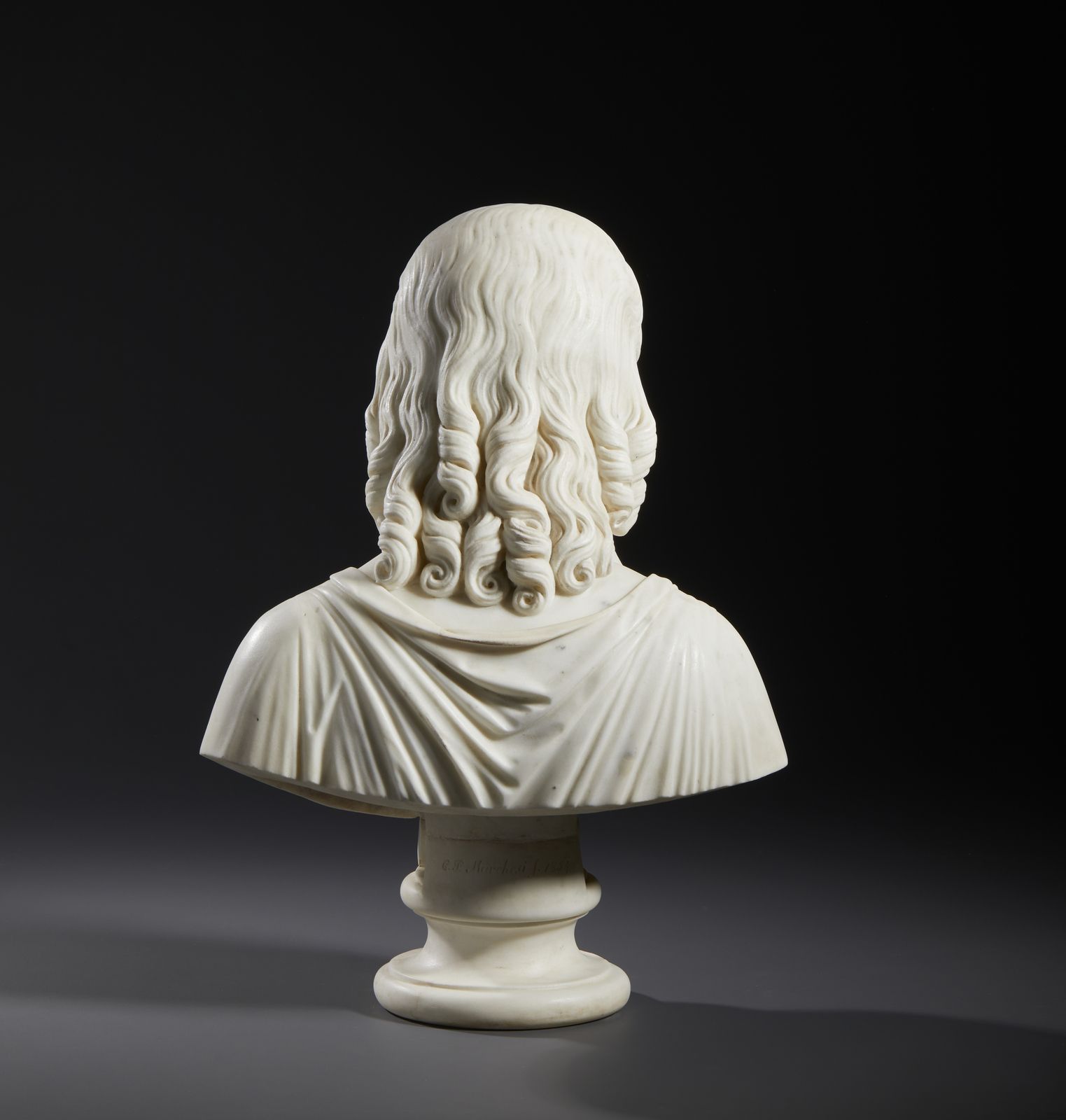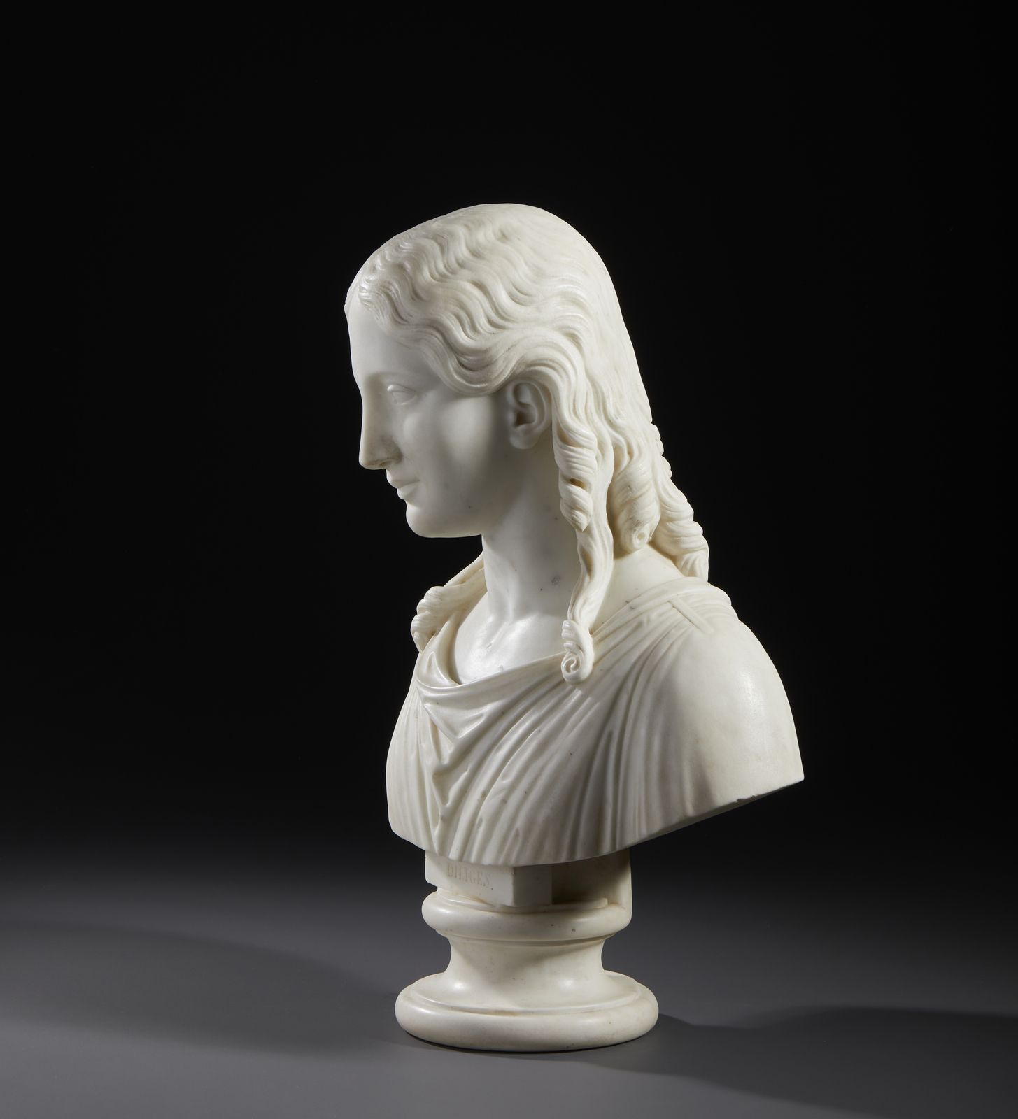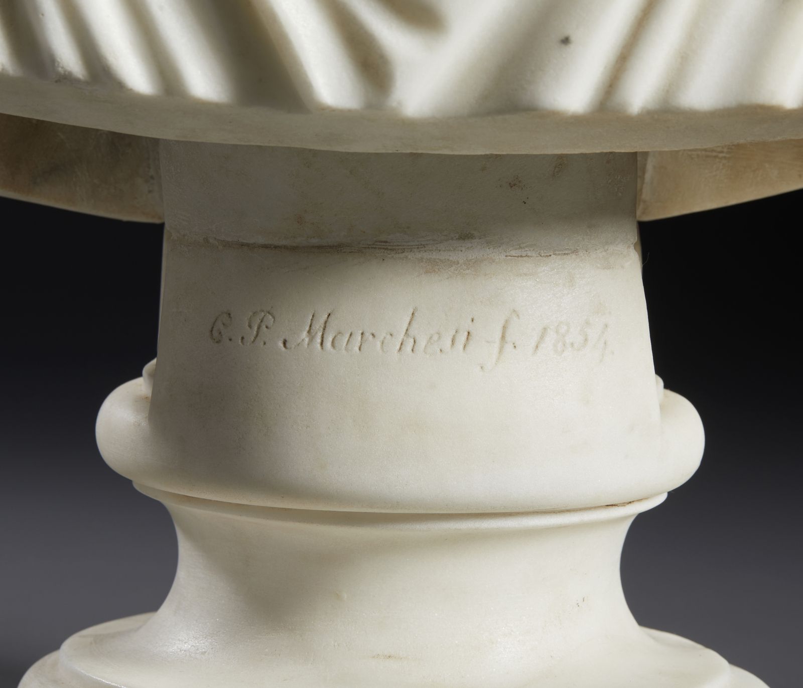 Firmato e datato 1854.Provenienza: Collezione privata, BresciaBibliografia di riferimento: I. Fumagalli in 'Biblioteca italiana', 1833, t. 212, p. 270.G. Barbieri, 'A Pompeo Marchesi, per lo dono fatto all'autore d'un piccolo Nazzareno portante la divina epigrafe 'Diliges' in 'La Moda', 16 dicembre 1841, p. 398.M. Mondini e C. Zani (a cura di), 'Paolo Tosio. Un collezionista bresciano dell'Ottocento', Brescia 1981, p.40, fig. II.20.A. Sassi, 'Pompeo Marchesi', Saltrio 1983, p. 36 e p. 63, fig. 38.O. Cucciniello, 'Neoclassico/Romantico. Pompeo Marchesi scultore collezionista', GAM Milano 2023, p. 20 (fig. 7) e pp. 194 e 195, n° V.8.La scultura qui presentata è una riduzione a busto del celebre e fortunato modello a figura intera del 'Cristo fanciullo docente nel Tempio' (noto anche come 'Gesù fanciullo tra i dottori'/'Il Nazareno'/'Redentore') realizzato per la prima volta da Pompeo Marchesi nel 1833 su commissione del conte Paolo Tosio per la cappella del suo palazzo a Brescia ed esposto a Brera nel medesimo anno, dove incontrò un entusiasmo unanime ('[...] il fanciullo divino in attitudine di muoversi favellando addita il cuor colla manca per esprimere che tutta la legge è amore, e levata un poco la destra con aperte due dita significa i due capi di questo precetto [...] il volto spira un'aura di mansuetudine e di dolcezza che innamora, e forse innanzi tempo ne richiama un poco quella fisionomia di convenzione che si suol dare al Redentore' - I. Fumagalli in 'Biblioteca italiana', 1833, p. 270).La bellezza idealizzata unita al delicato sentimentalismo espresso magistralmente dalla dolcezza dei tratti crearono le condizioni per la sua fortuna collezionistica e per la produzione di altre versioni da parte di Marchesi: repliche a figura intera furono realizzate, tra le altre, per il futuro zar di Russia Alessandro II nel 1841 e per l'imprenditore di origine tedesca Enrico Mylius nel 1842, versione tutt'oggi conservata nel cimitero di Villa Vigoni a Laveno di Menaggio. Oltre alle 'figure intere', Pompeo Marchesi realizzò anche delle versioni a busto (come quella presente), forse come dono per amici e mecenati, come testimonierebbe la poesia celebrativa composta dal poeta Giuseppe Barbieri 'A Pompeo Marchesi, per lo dono fatto all'autore d'un piccolo Nazzareno portante la divina epigrafe 'Diliges'', pubblicata in 'La Moda' del 16 dicembre 1841.Per alcuni dettagli delle pieghe del manto, il nostro busto sembra derivare direttamente dalla versione 'Mylius' più che dalla scultura originale per il conte Tosio, e risulta idealmente accostabile alla tipologia del busto 'Barbieri' anche per la presenza della medesima scritta incisa alla base.