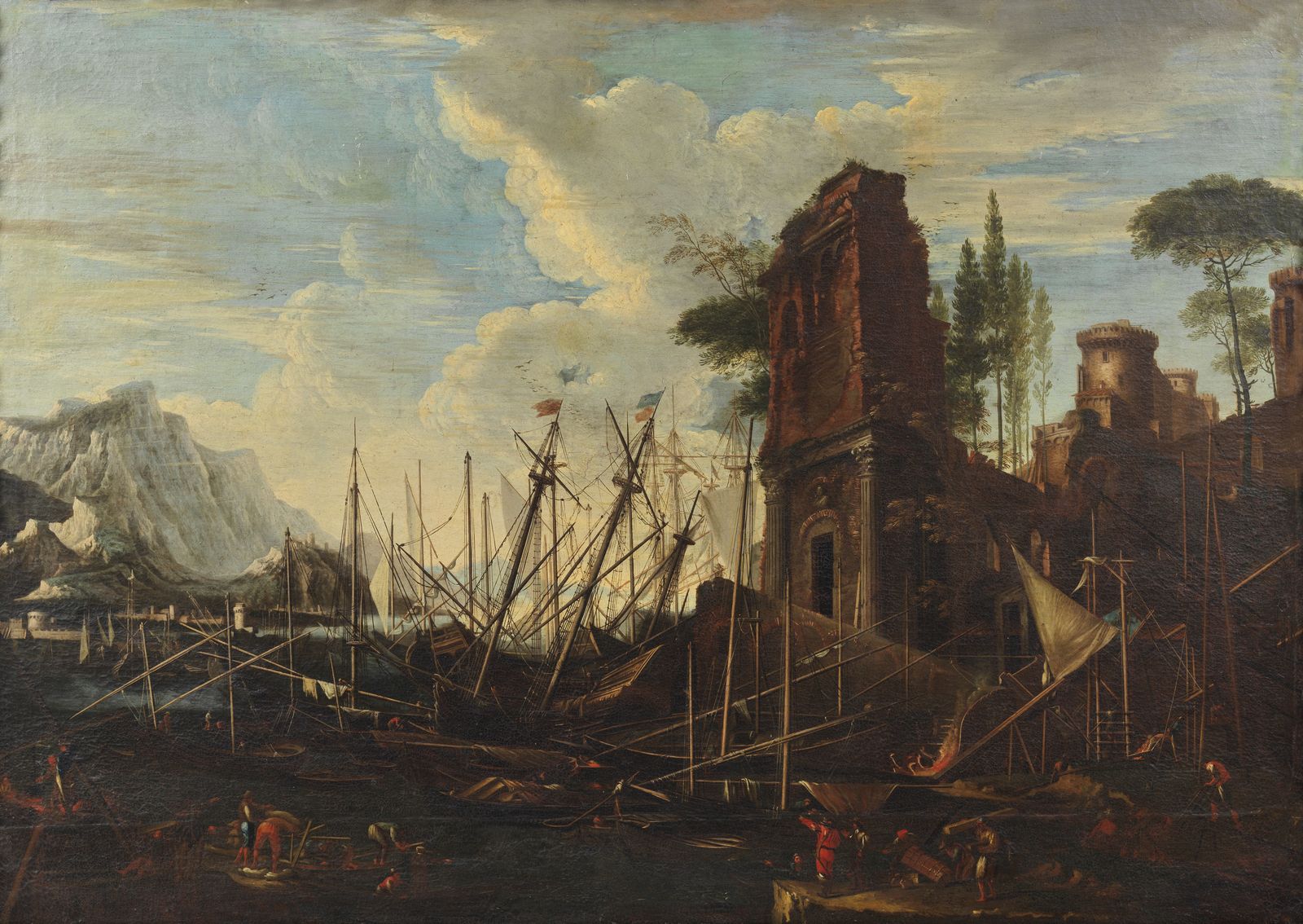 Copia da. Paesaggio costiero con imbarcazioni e rovine