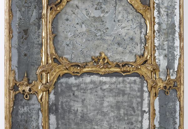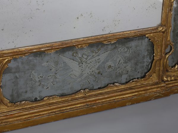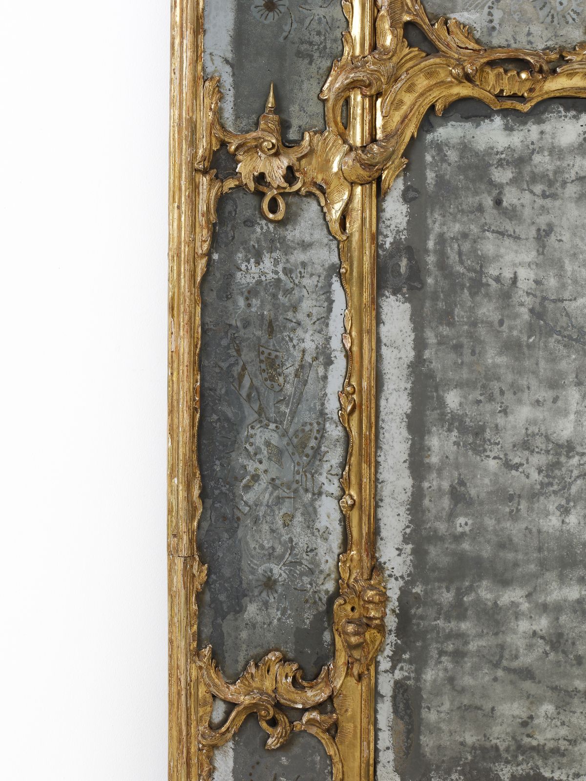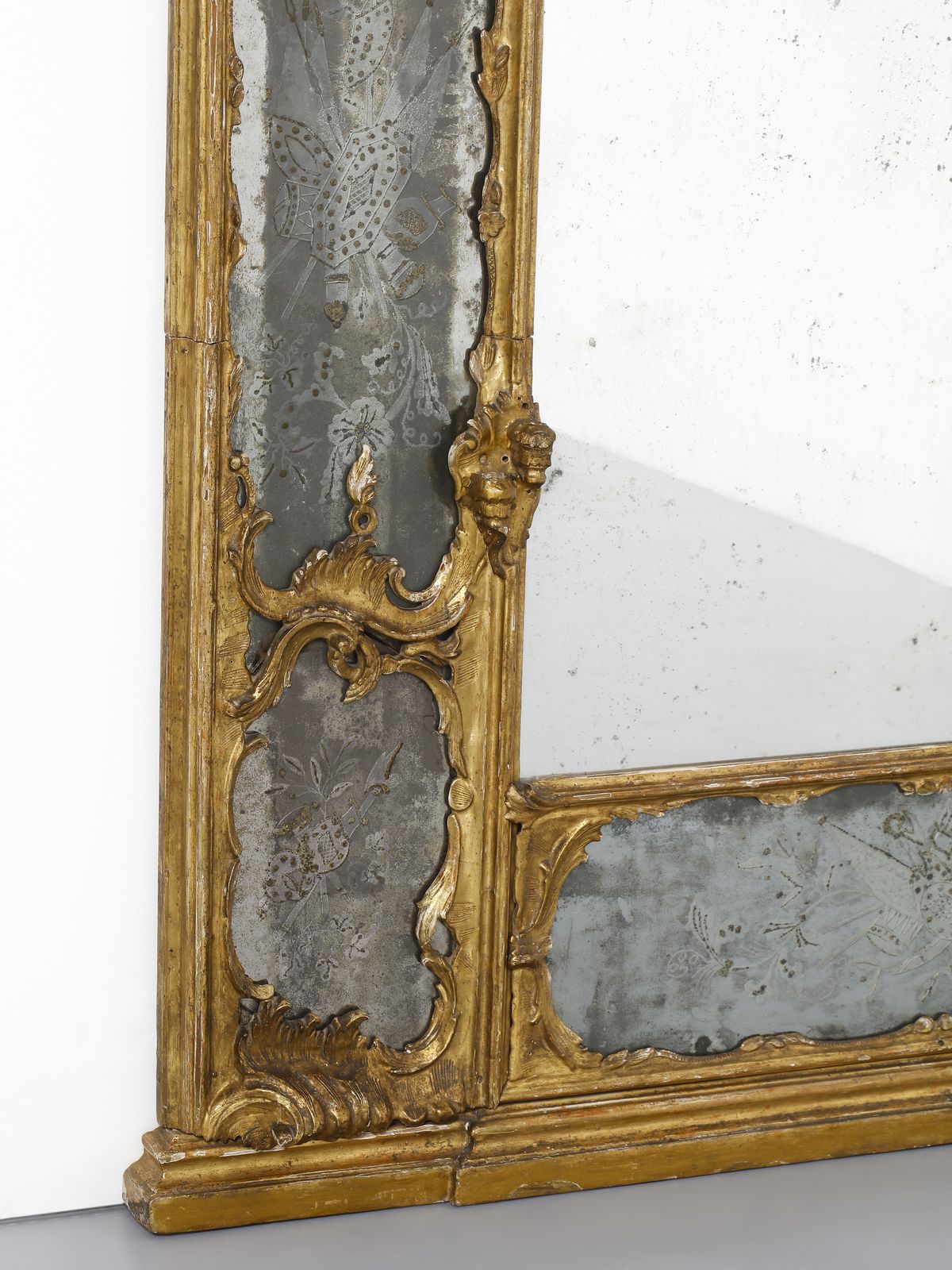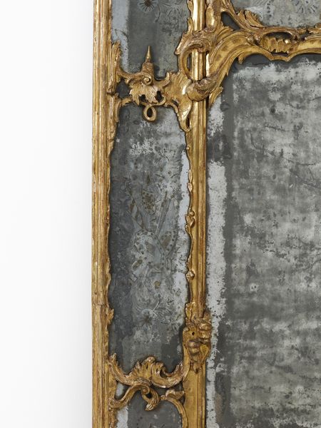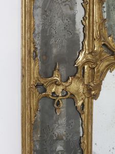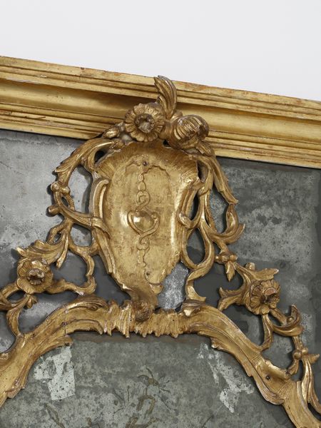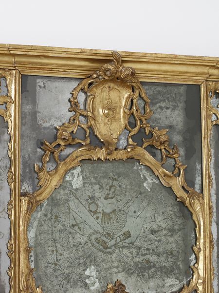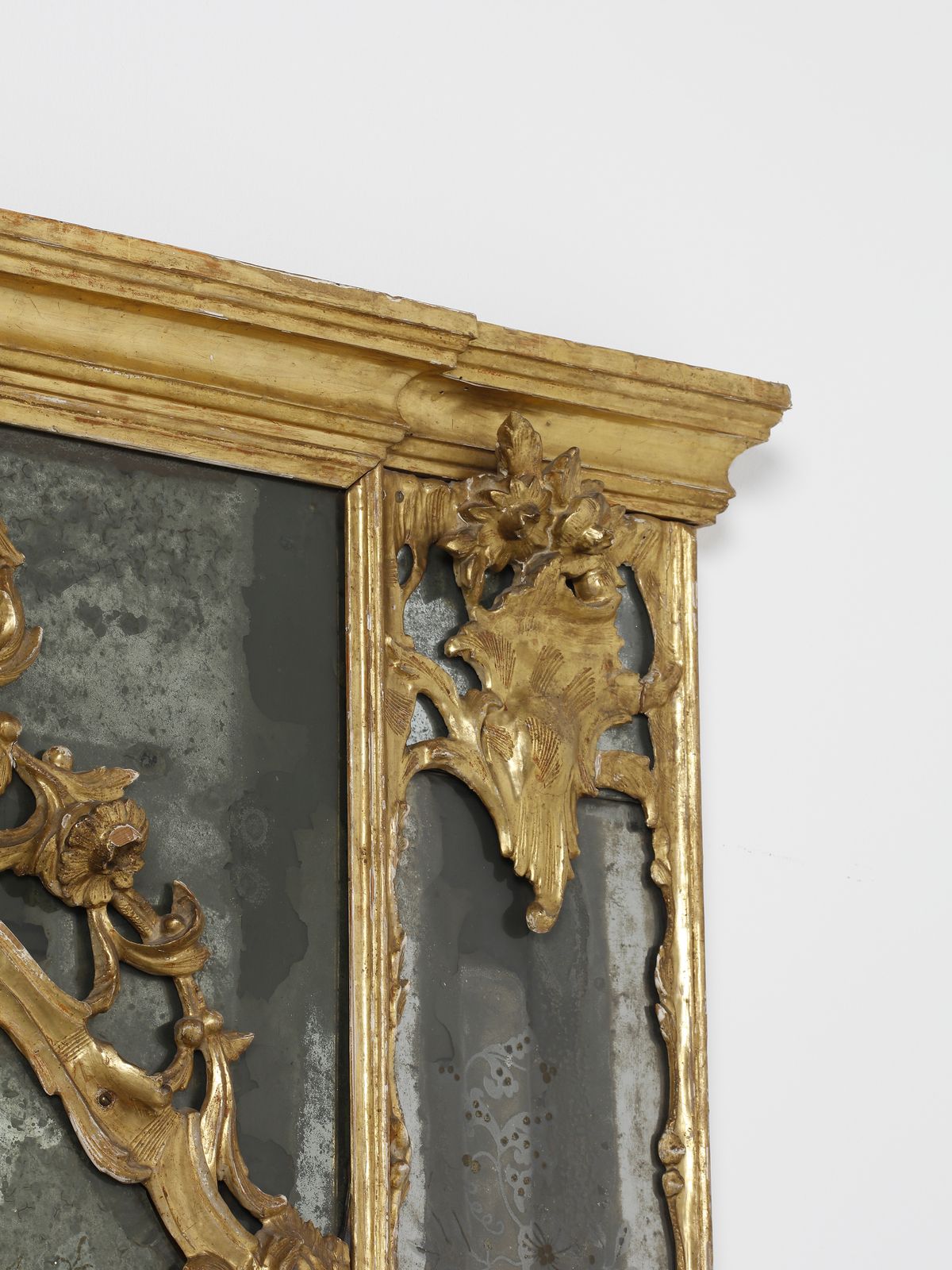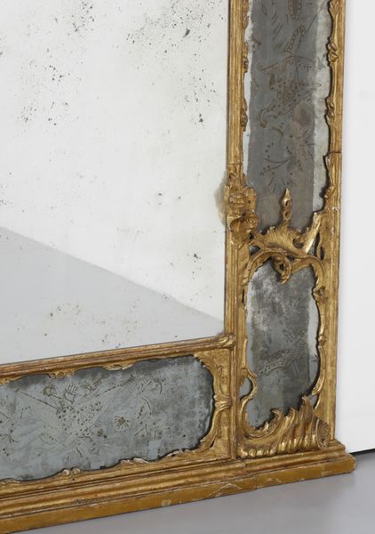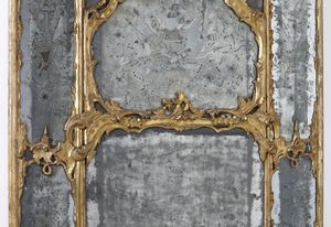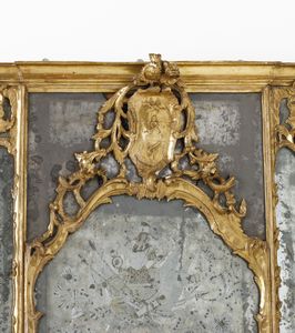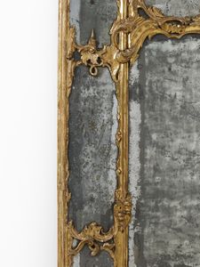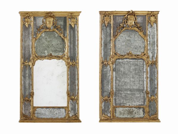 Coppia di imponenti specchiere tripartite in legno intagliato e dorato, decorazioni [..]