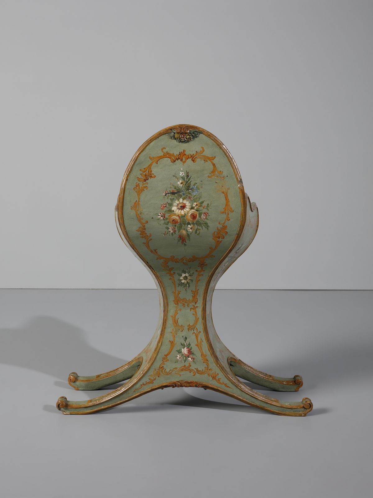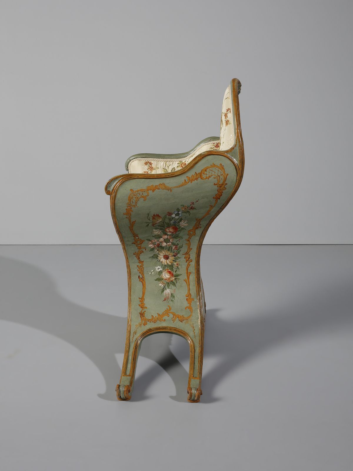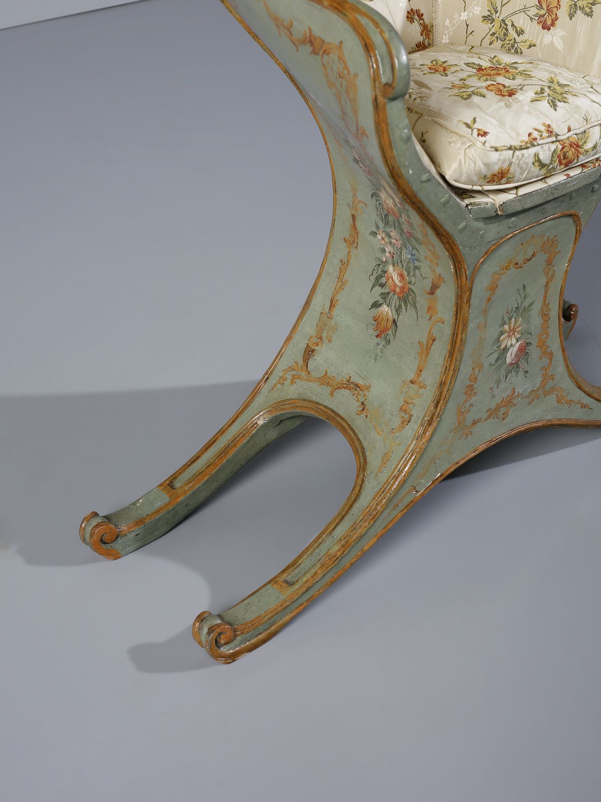Rara sedia da gondola in legno laccato e parzialmente dorato con decorazioni policrome [..]