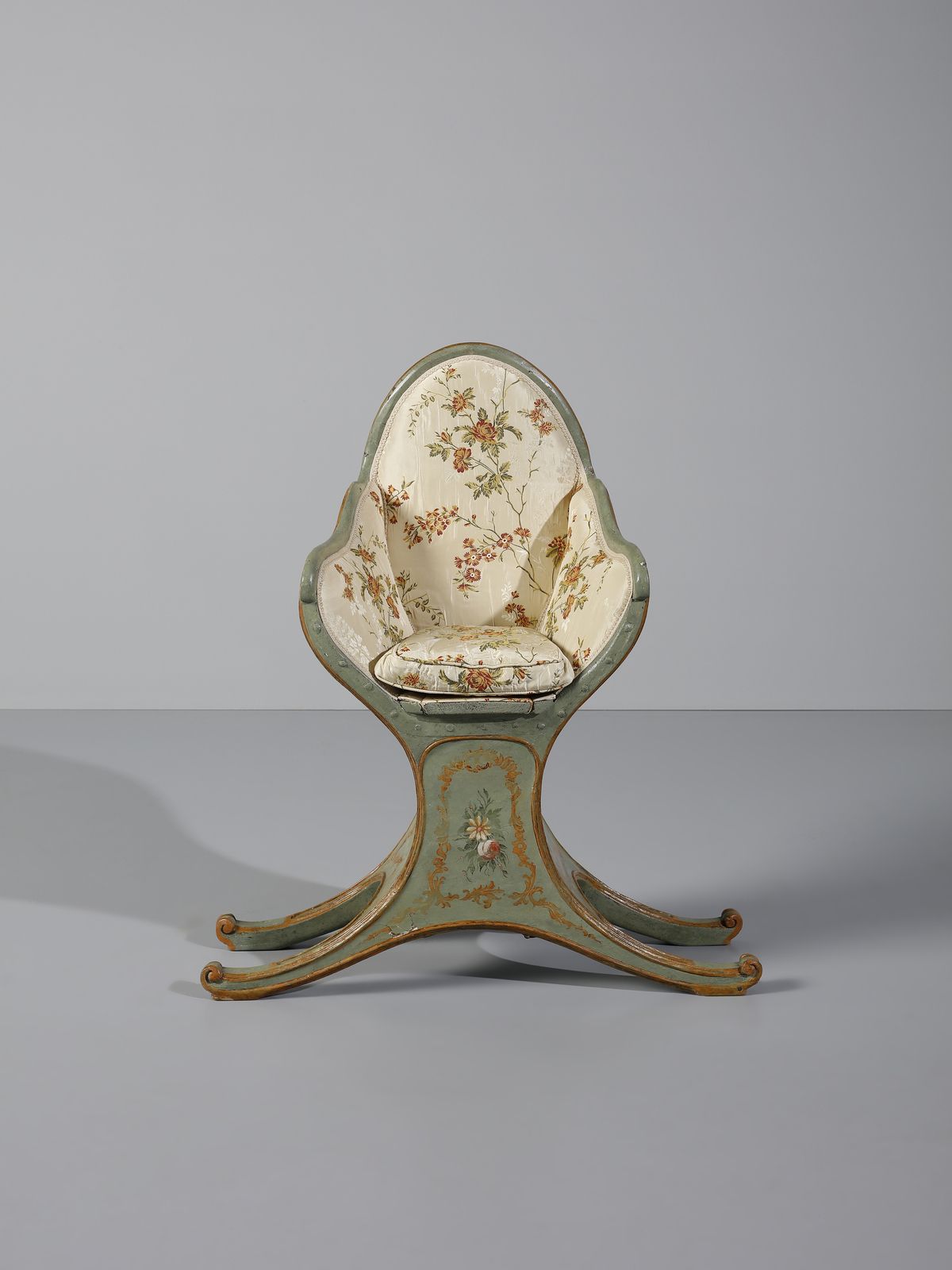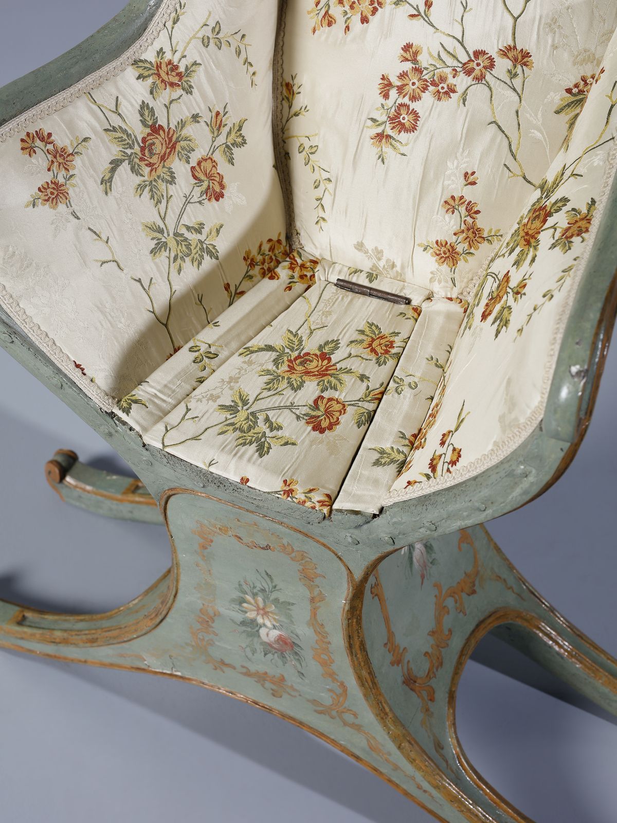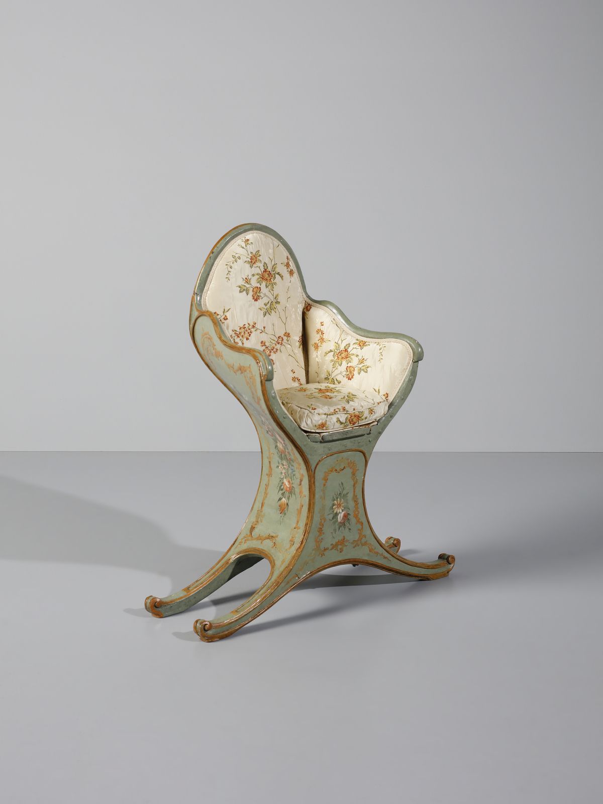 Rara sedia da gondola in legno laccato e parzialmente dorato con decorazioni policrome [..]