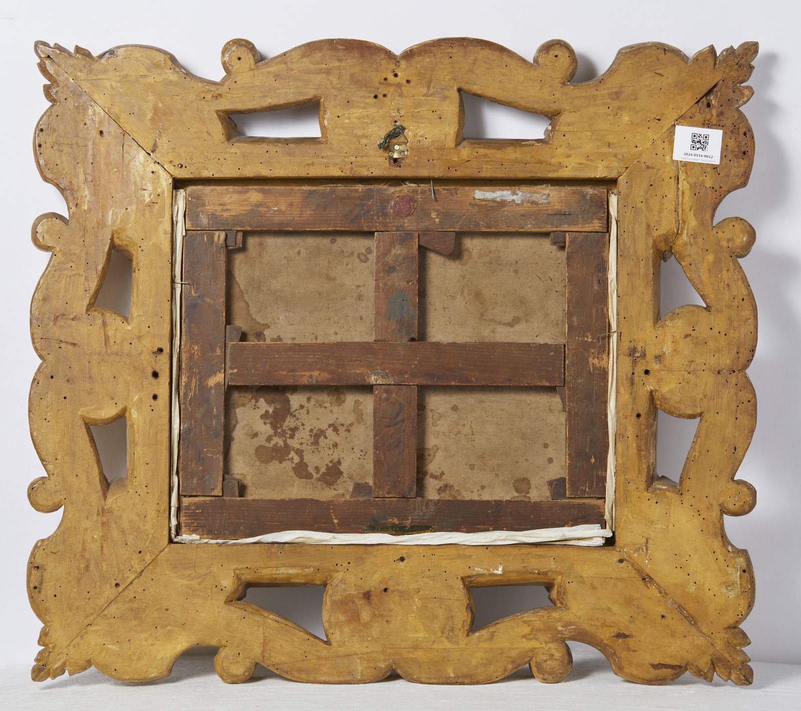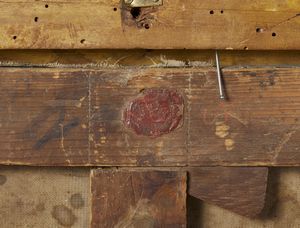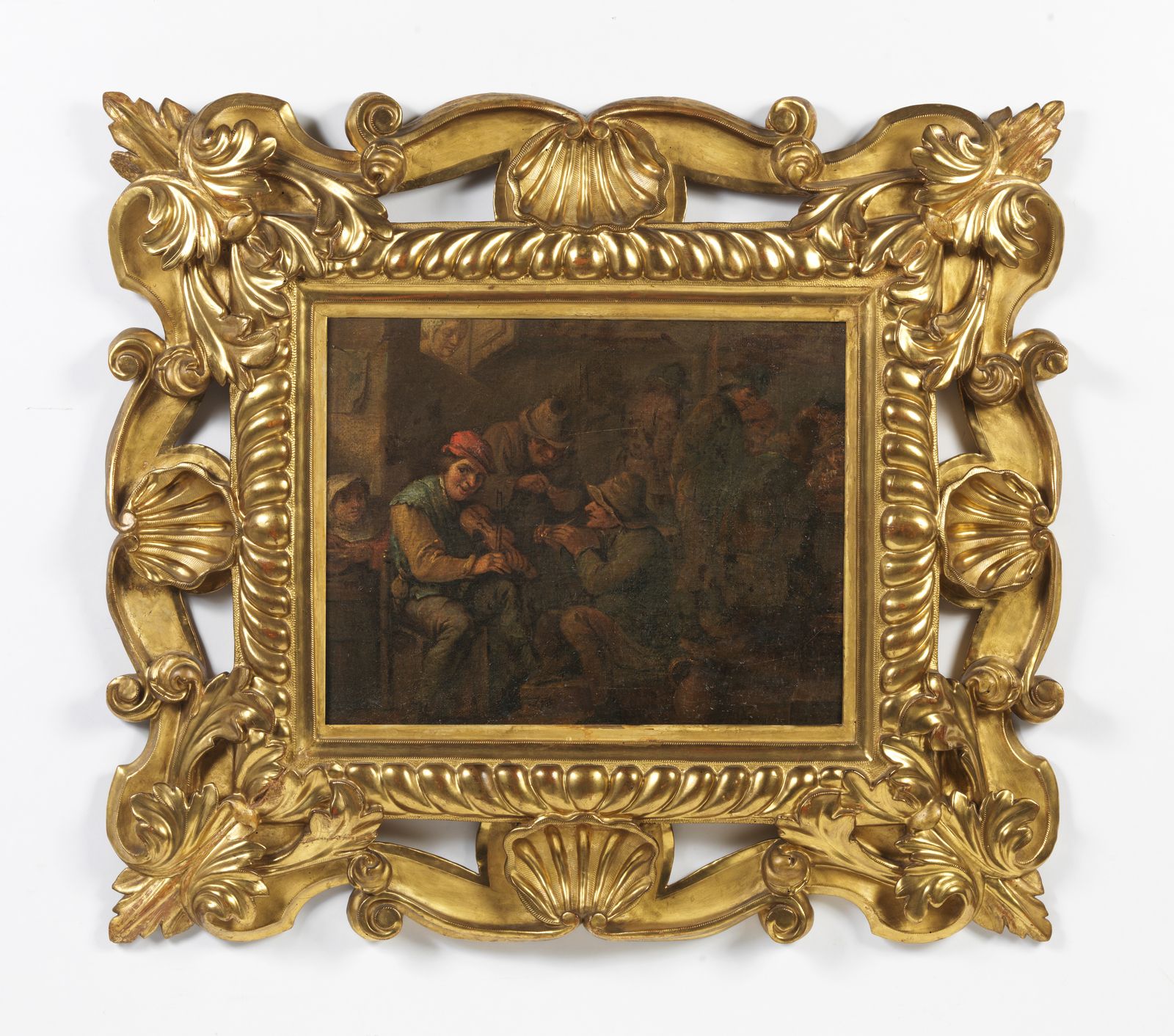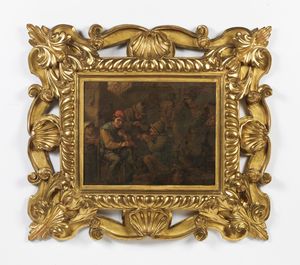 Scena di interno con personaggi, in cornice intagliata a motivi fitomorfi e a conchiglie [..]