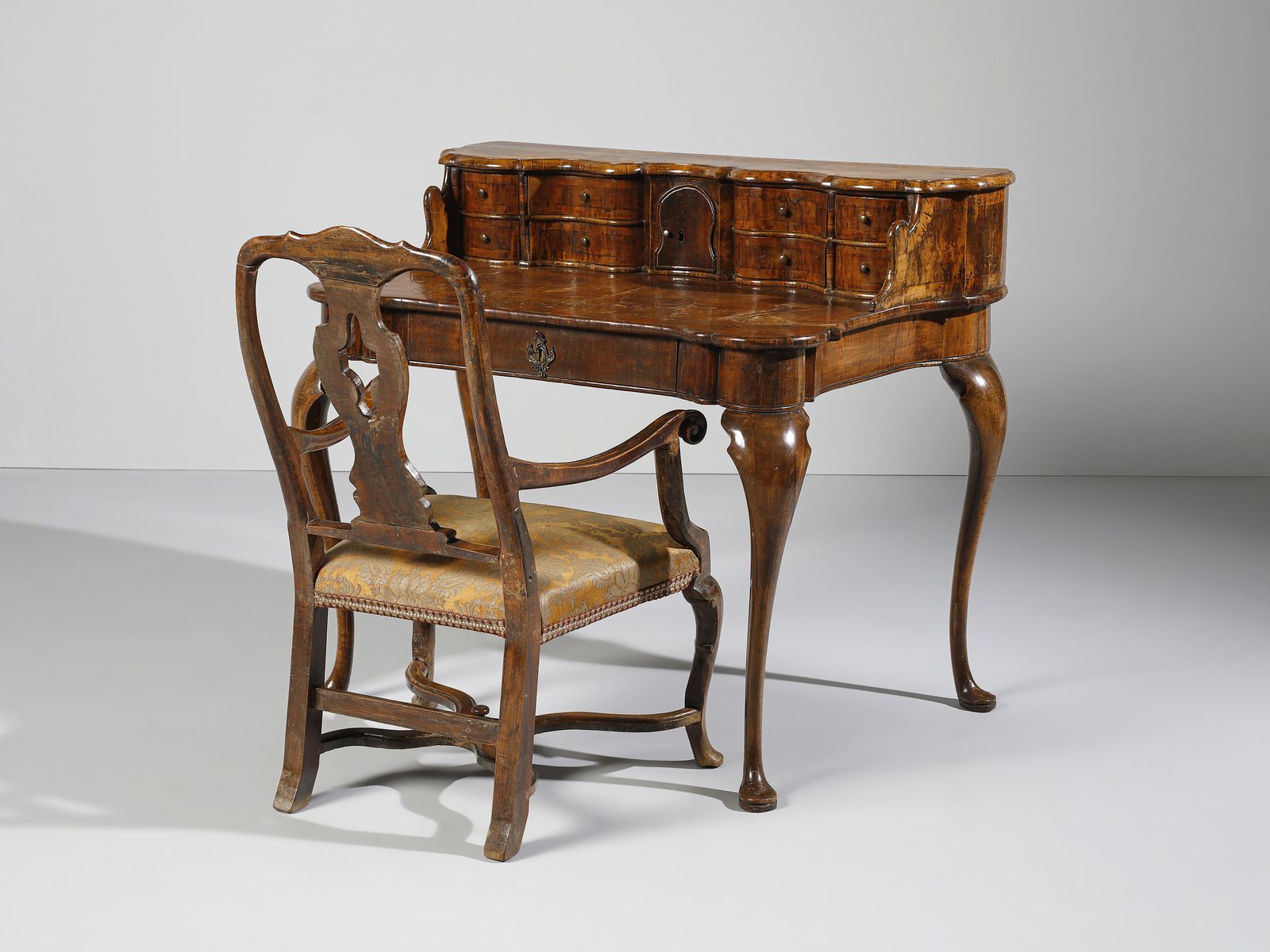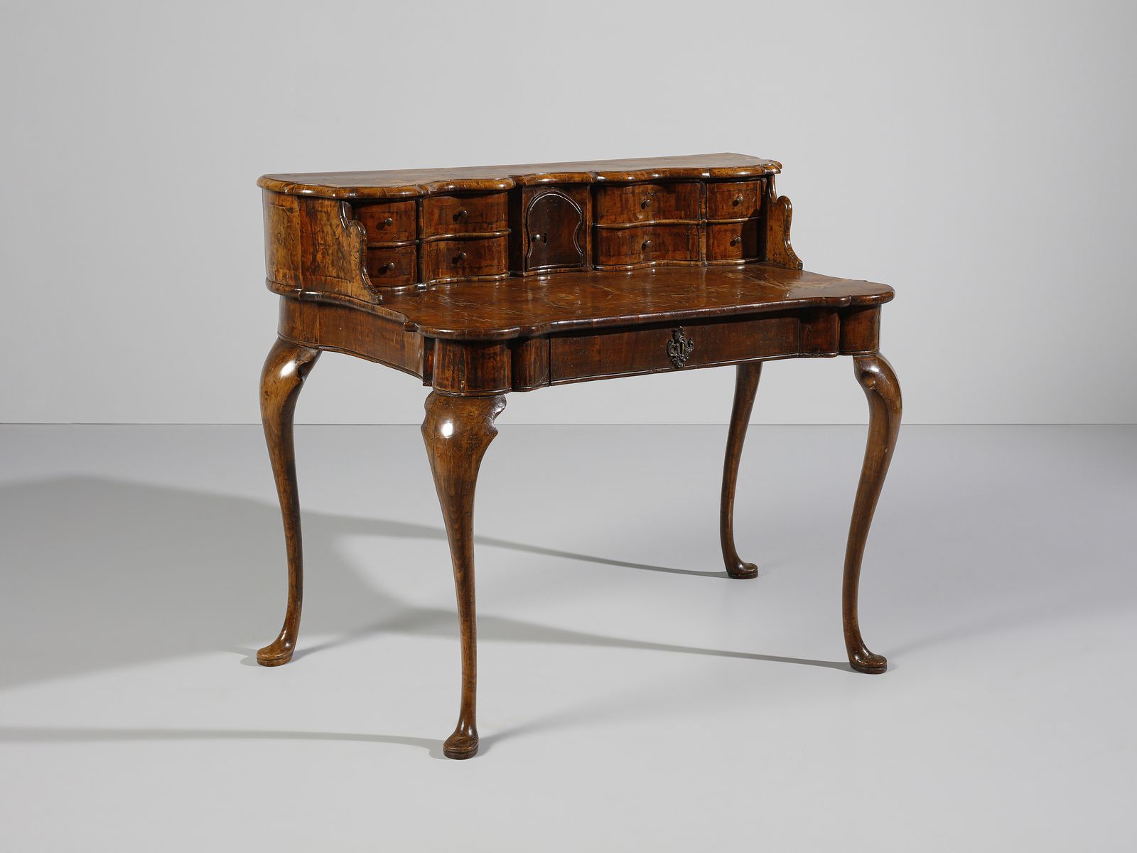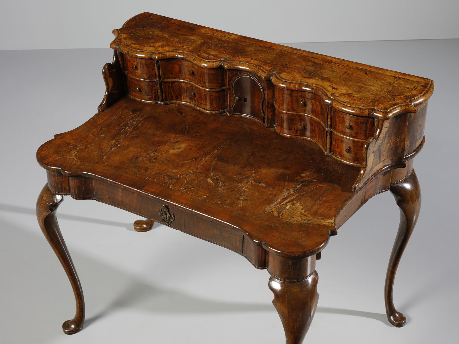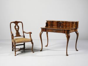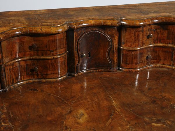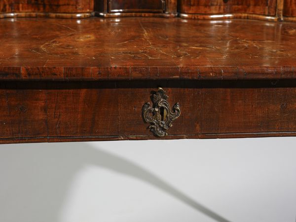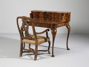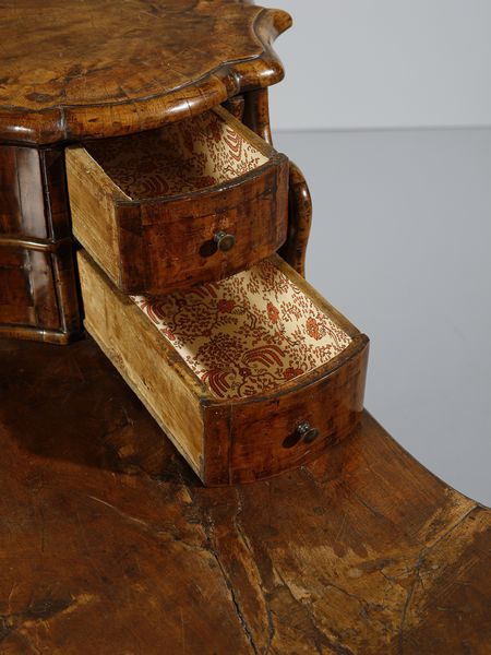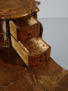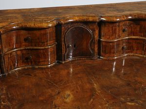 Scrittoio con piccola alzata lastronato in noce e radica di noce, cassettini e vani [..]