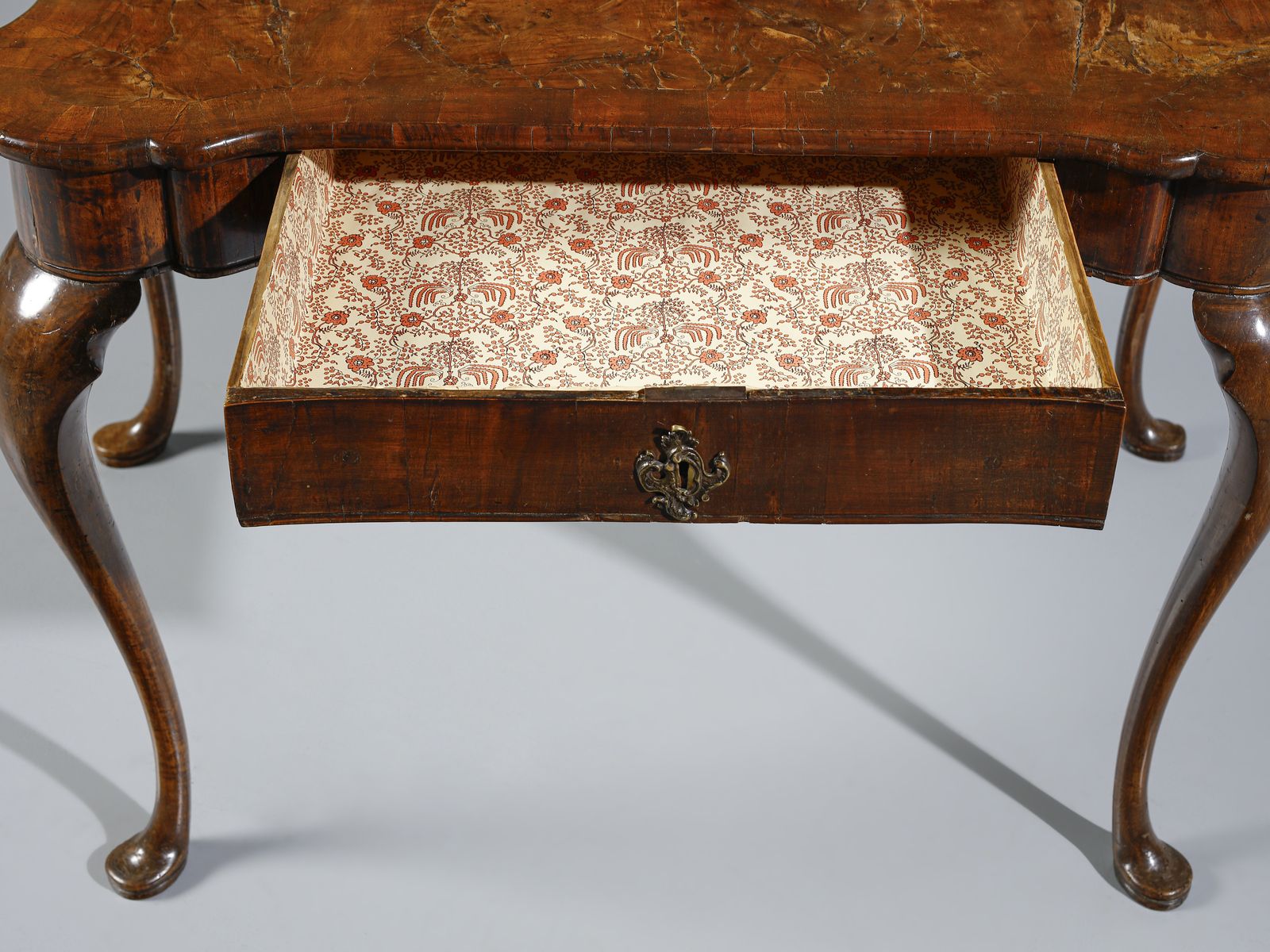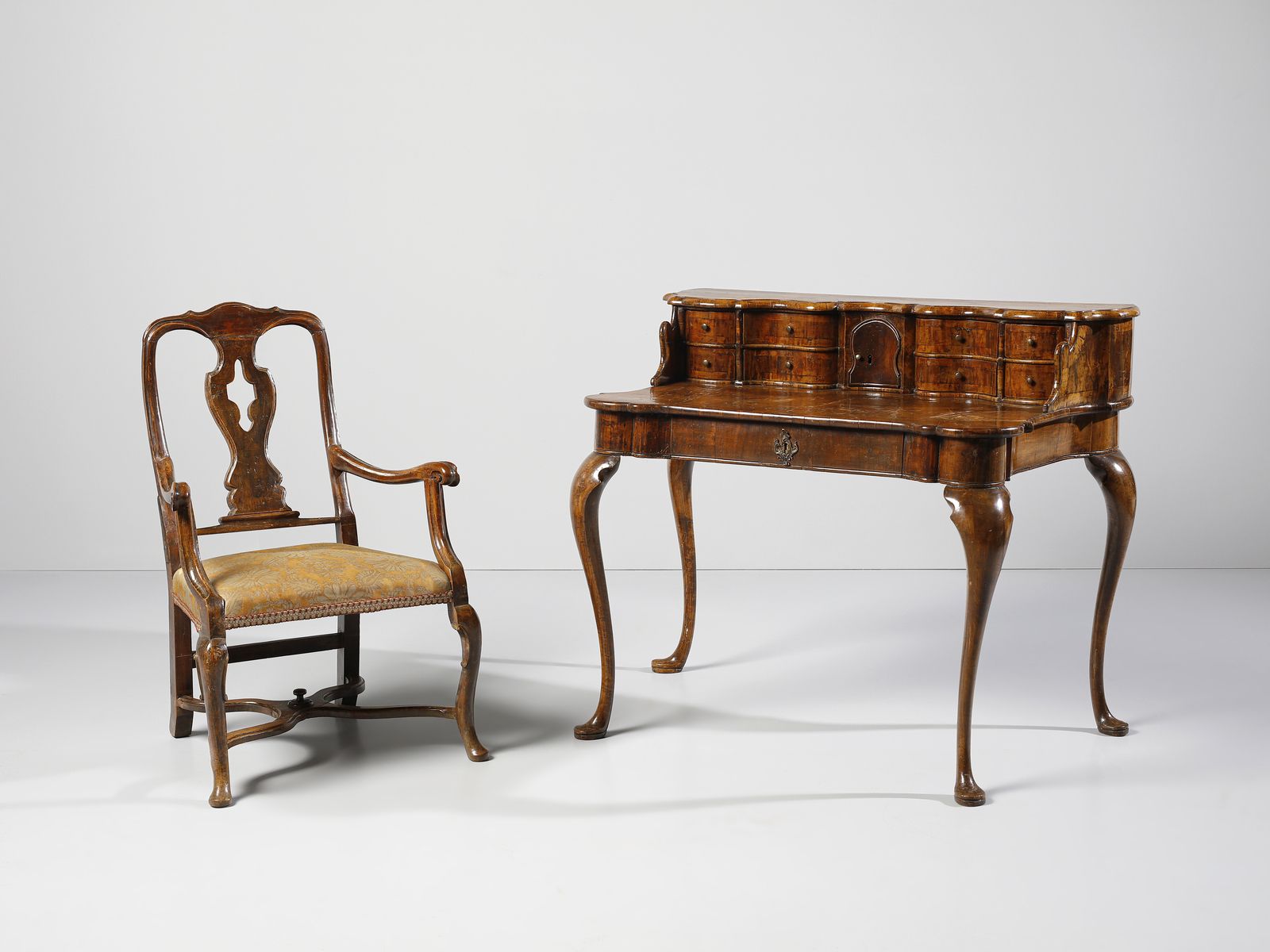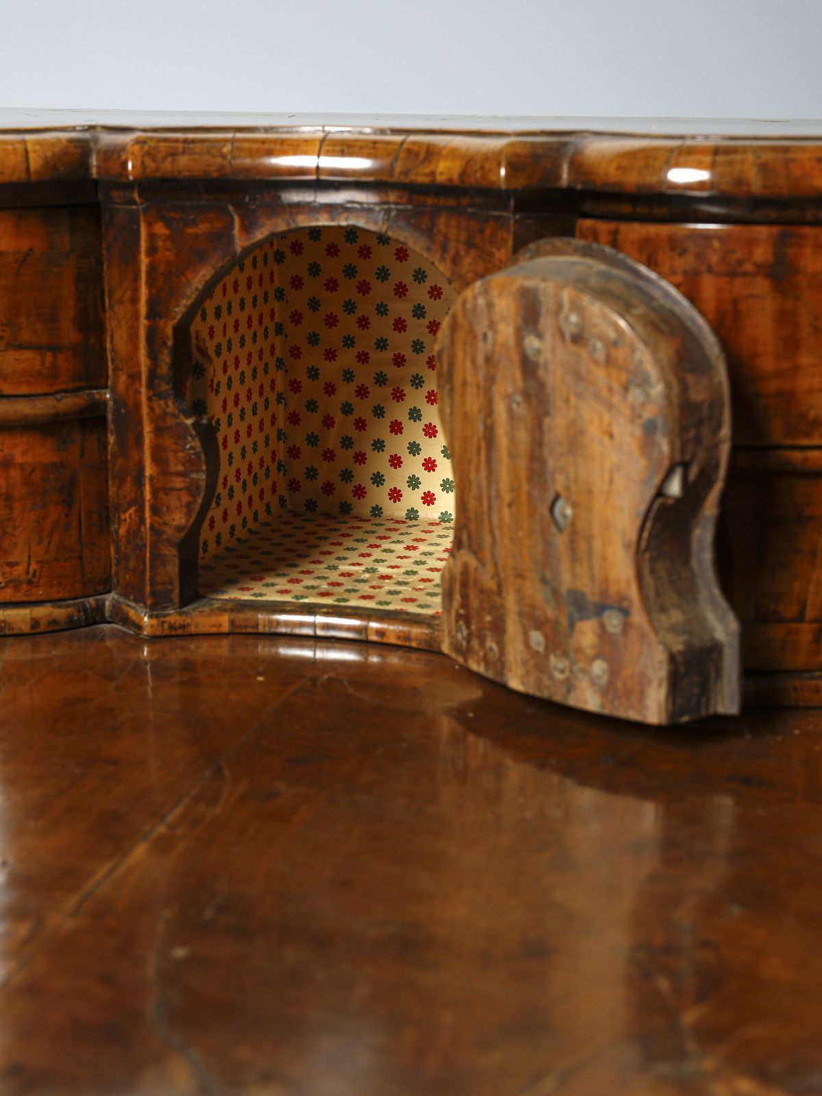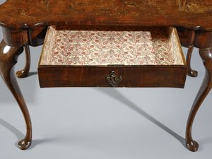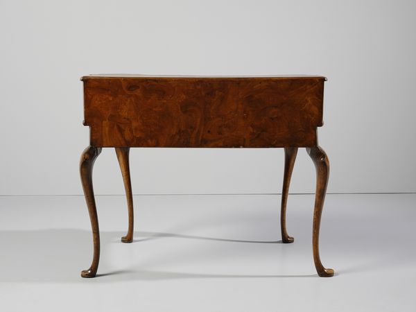 Scrittoio con piccola alzata lastronato in noce e radica di noce, cassettini e vani [..]