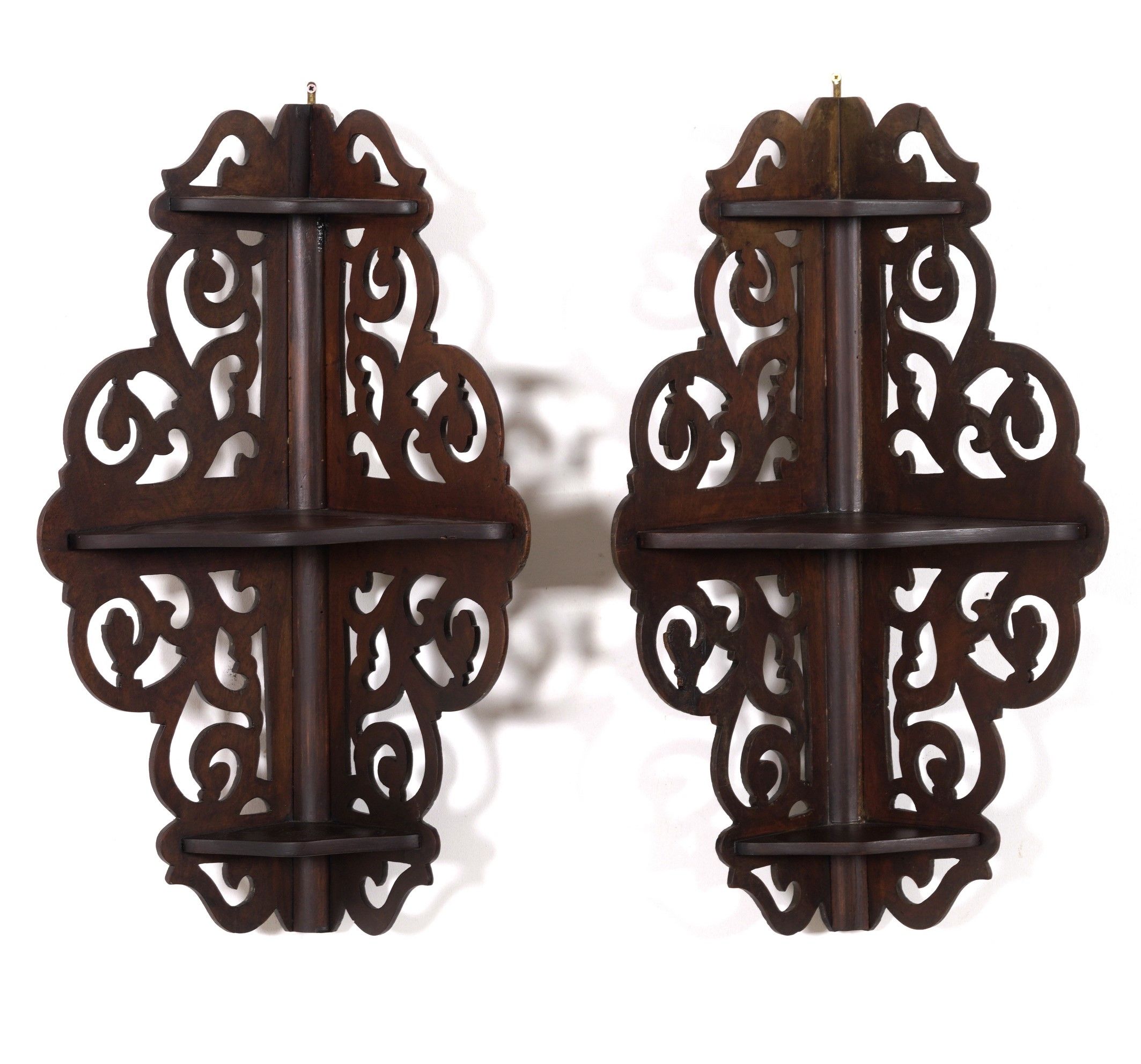 Coppia di mensole angolari in noce intagliato e traforato. XX secolo