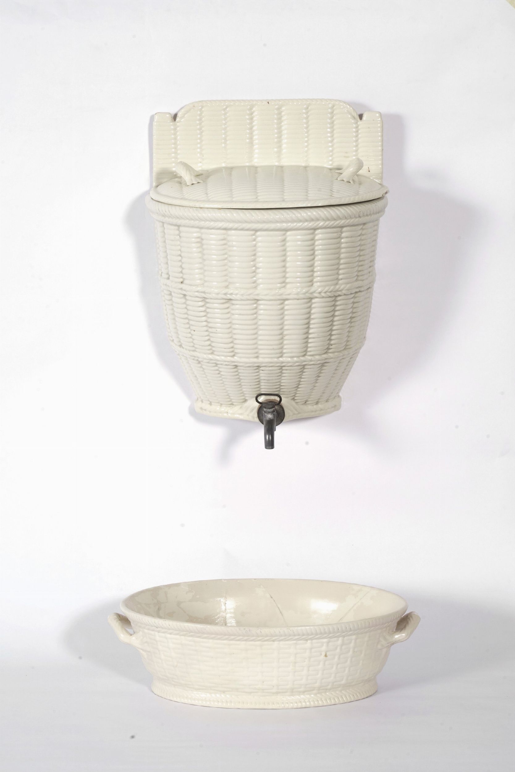 Lavamani e bacinella in ceramica smaltata bianca in forma di un cesto di vimini. [..]