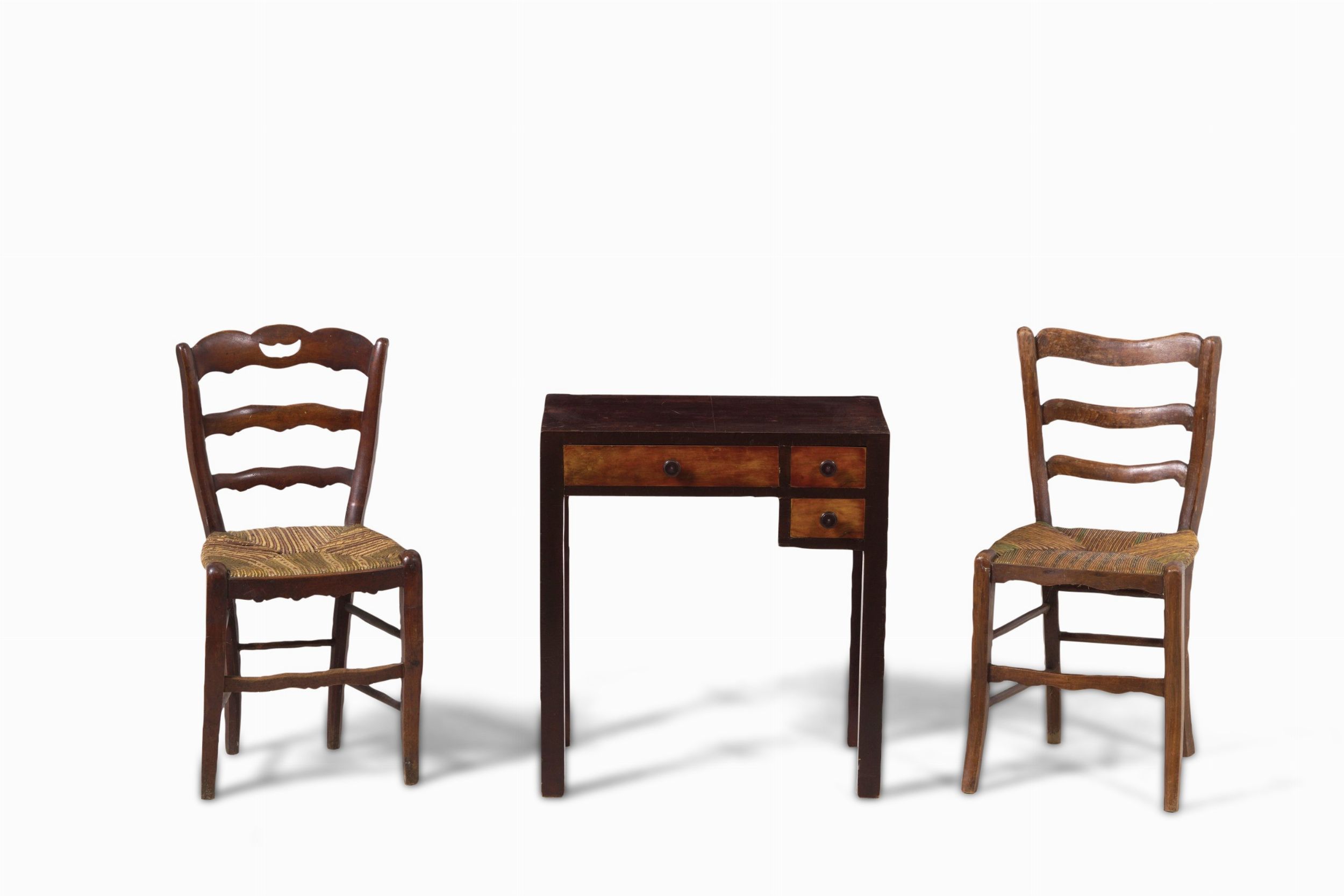 Lotto composto da un piccolo scrittoio e due sedie impagliate. XX secolo