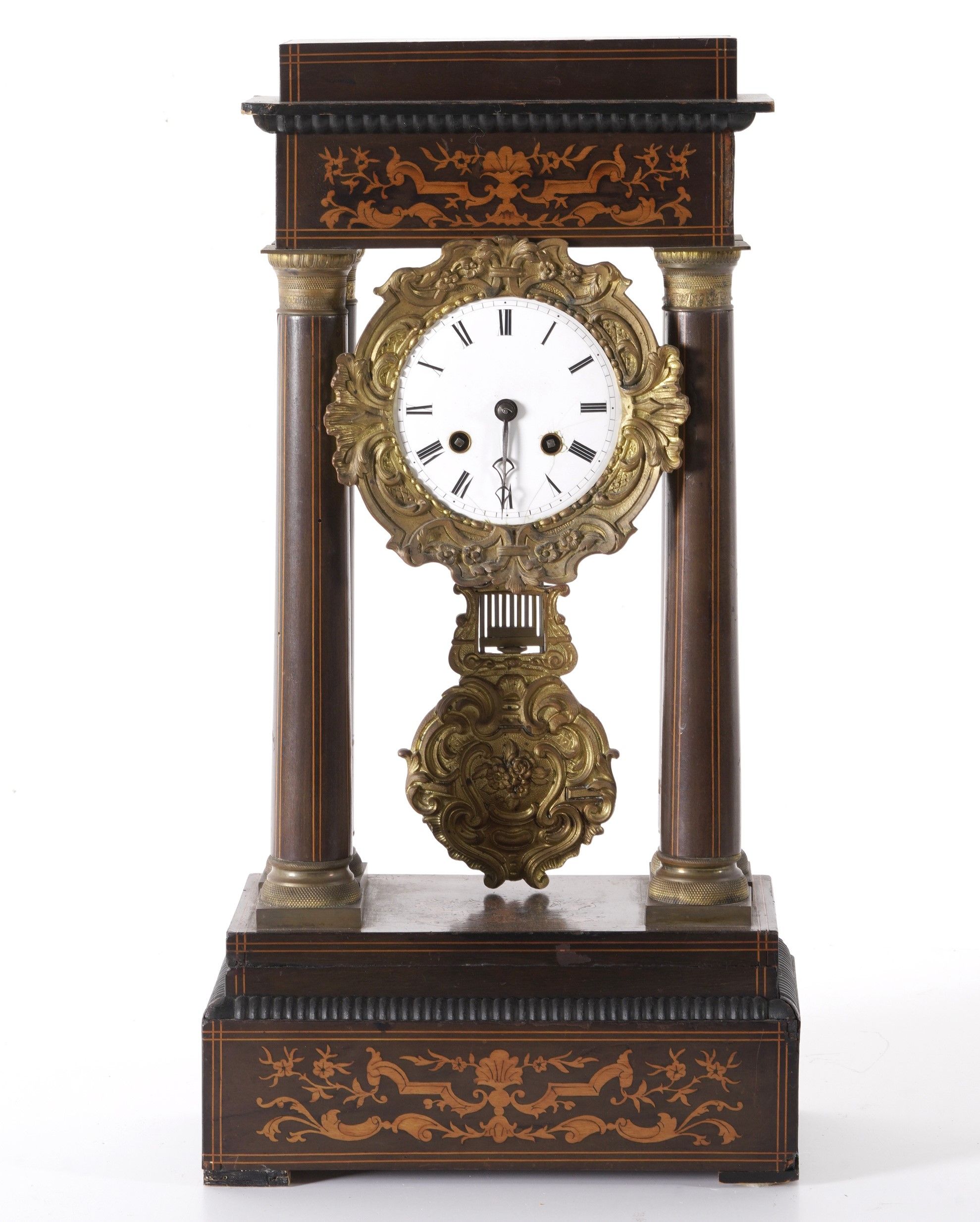 Pendola a portico Carlo X lastronata e intarsiata. XIX secolo