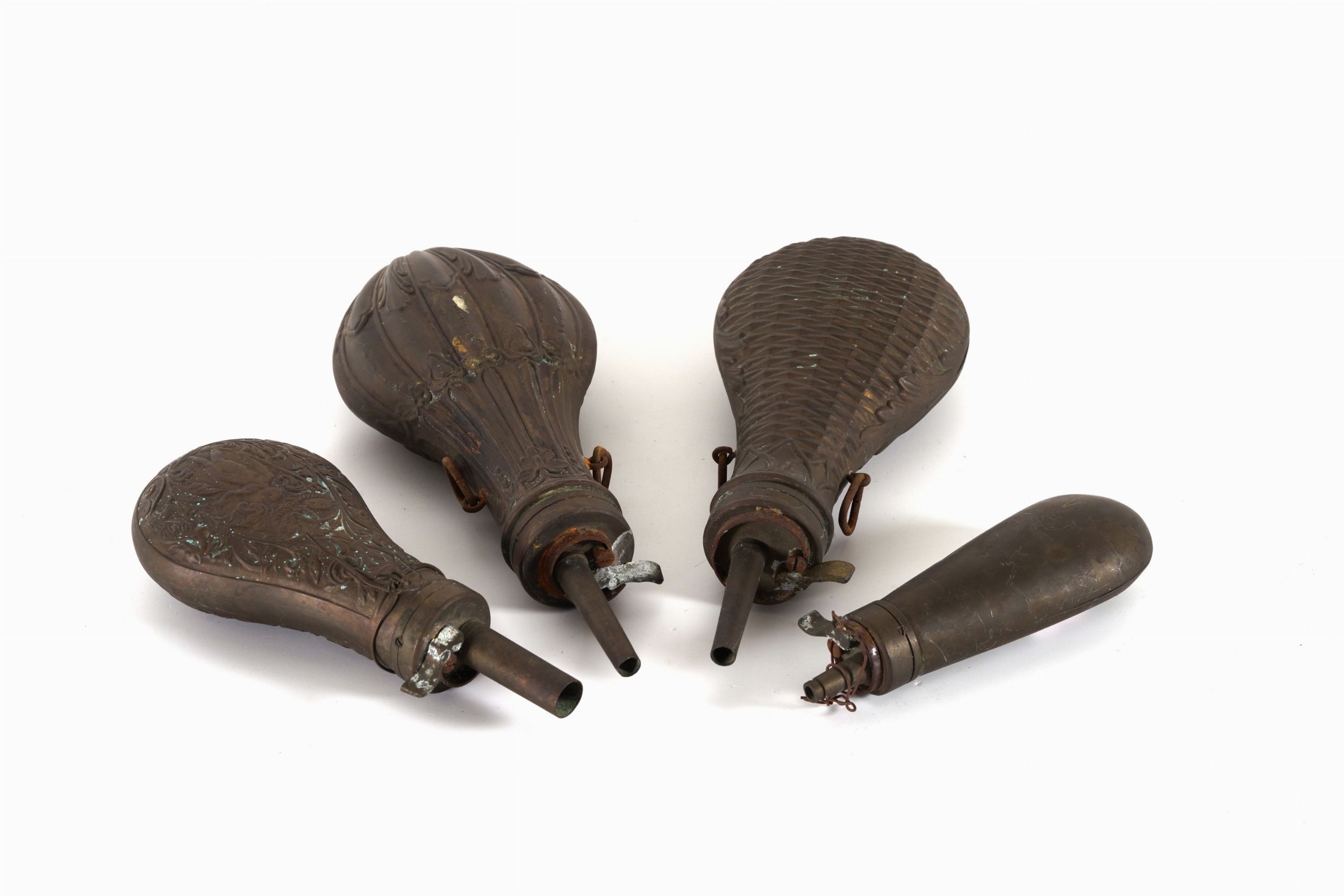 Quattro fiasche da polvere da sparo in rame sbalzato e metallo. XIX-XX secolo