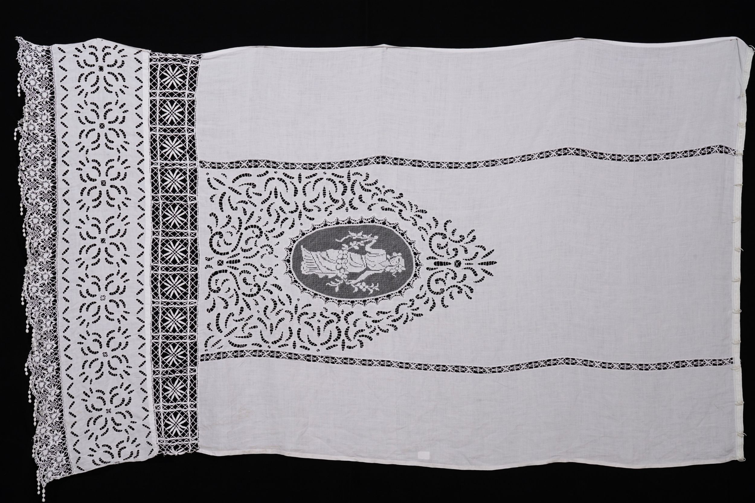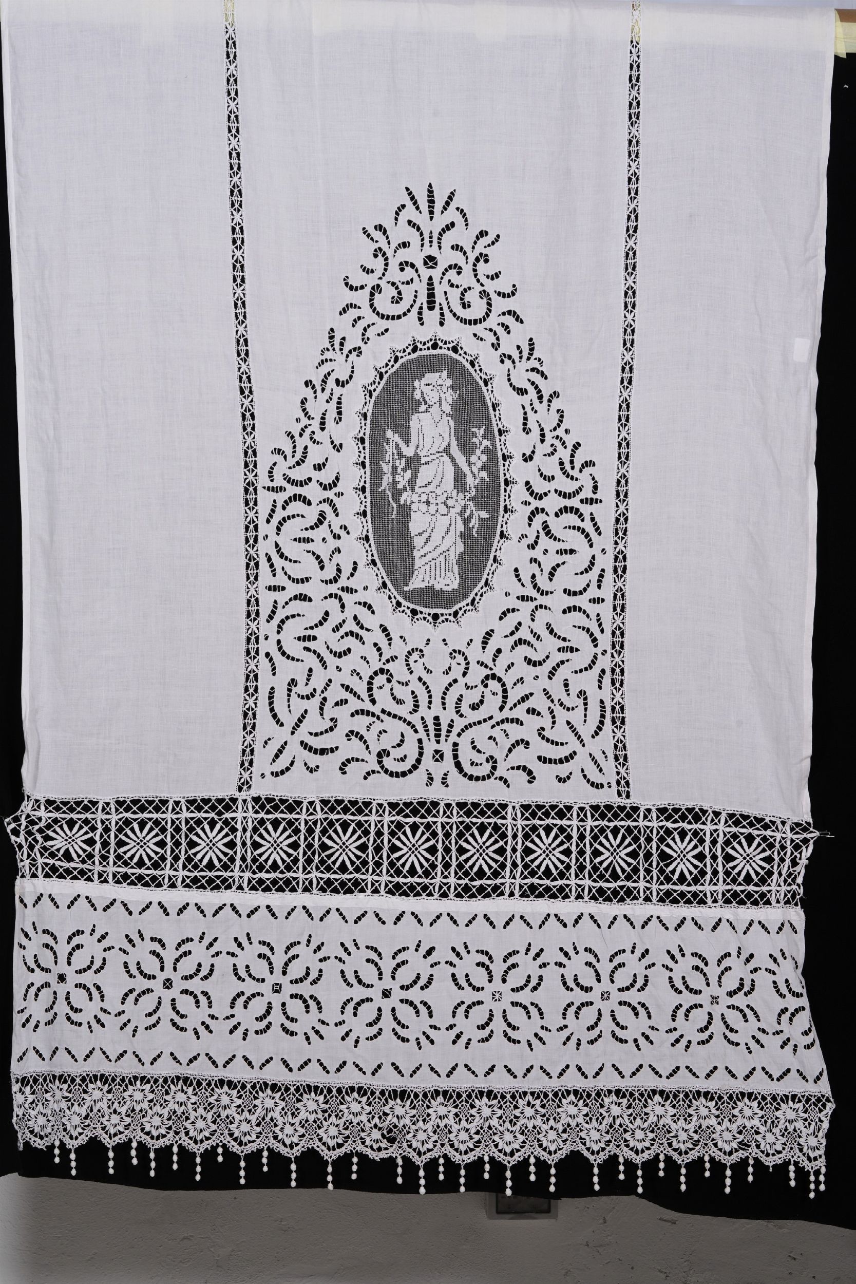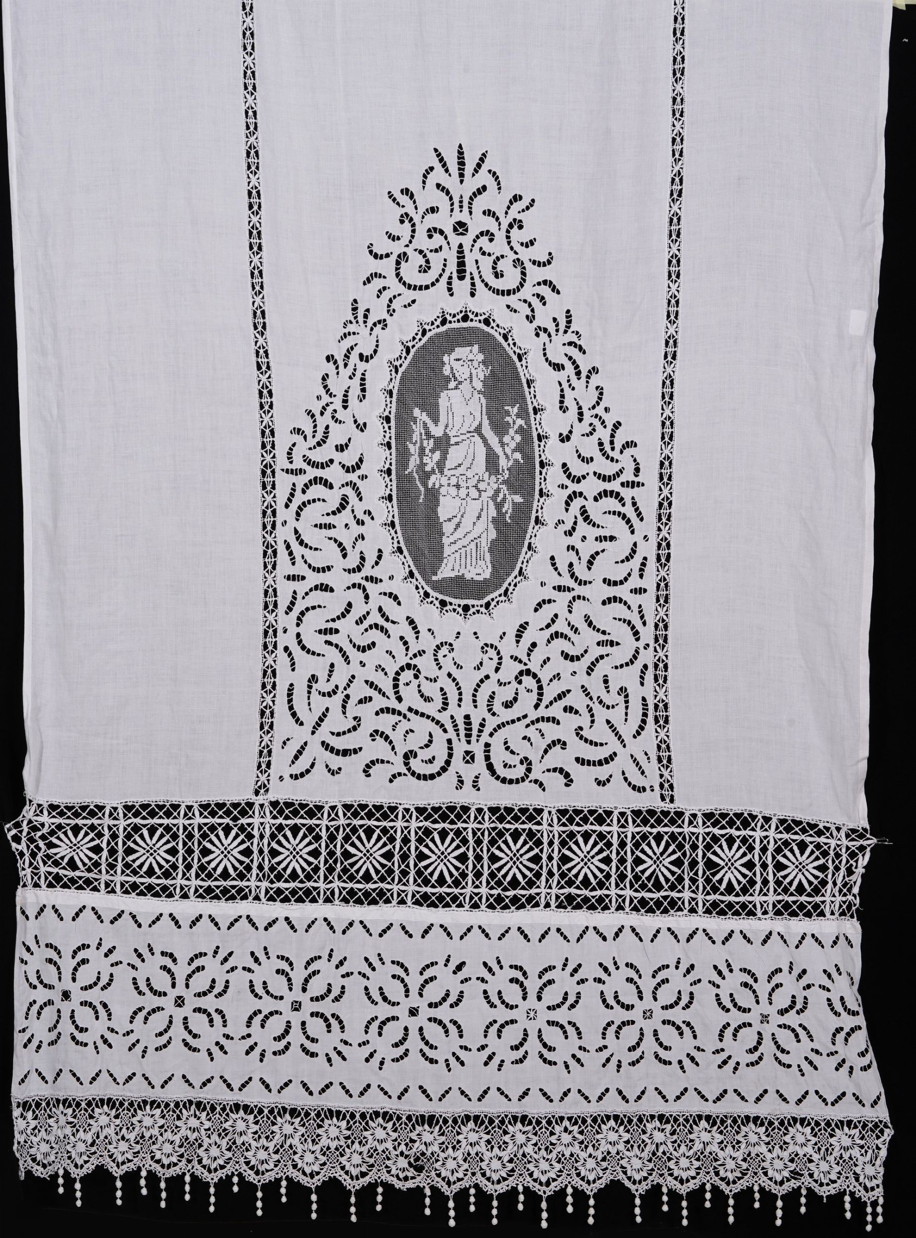 Tenda ricamata con figura femminile entro ovale frangia con decori geometrici