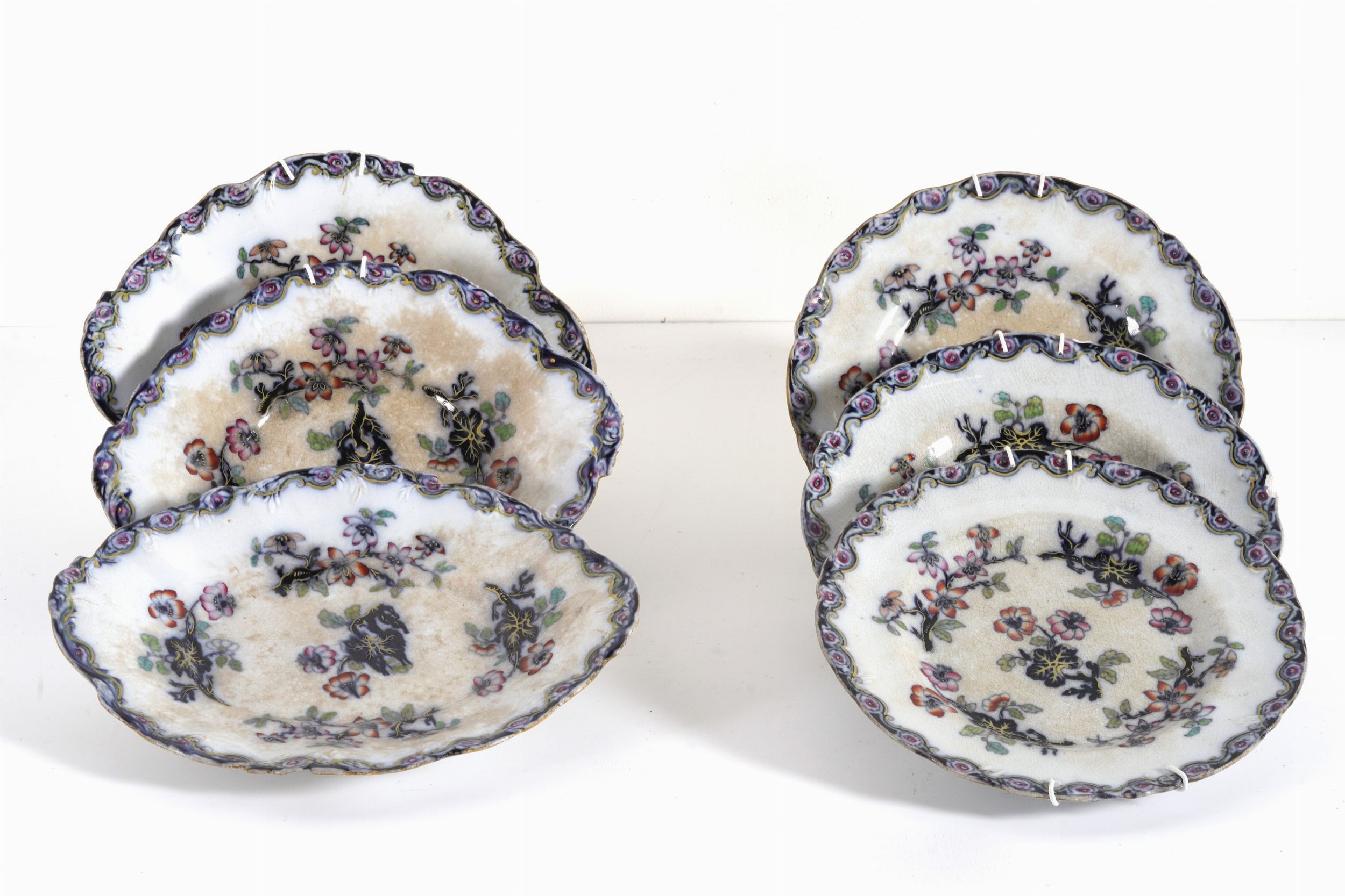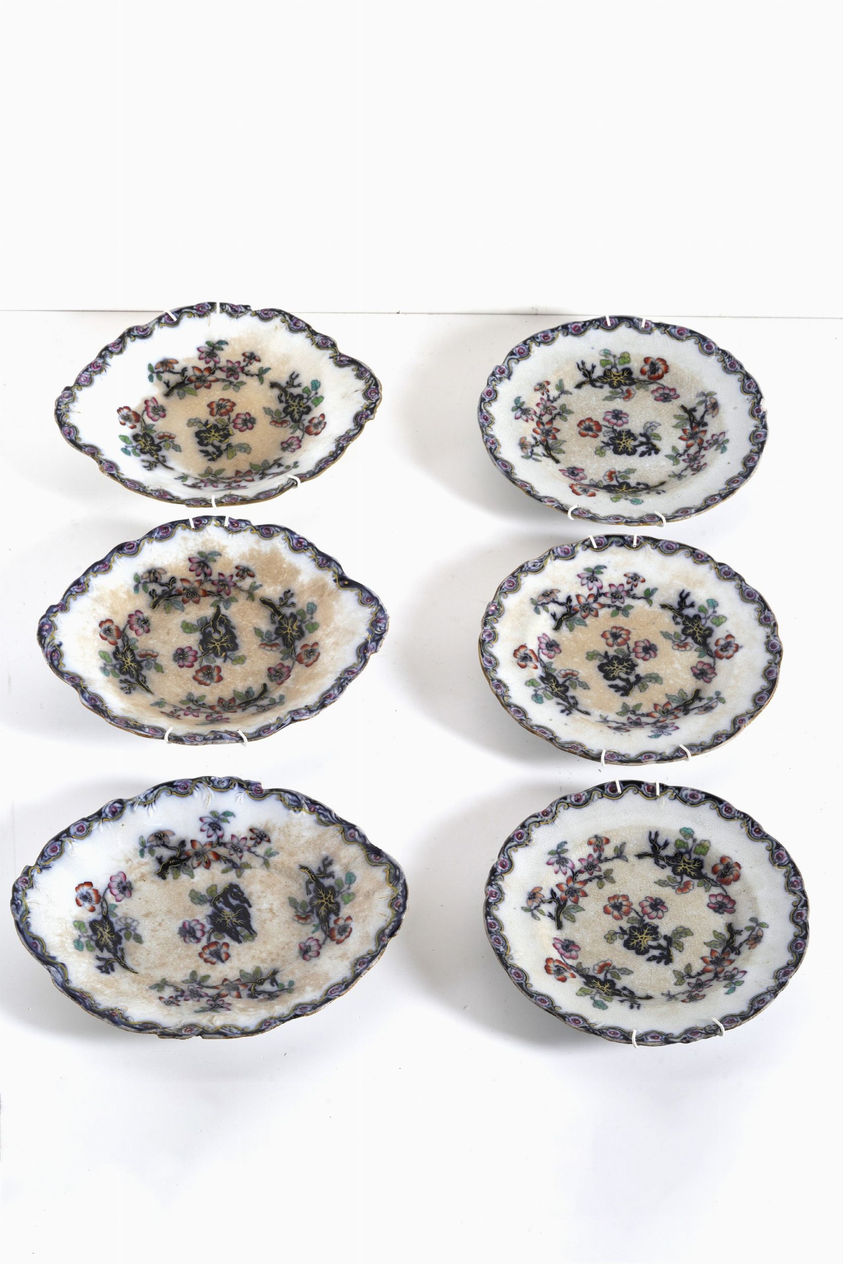Tre vassoi e tre piatti con decoro a decalcomania. XIX secolo