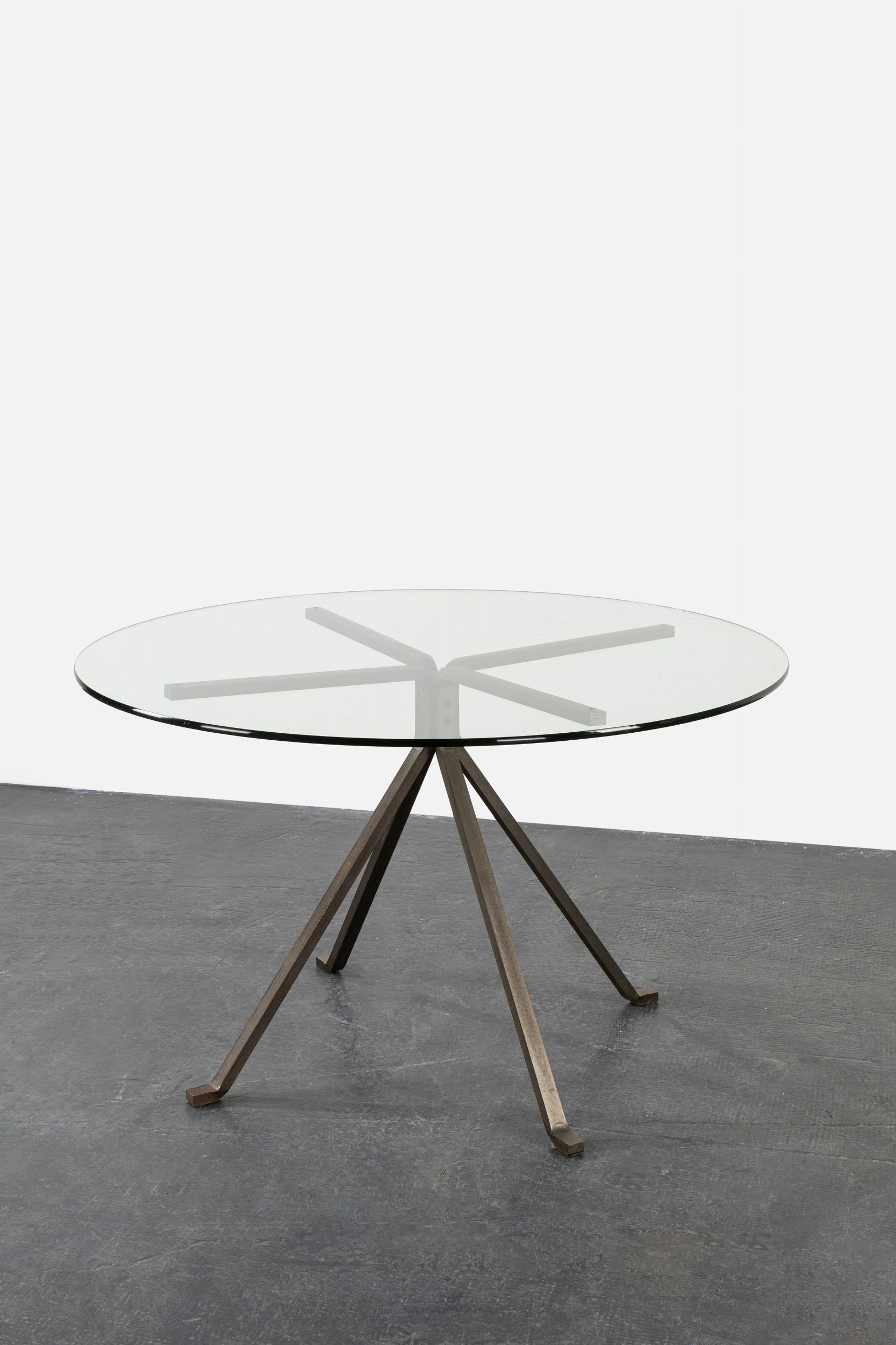 1973 Tavolo da pranzo in ferro piegato con piano in vetro cristallo. Produzione Driade
