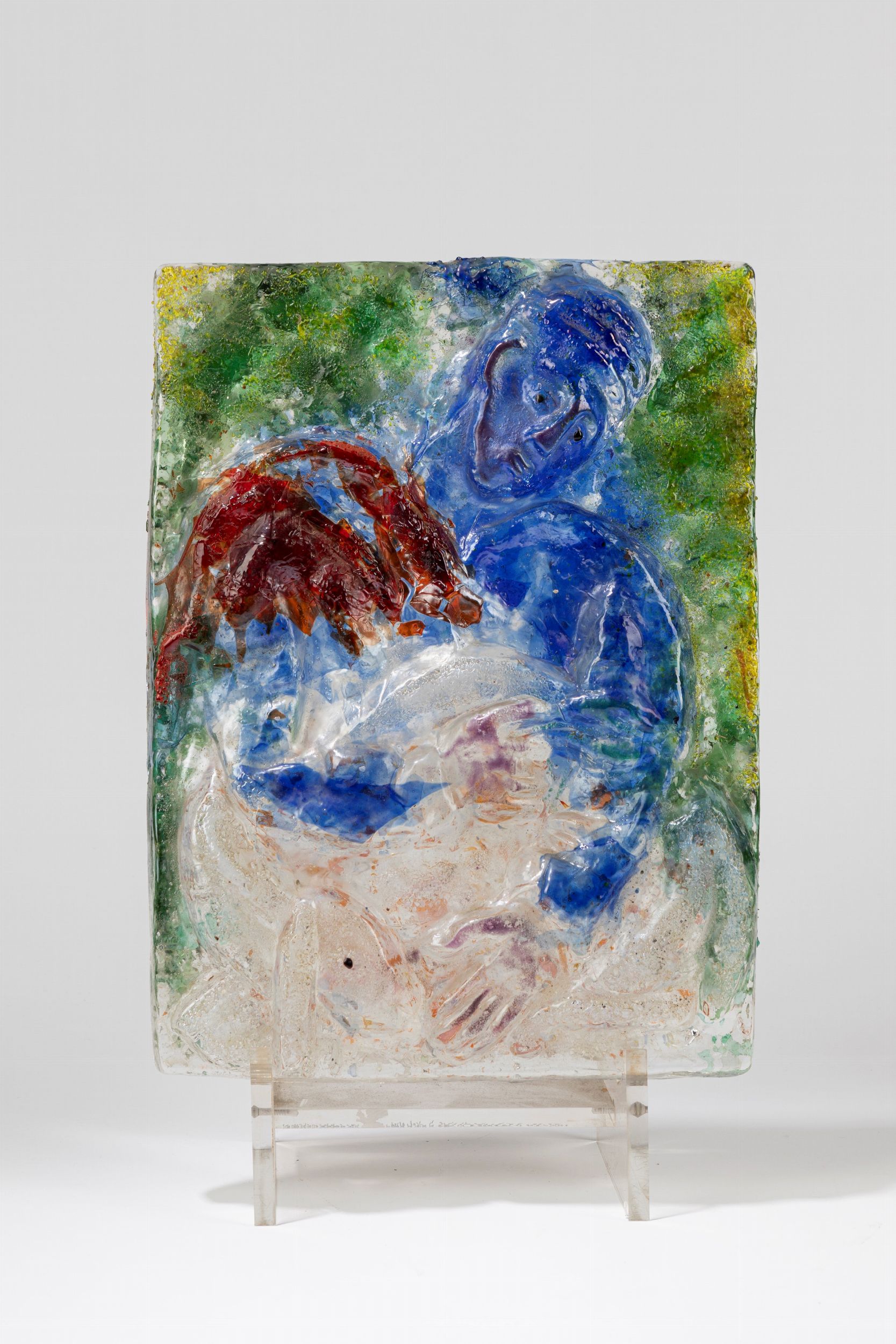 1970 bassorilievo in cristallo trasparente con colori soffiati sovrapposti o granulosi verde-bleu-acquamare-rosso-ametista-opalino bianco. Produzione Fucina degli Angeli, Venezia Inciso sulla base: R. Rubin - Egidio Costantini 1970 - p.a. © 1/1 e.u.c. - Fucina degli Angeli Venezia.