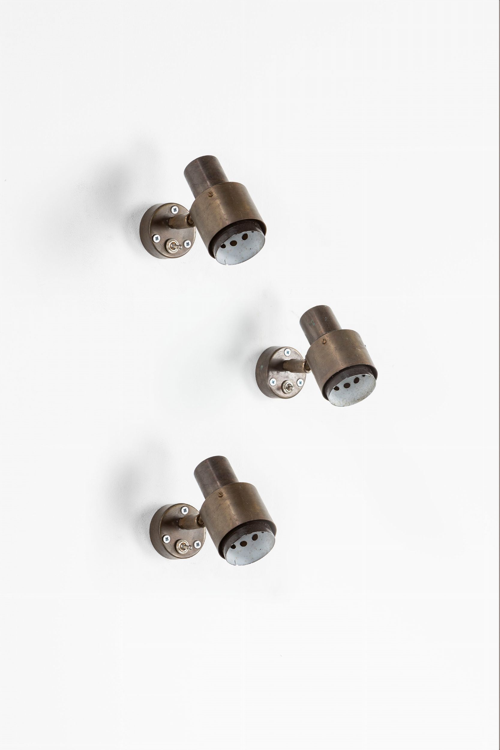1960 ca. Serie di tre lampade spot in metallo da parete, prodotto per gli arredamenti dell'Hotel Parco dei Principi Roma. Produzione Arredoluce Monza