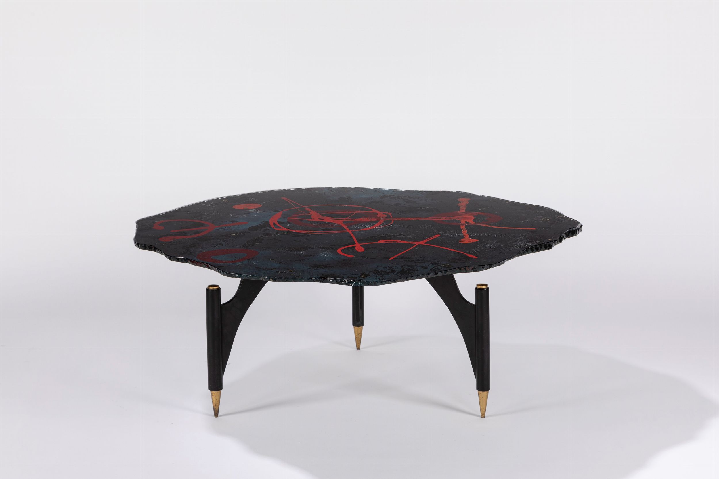 1955 ca. in vetro di grosso spessore retrodipinto con bordo scalpellato, base in metallo verniciato nero e dettagli in ottone. Produzione Fontana Arte Firmato