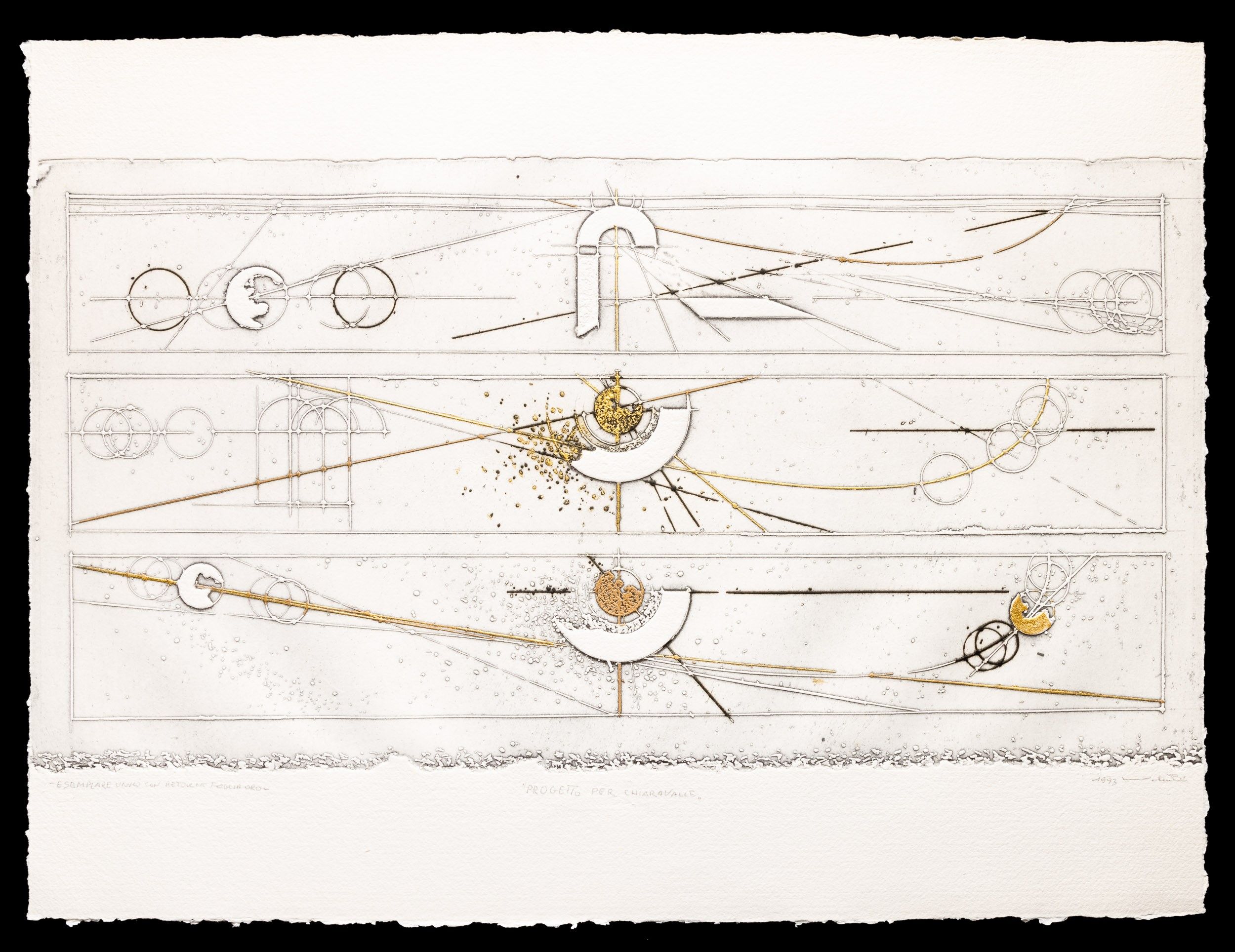 acquaforte con retouche con foglia d'oro, Largh. 98,5 - Alt. 74 Cm 1993 es. unico firmato e datato in basso a destra, intitolato in basso al centro e numerato in basso a sinistra tiratura 50 + XV + 2 p.a + 1 esemplare unico carta Colombe stampatore Sardella, Milano ed Colophon, Belluno